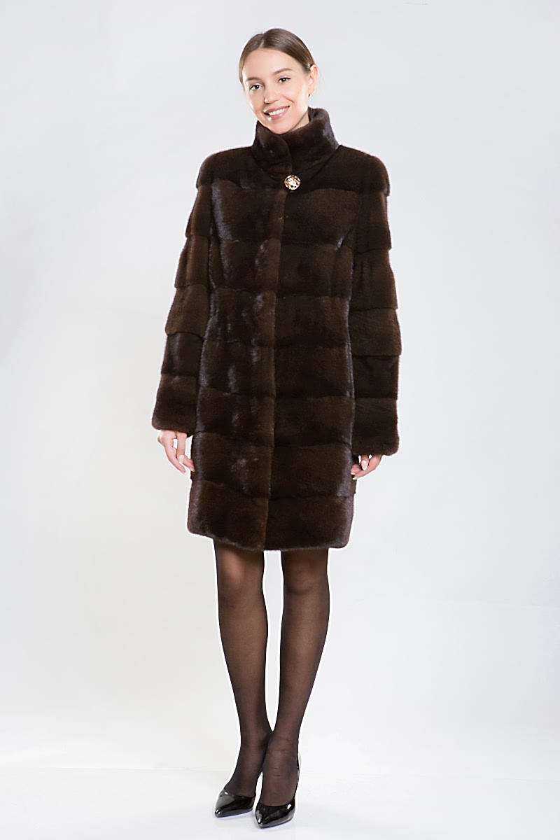 Участвующая в акции норковая шуба имеет классическую длину Pin-Up - до колена. Она отшита по технологии поперечной выкладки пластин, что придает ей благородный вид, смотрится дорого и стильно. Ее отличает:
