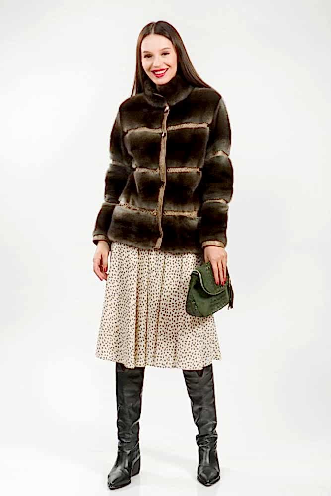 Обратите внимание на пошив этой модели, который выполнен с использованием не только натурального меха норки высокого качества, но и натуральной кожи питона, которая используется для декорирования. Куртка имеет прямой фасон и воротник стойка, отшита по технологии пластины с добавлением роспуска. Такое исполнение Pin-Up