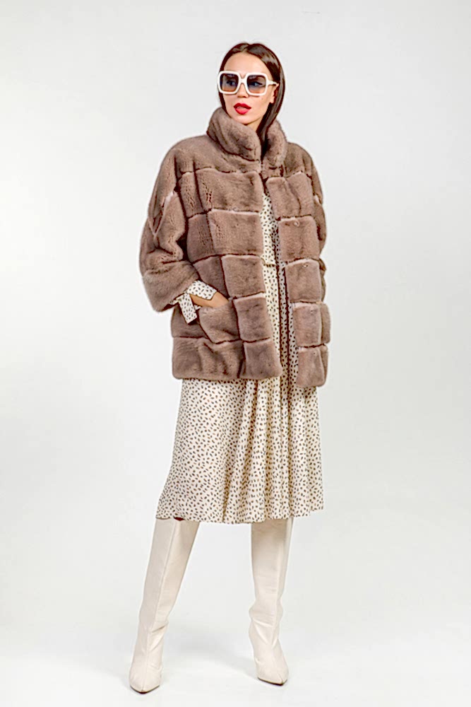Деми куртка из меха норки Pin-Up античная латунь имеет классическую укороченную длину до середины метра, что делает ее подходящей для автоледи. Ее отличает: