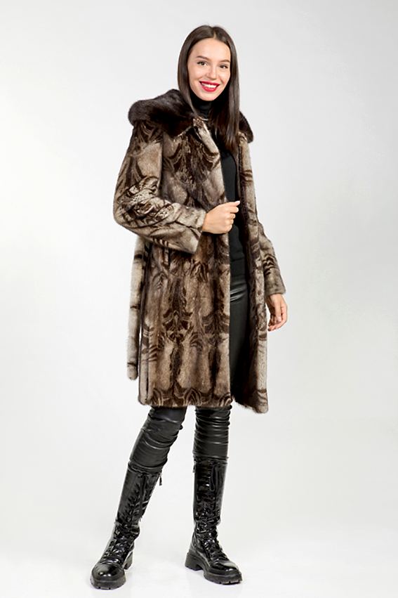 Pin-Up леди в выборе норковых изделий отдают предпочтение оригинальным моделям. Неординарный фасон, цвет, комбинирования материалов позволяют придать образу выразительность, сделать его уникальным. Норковая шуба, участвующая в данной акции, относится к такой категории. Ее изюминкой являются принты, расположенные на всем изделии. Есть у этого полупальто и другие достоинства: