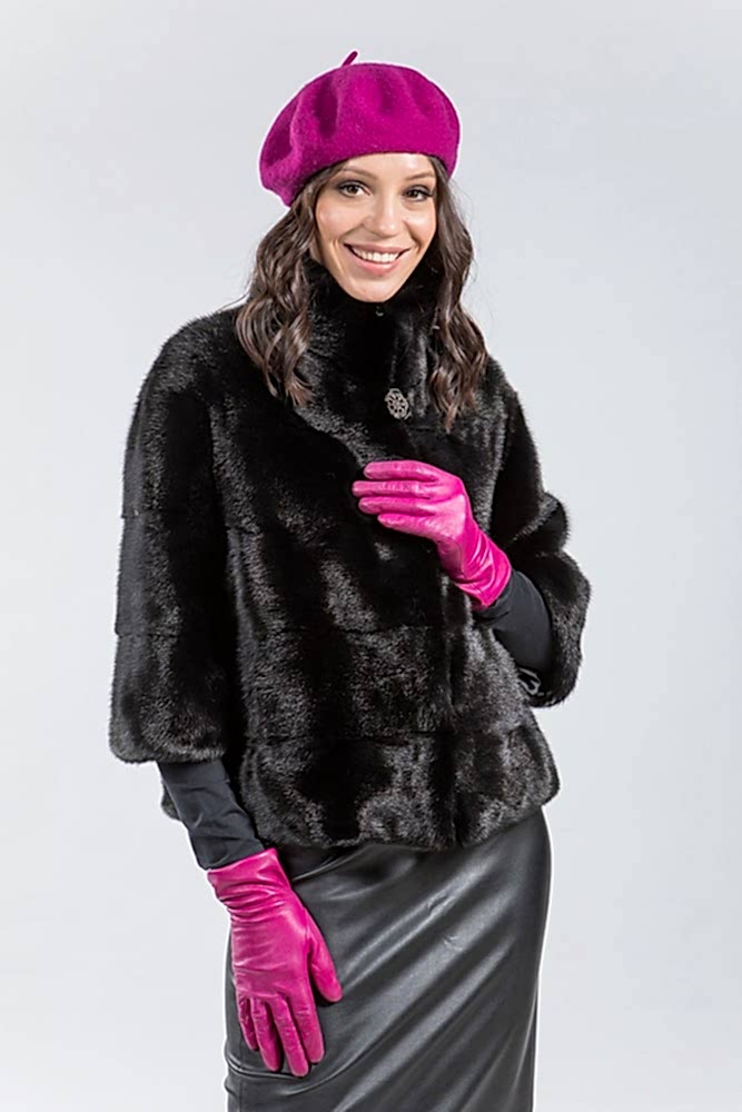 Участвующая в акции куртка выполнена из Pin-Up меха норки, красоту и гладкость которого подчеркивает изящный крой - поперечная выкладка пластин, который, к тому же, добавляет изделию объема. Также нужно отметить:
