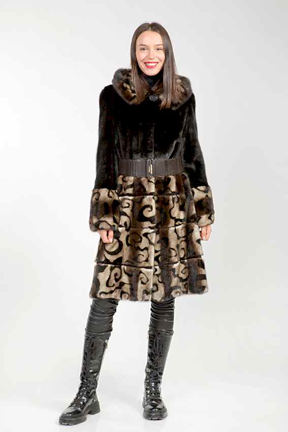 В нашей компании вы можете сделать невероятно выгодную покупку норковой шубки с эксклюзивным дизайном, позволяющим создать неповторимый лук! Очередная осенняя акция предлагает невероятную скидку на оригинальное полупальто, в котором сочетается Pin-Up в благородном шоколадном тоне и светлом бежевом оттенке с уникальными принтами. Эффектная модель арт. 3817 размер 46-48 дополняется широким кожаным поясом для подчеркивания линии талии, комфортным капюшоном с принто
