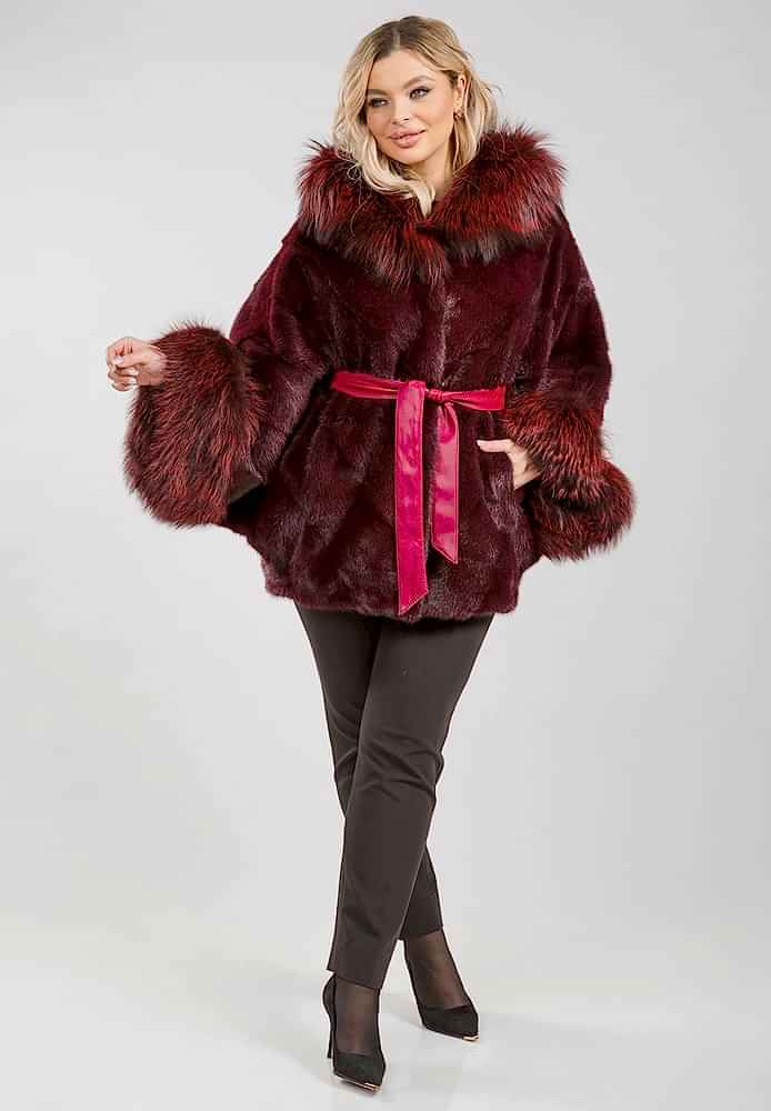 Бордовая куртка-пончо из меха норки, на которую весь май действует хорошая скидка, имеет прямой силуэт под пояс, который идет в комплекте, и отшита по технологии пластины с добавлением роспуска. Pin-Up и рукава декорированы роскошным мехом лисы, окрашенным в тот же оттенок, что и куртка.