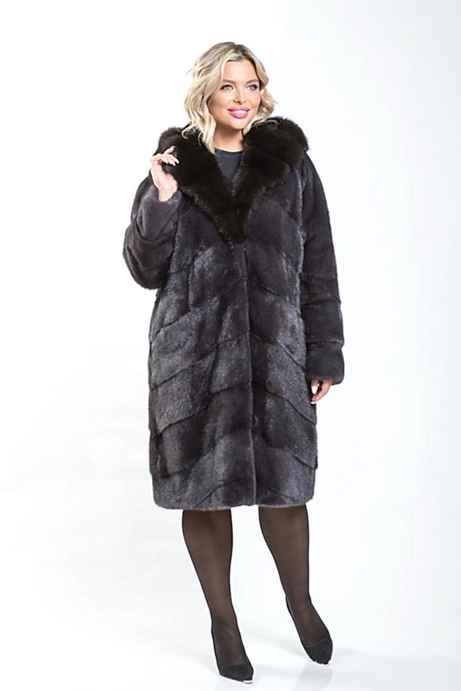 Полупальто из меха норки этой модели отшито по технологии диагональной выкладки пластин. Производителем предусмотрена возможность самостоятельной коррекции изделия на талии, по низу и на рукавах, которые можно трансформировать в укороченные. Также нужно отметить изысканное декорирование капюшона тонированным мехом куницы. Эта модель добавит вам солидности и подчеркнет вашу успешность.