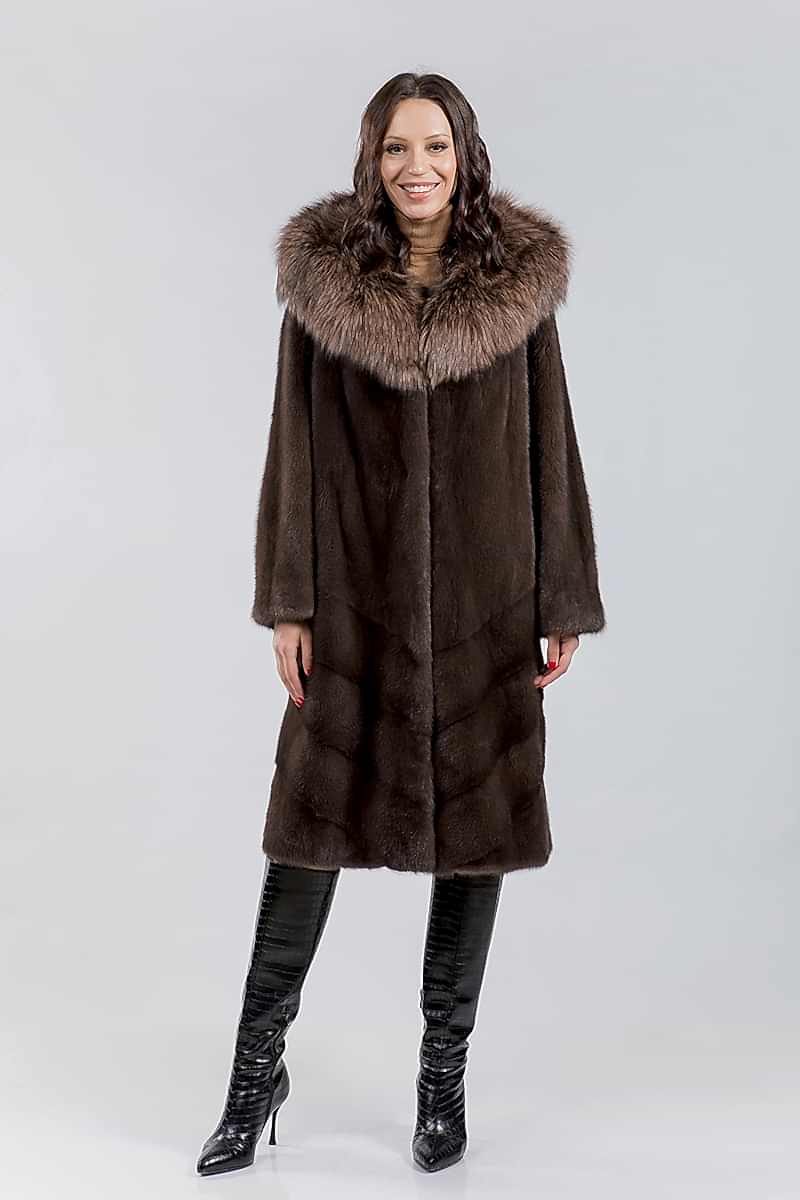 Капюшон шубки оторочен длинноворсовым мехом лисы, тонированным под оттенок норки. Pin-Up фасон, никогда не выходящий из моды, и великолепное сочетание натурального меха с длинным и коротким ворсом придает этой модели презентабельный вид. Шубка смотрится дорого, благородно и стильно.