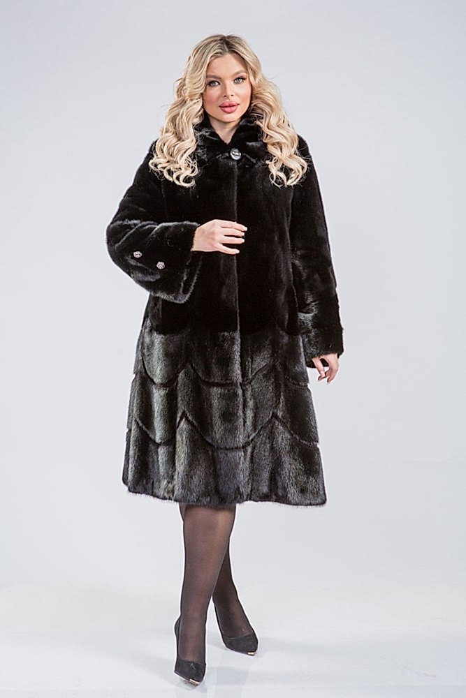 Норковое пальто с фасоном клеш, украшенное фигурной выстрижкой по Pin-Up гарантированно будет в тренде сезона 2024-2025.