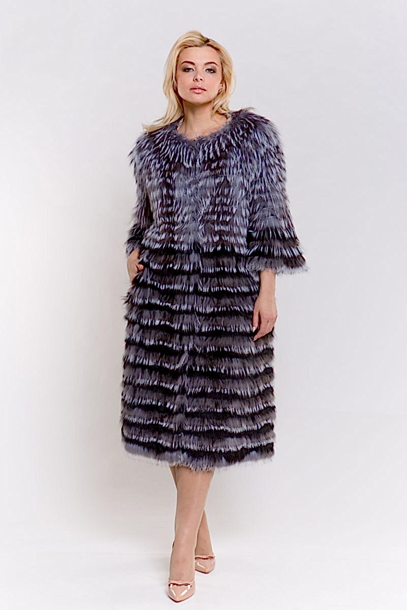 Выглядеть зимой очаровательно, эффектно, не испытывать дискомфорта в любую погоду вам поможет оригинальное полупальто из меха лисы чернобурки арт.4835. Необычный крой, горизонтальное расположение полос демонстрируют все преимущества материала. Укороченные рукава позволяют дополнять лук длинными кожаными, замшевыми перчатками. Модель отлично дополнит классический, молодежный, гламурный стиль, нейтральный тон, длина миди гарантирует удобство, предоставляет Pin-Up свободу выбора обуви, аксессуаров. Неординарный дизайн обеспечит луку выразительность, индивидуальный характер.
