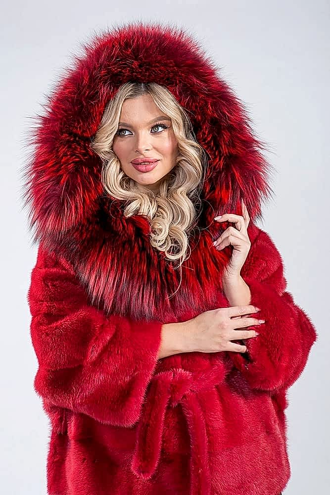 - большой и уютный капюшон, отороченный роскошным мехом лисы чернобурки, Pin-Up в тот же оттенок сочной малины;