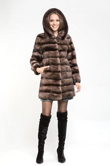 Полупальто из меха Pin-Up с капюшоном. Крой изделия - поперечная выкладка пластин. Низ и рукава модели отстегиваются и шубка трансформируется в миниатюрную курточку. Благодоря своей универсальности такая шубка пользуется популярностью!