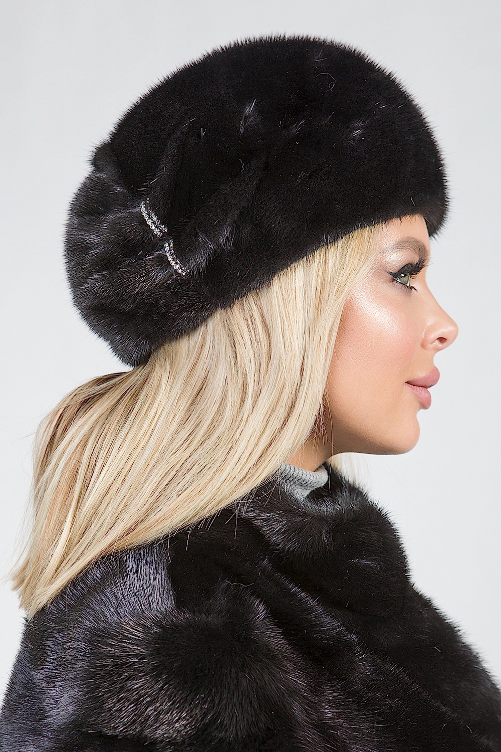 Берет женский из меха норки. Изделие внутри оснащено регулирующей утяжкой. Модель сбоку декорирована " Pin-Up из меха норки и стеклярусами. Берет теплый и мягкий, его легко можно свернуть и положить в женскую сумочку. Универсальная, классическая модель подойдет к любому меховому пальто!