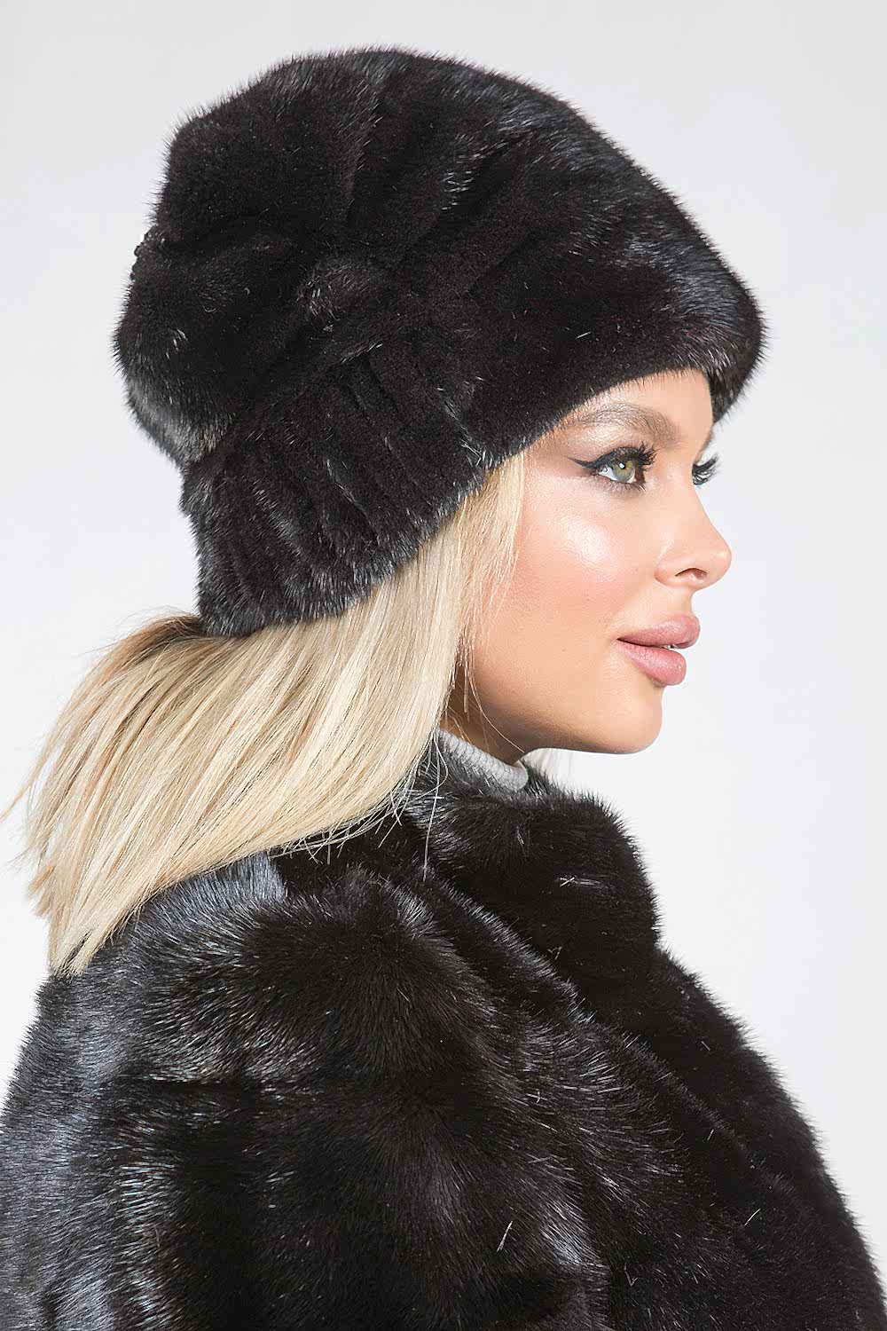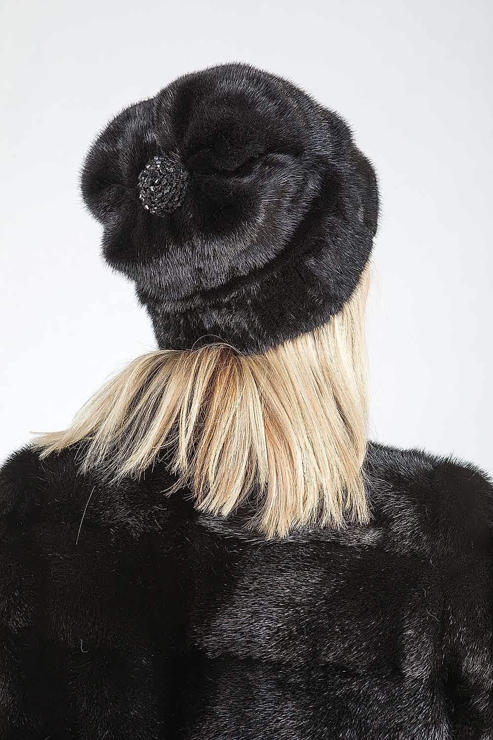 Шапка женская из меха норки. Модель внутри оснащена трикотажной широкой резинкой. Вверху изделие декорировано объемным цветком из меха норки и брошью! Шапочка Pin-Up и мягкая, ее легко можно свернуть и положить в женскую сумочку. Универсальная модель подойдет к любому меховому пальто!