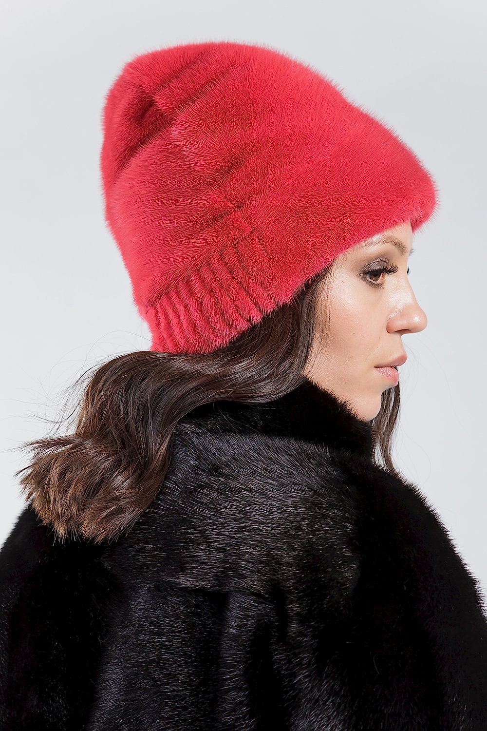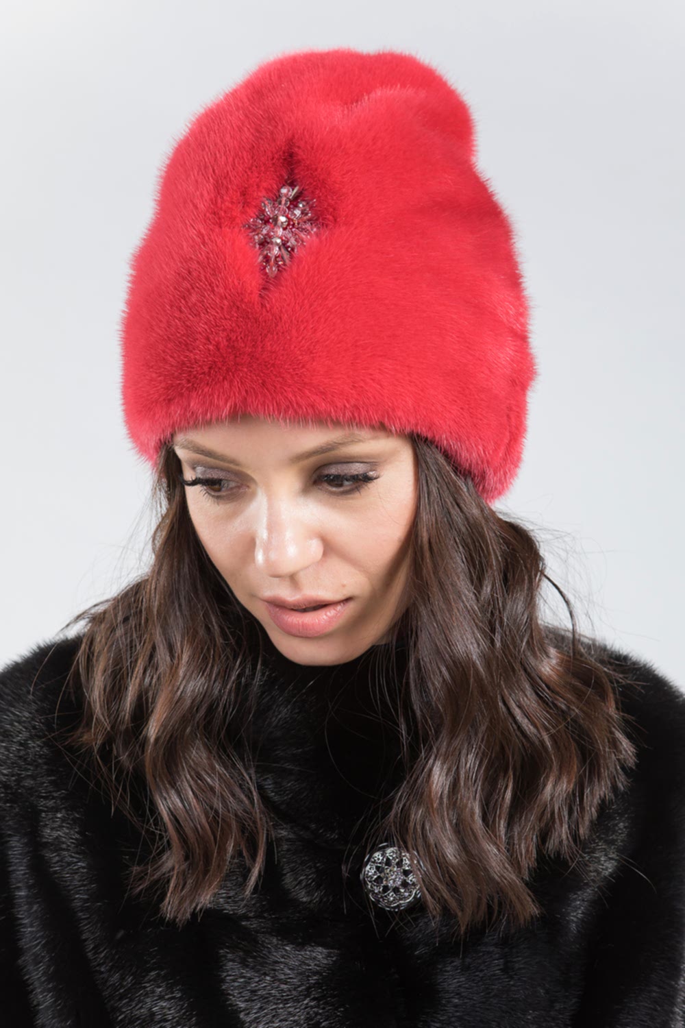 Шапка женская из меха норки. Модель оснащена по низу регулирующей резинкой, чтобы шапочка могла подойти на несколько размеров. Спереди изделие декорировано украшением из бусинок и страз. Великолепный цвет малины подойдет девушкам позитивным и стильным!