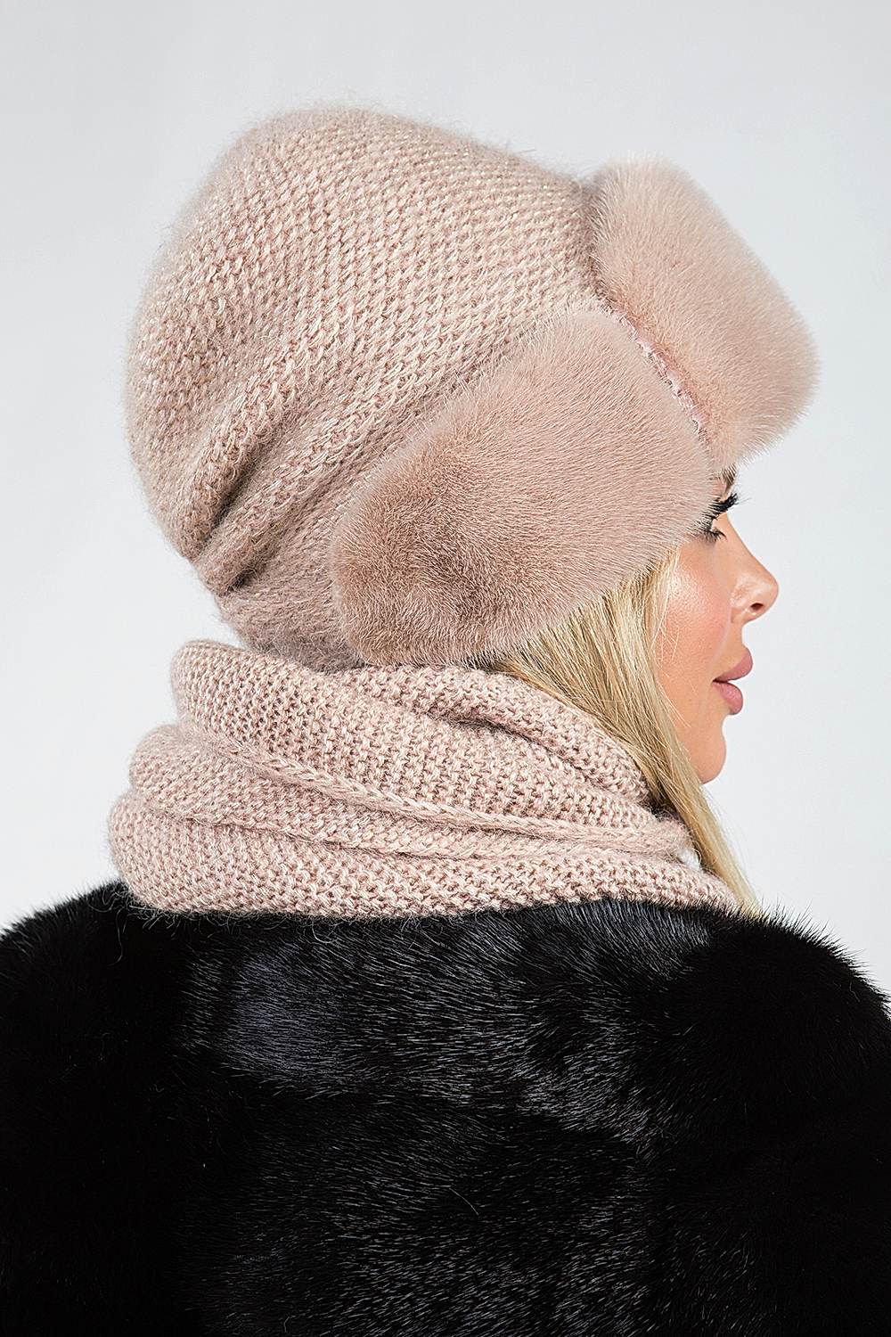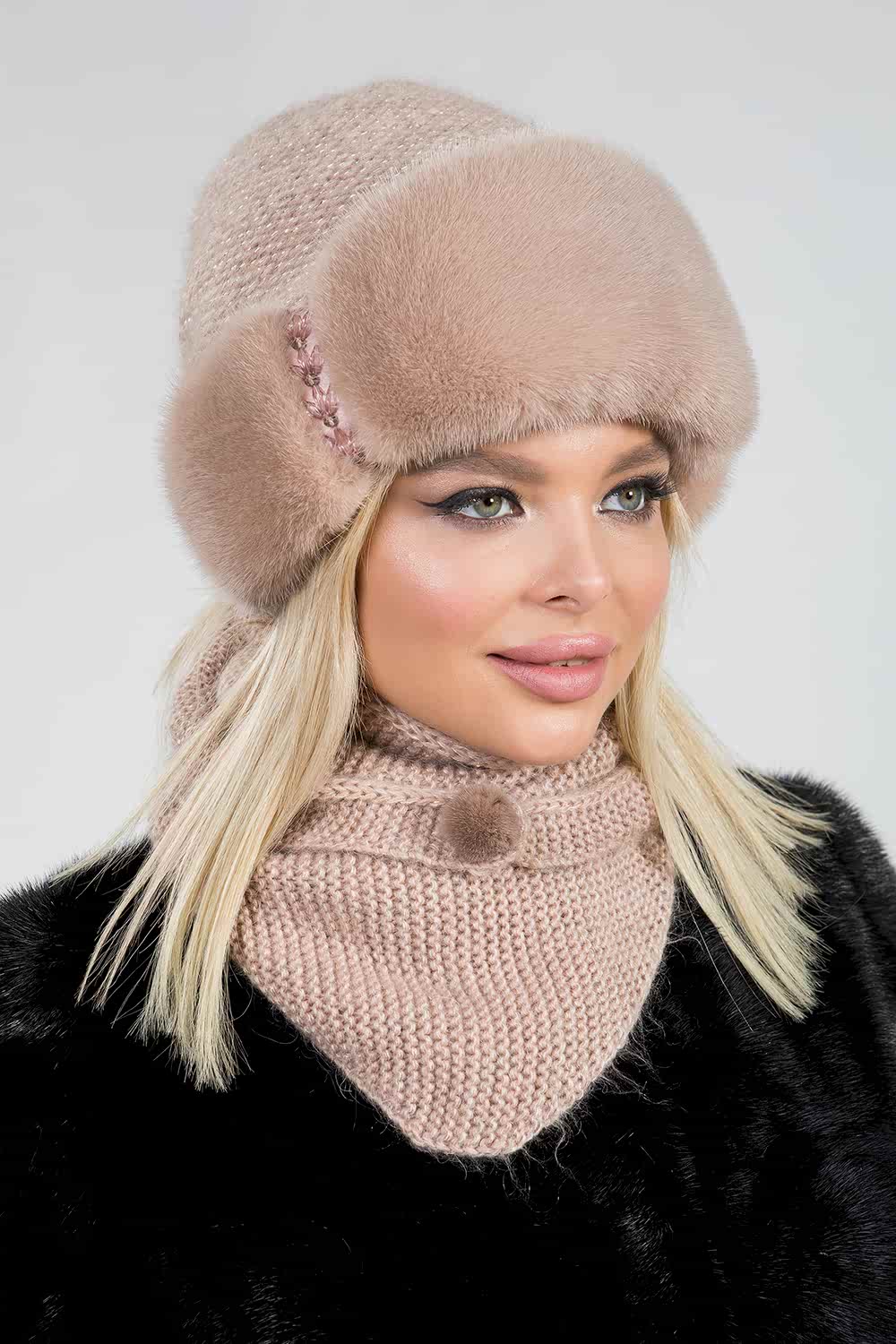 Шапка вязанная, декорирована мехом Pin-Up По бокам модели нежные стеклярусы. К шапочке в комплект прилагается мягкий, теплый шарфик. Стильная шапочка в светлых тонах освежает и омолаживает образ!