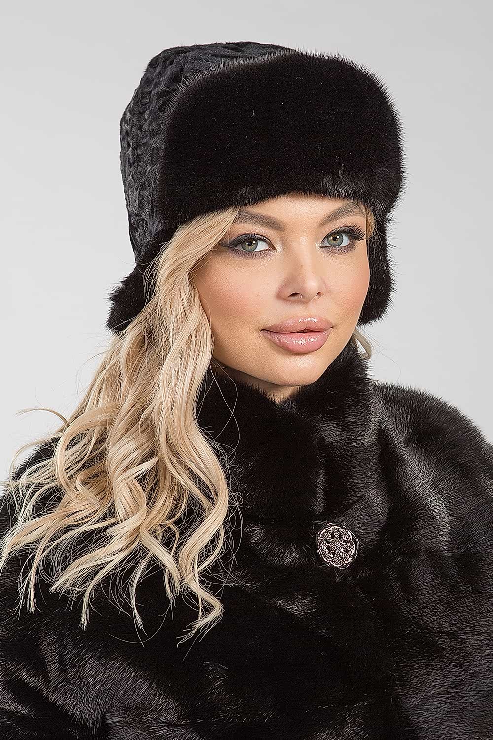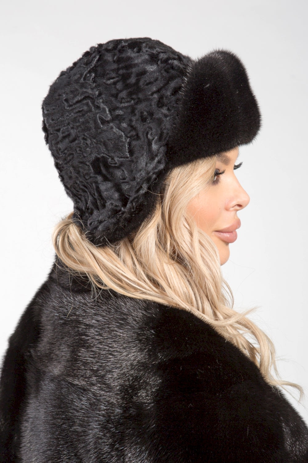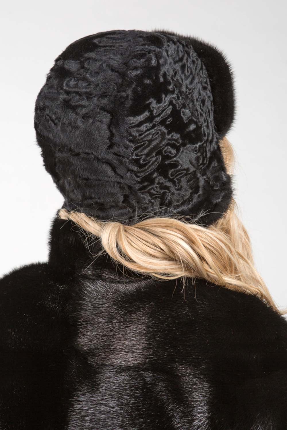 Шапочка-ушанка из меха каракульчи. Изделие декорировано мехом норки. Модель внутри оснащена регулирующей утяжкой, чтобы шапочка могла подойти на несколько размеров. Модель универсальная и теплая, ее легко можно Pin-Up и положить в женскую сумочку. Она не займет много места и не потеряет форму. Ушаночка благородного черного цвета подойдет к любому меховому пальто и будет согревать в морозные деньки!