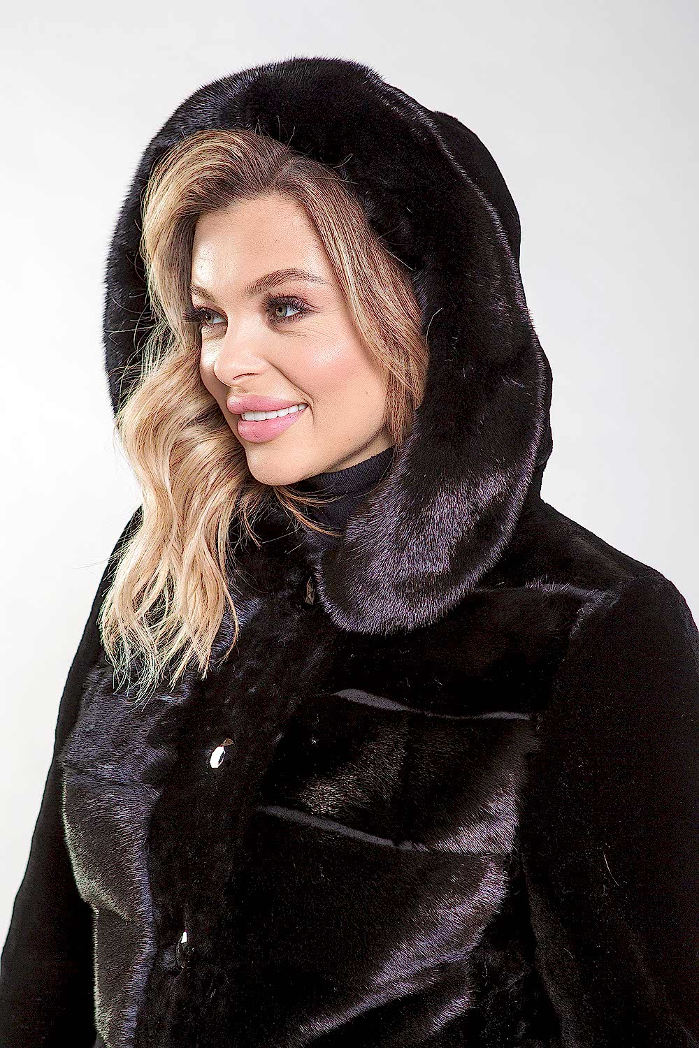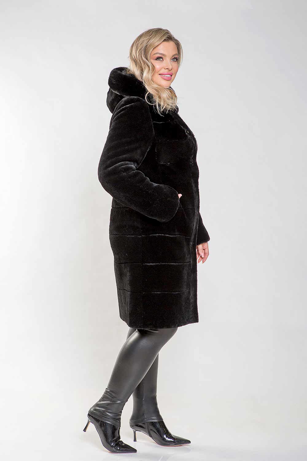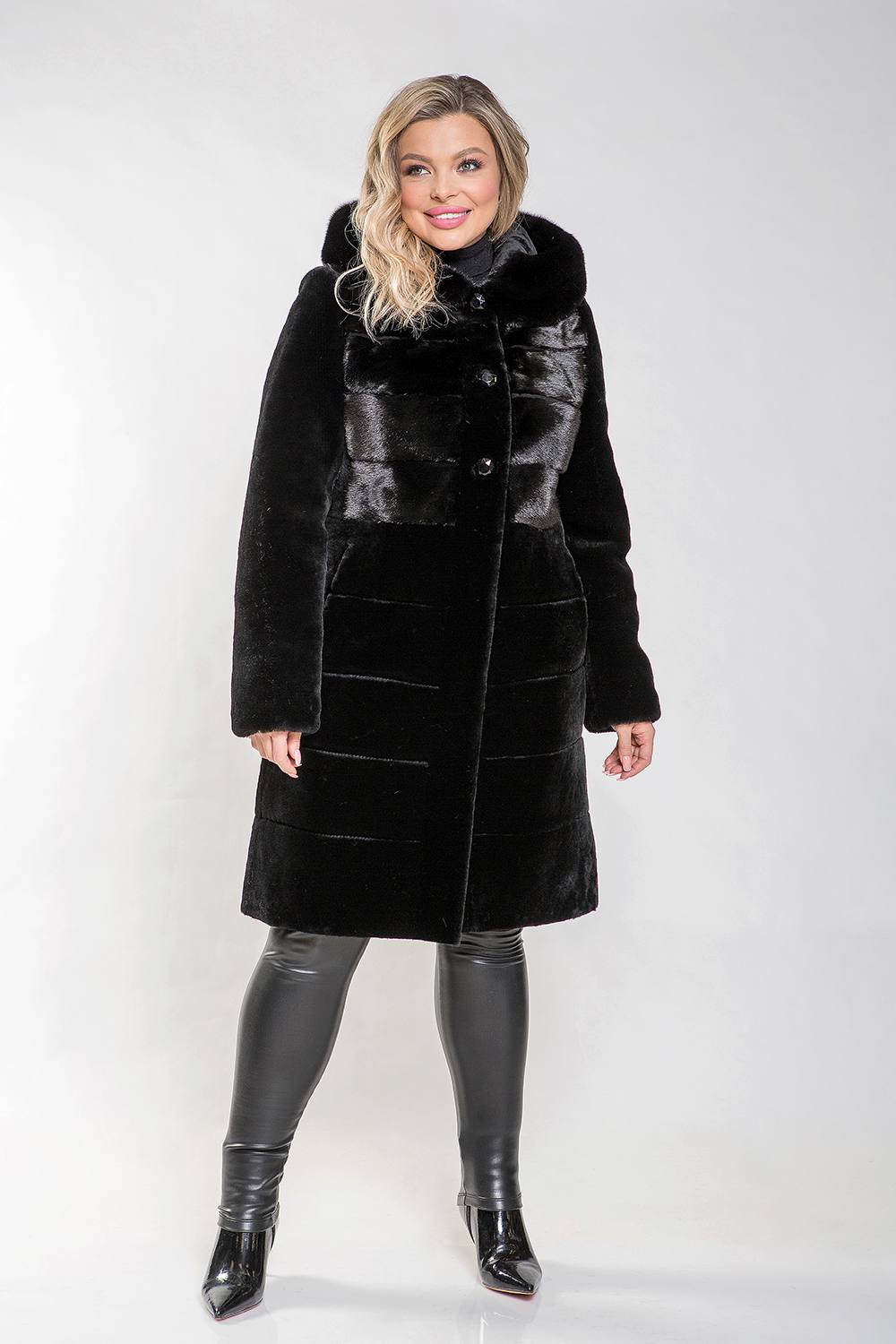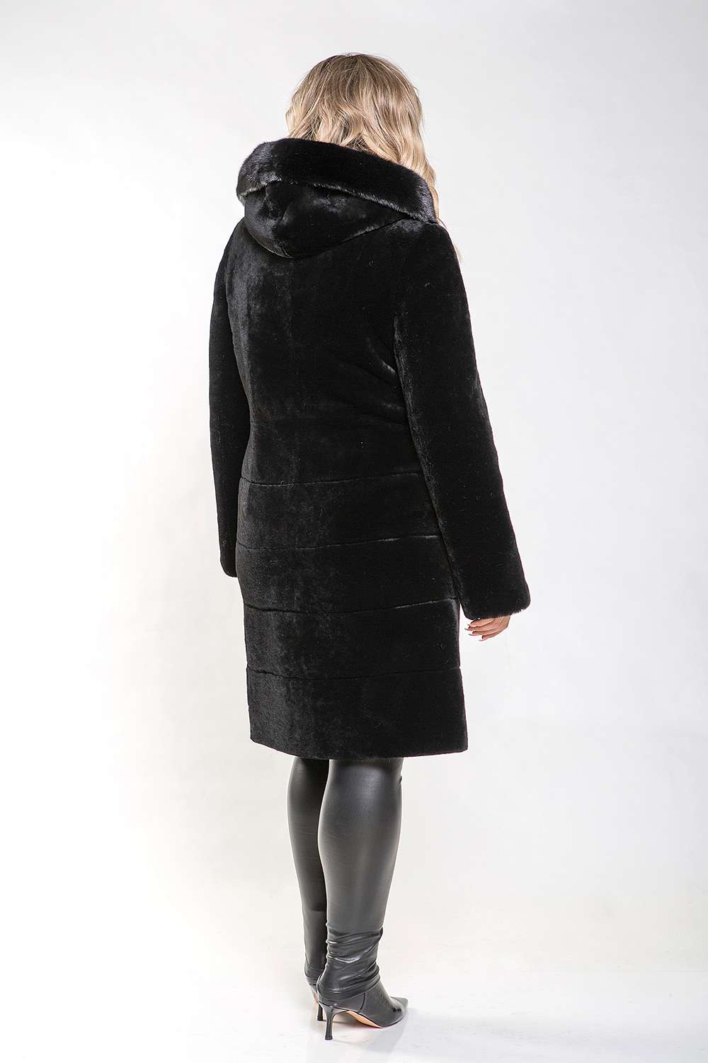 Полупальто из овчины с капюшоном, украшенным норковым мехом, - это стильное и элегантное решение для холодной погоды. Пластинчатый Pin-Up придаёт модели современный и утончённый вид.