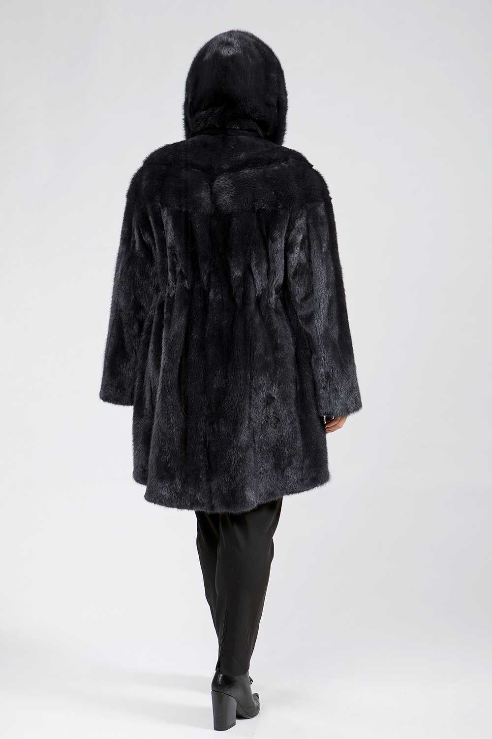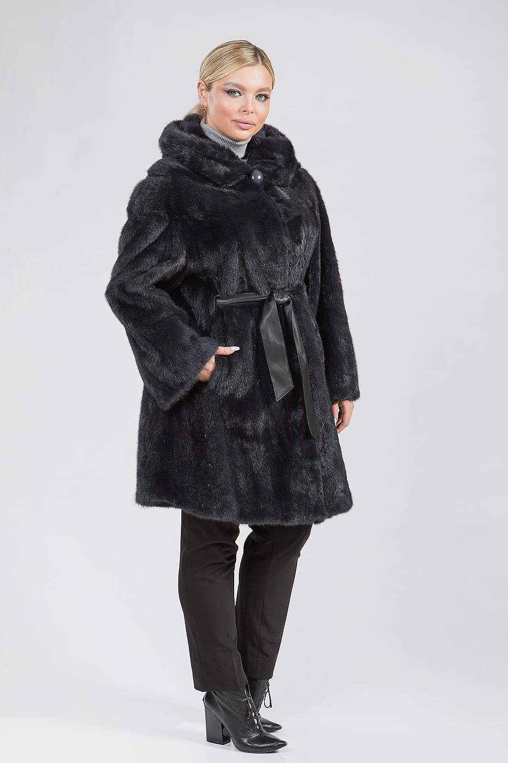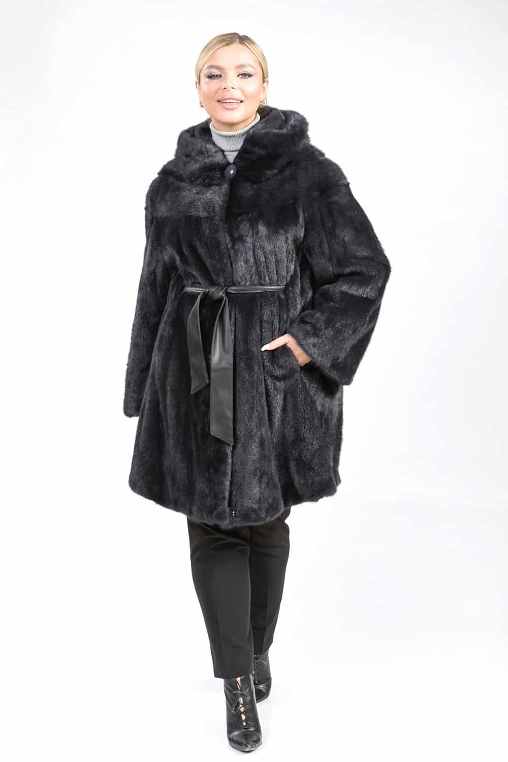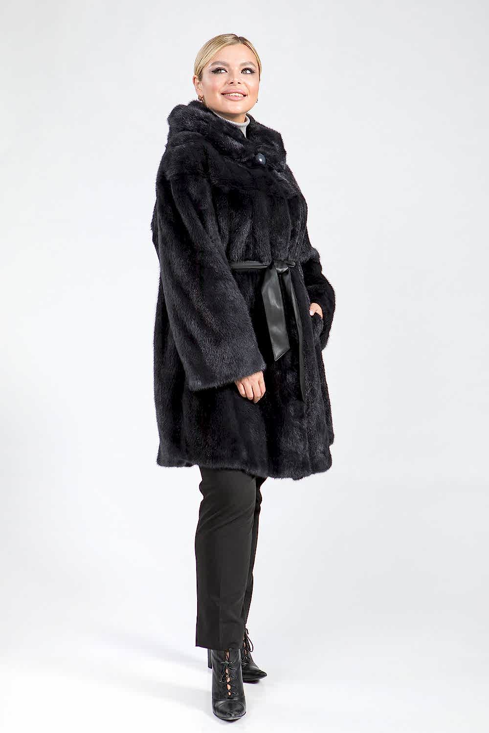 Полупальто из норкового меха с капюшоном, выполненное в стиле роспуск с добавлением пластин, обеспечивает комфорт благодаря регулируемой утяжке на рукавах. Изящный кожаный пояс, проходящий внутри изделия, подчеркивает линию талии, придавая образу утонченность. Длина полупальто составляет 100 см. Элегантная модель в цвете муссона отличается оригинальностью и очарованием, покоряя своим внешним видом.