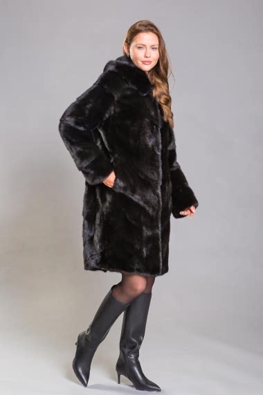 Pin-Up из меха норки с капюшоном, выполненное по уникальной технологии диагональной выкладки пластин. Рукава модели имеют поперечное направление, а их нижняя часть отстёгивается, позволяя создавать более укороченные варианты.