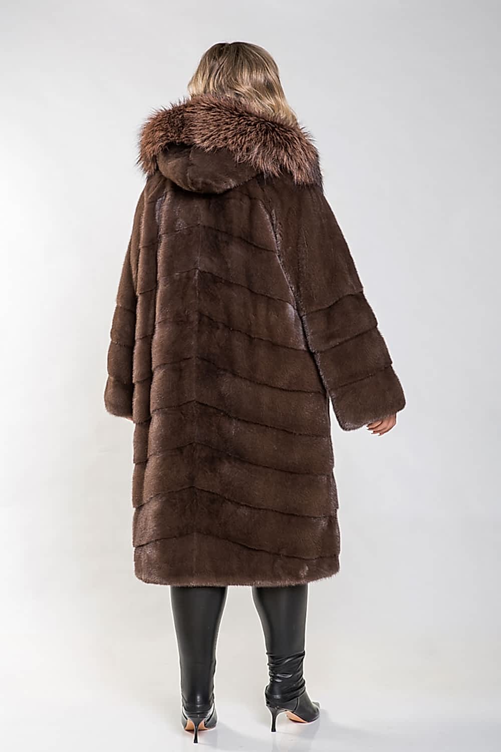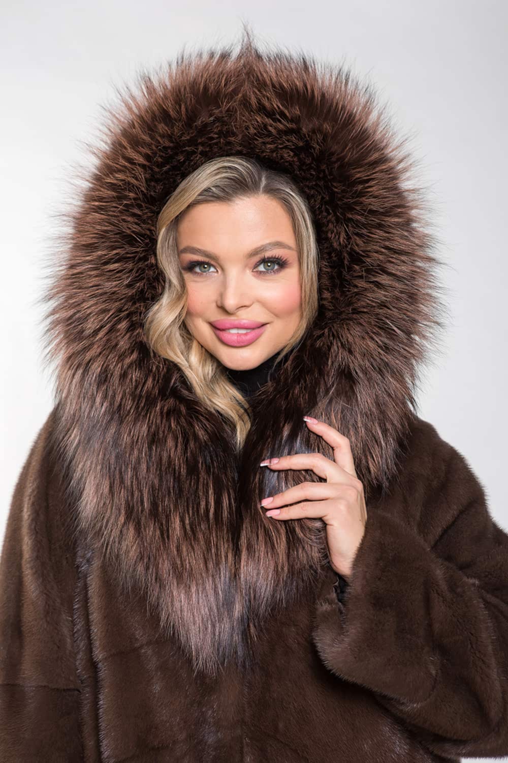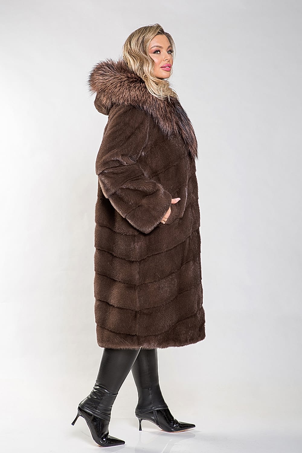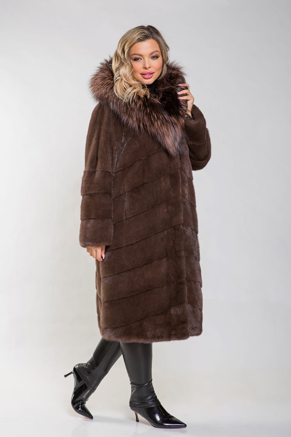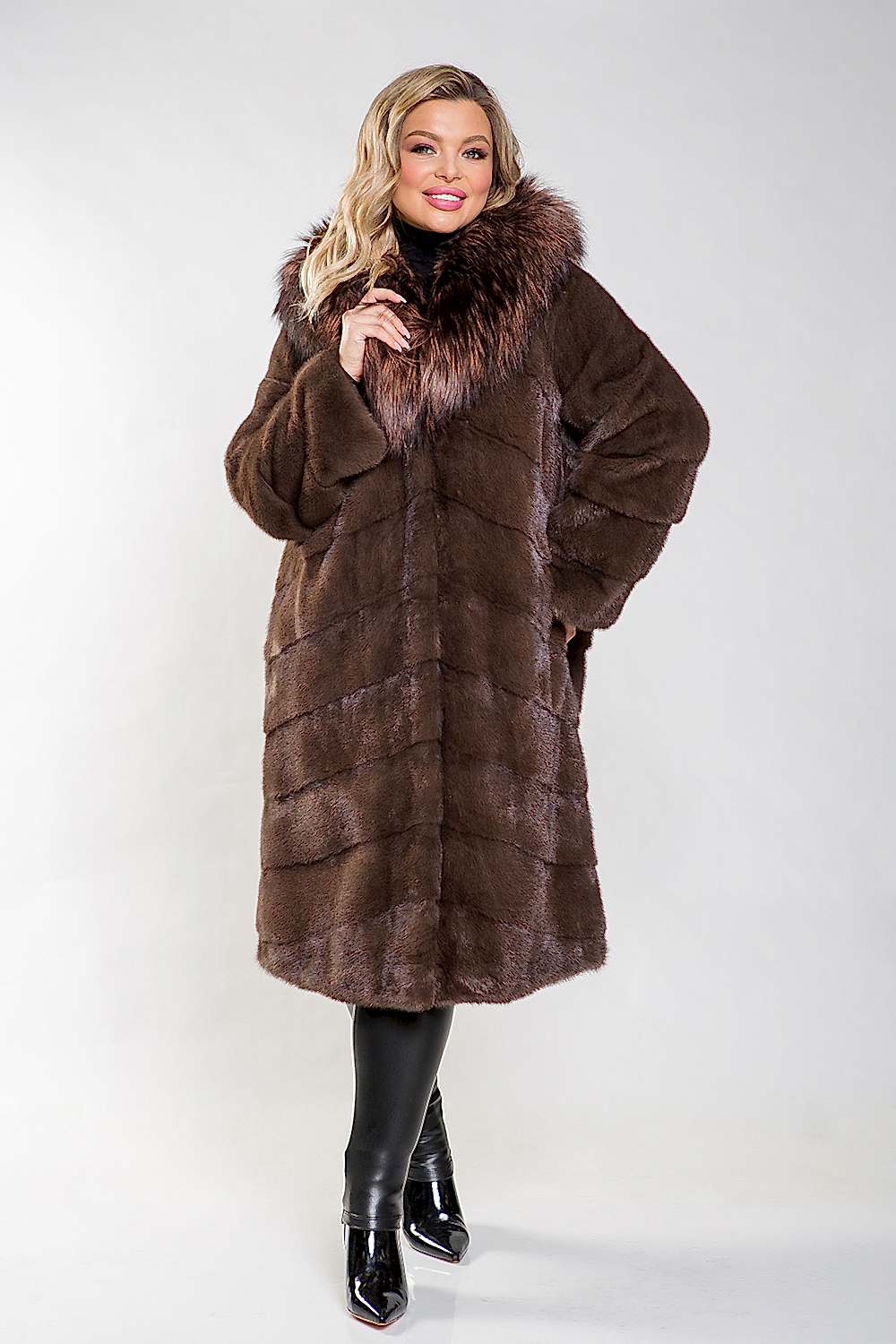 Полупальто выполнено из меха норки и украшено капюшоном с тонированным мехом лисы. Крой модели отличается диагональной выкладкой пластин, что придаёт ей элегантный и современный вид. Внутри на талии, рукавах и по низу изделия расположены регулирующие утяжки, позволяющие создать идеальный силуэт. Длина полупальто составляет 110 см, а рукава могут быть трансформированы в более укороченные, что позволяет комбинировать модель с разными образами. Эта шубка не только согреет в холода, но и придаст уверенности в себе, подчеркнув Pin-Up женское очарование!