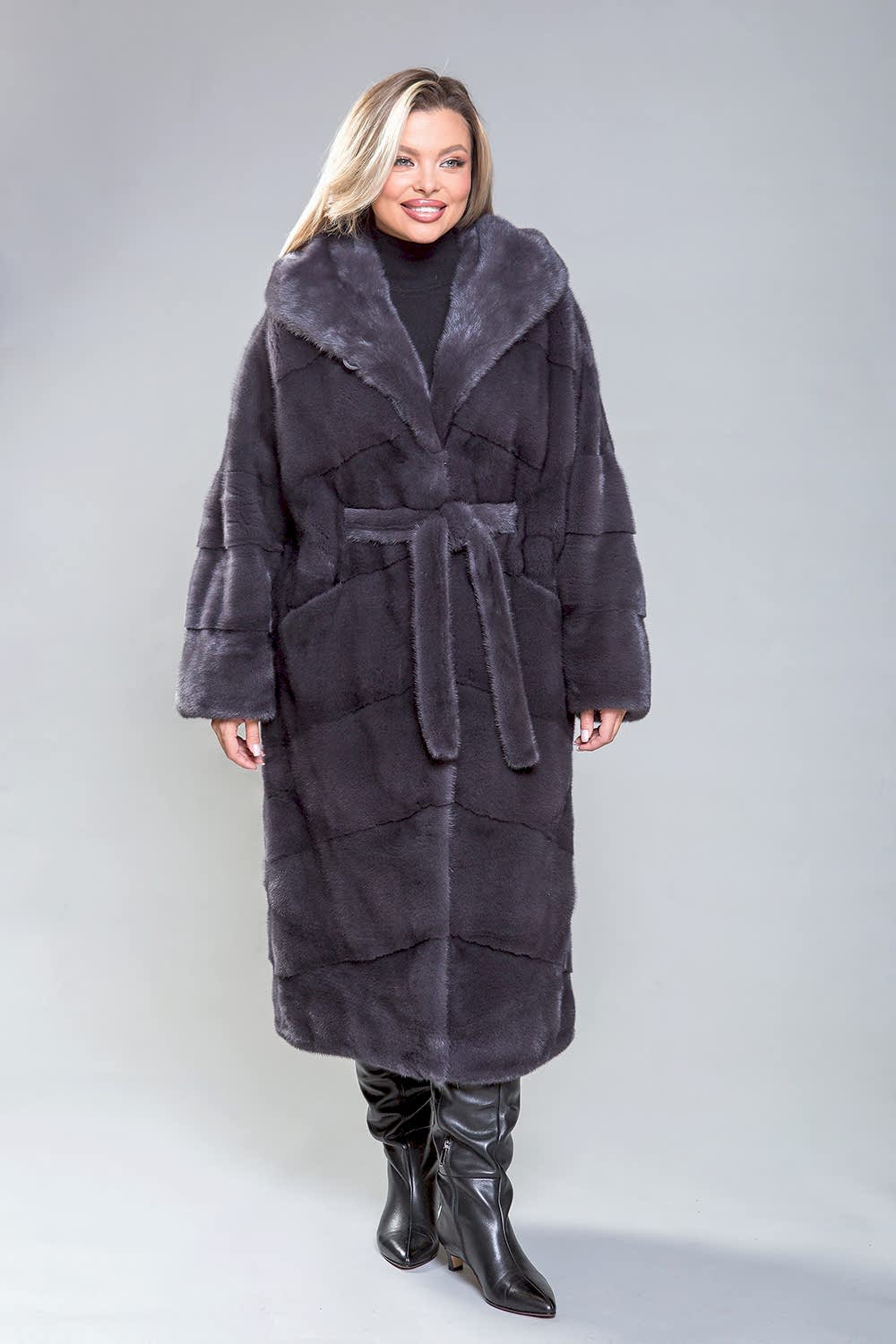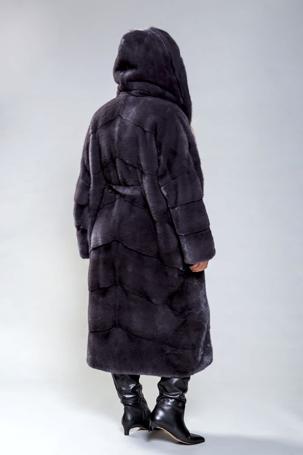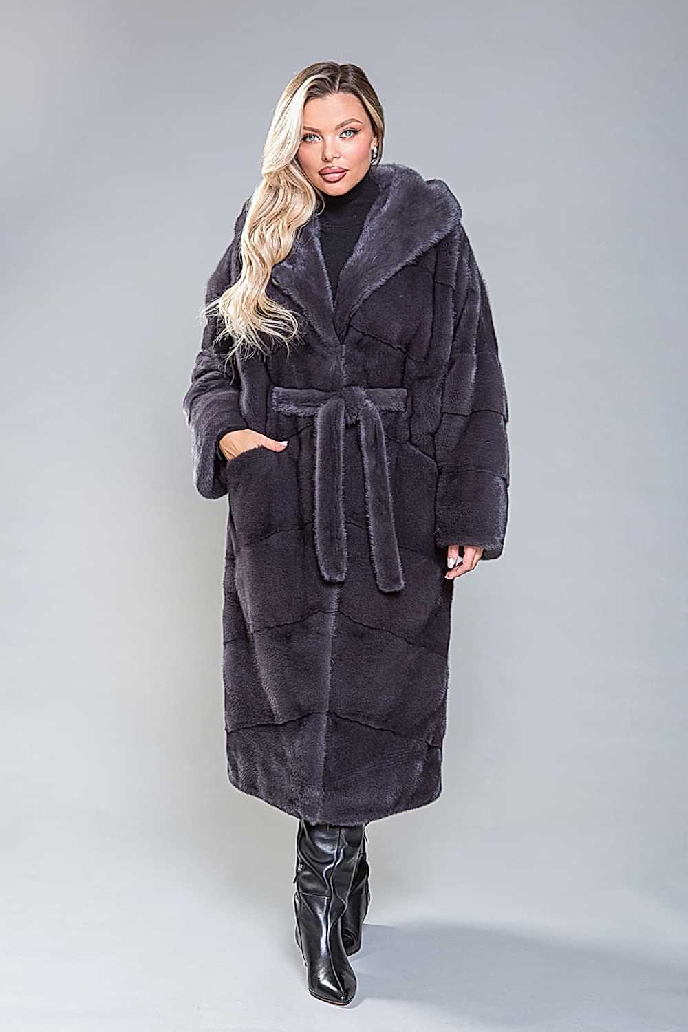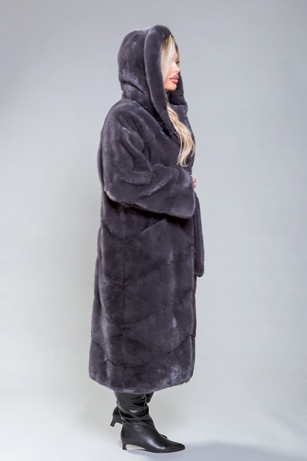 Полупальто из роскошной норки с капюшоном. Модель выполнена в технике Pin-Up выкладки пластин. Пояс, проходящий внутри изделия, подчеркивает фигуру. Карманы закрываются с помощью магнитов. Длина изделия составляет 120 см. Современный и элегантный дизайн модели визуально уменьшает объемы и скрывает недостатки фигуры. Это полупальто добавит уверенности и подчеркнет статус успешной женщины!