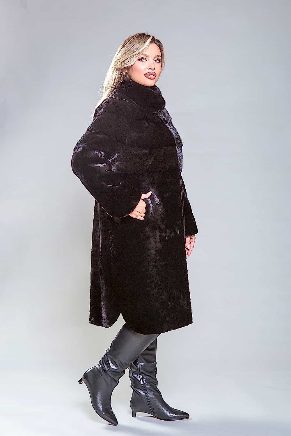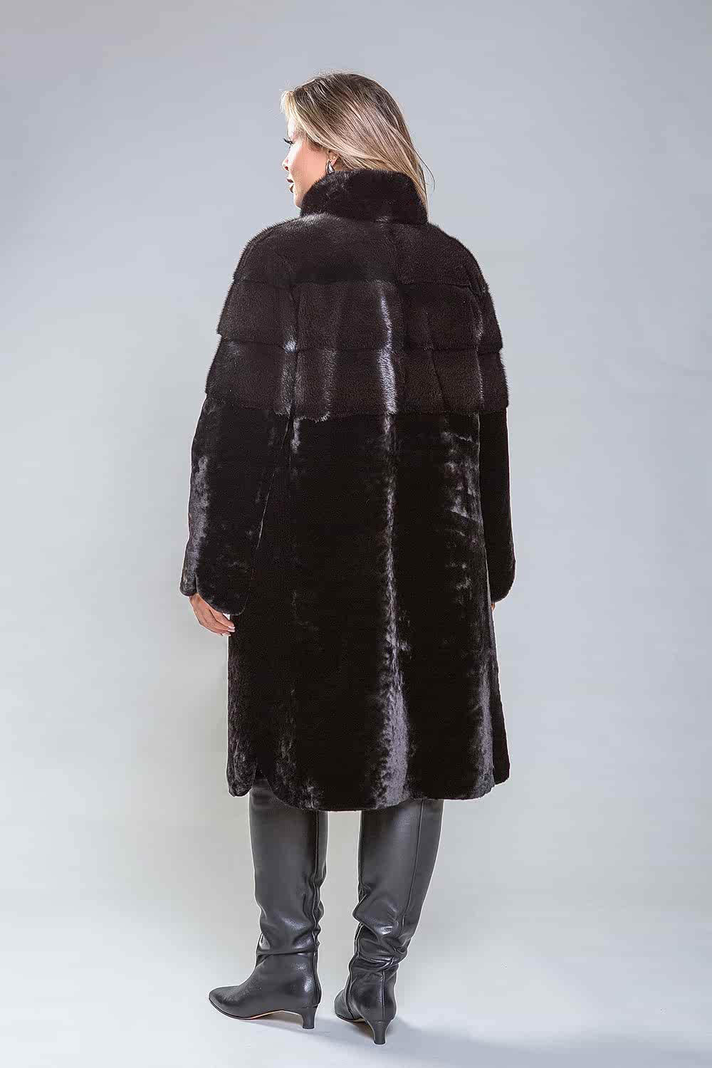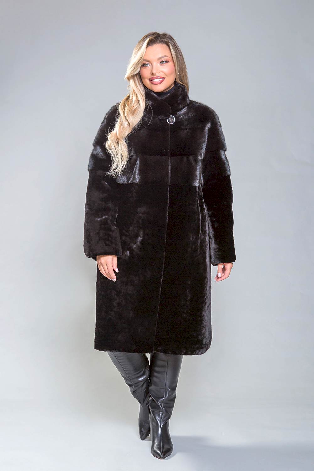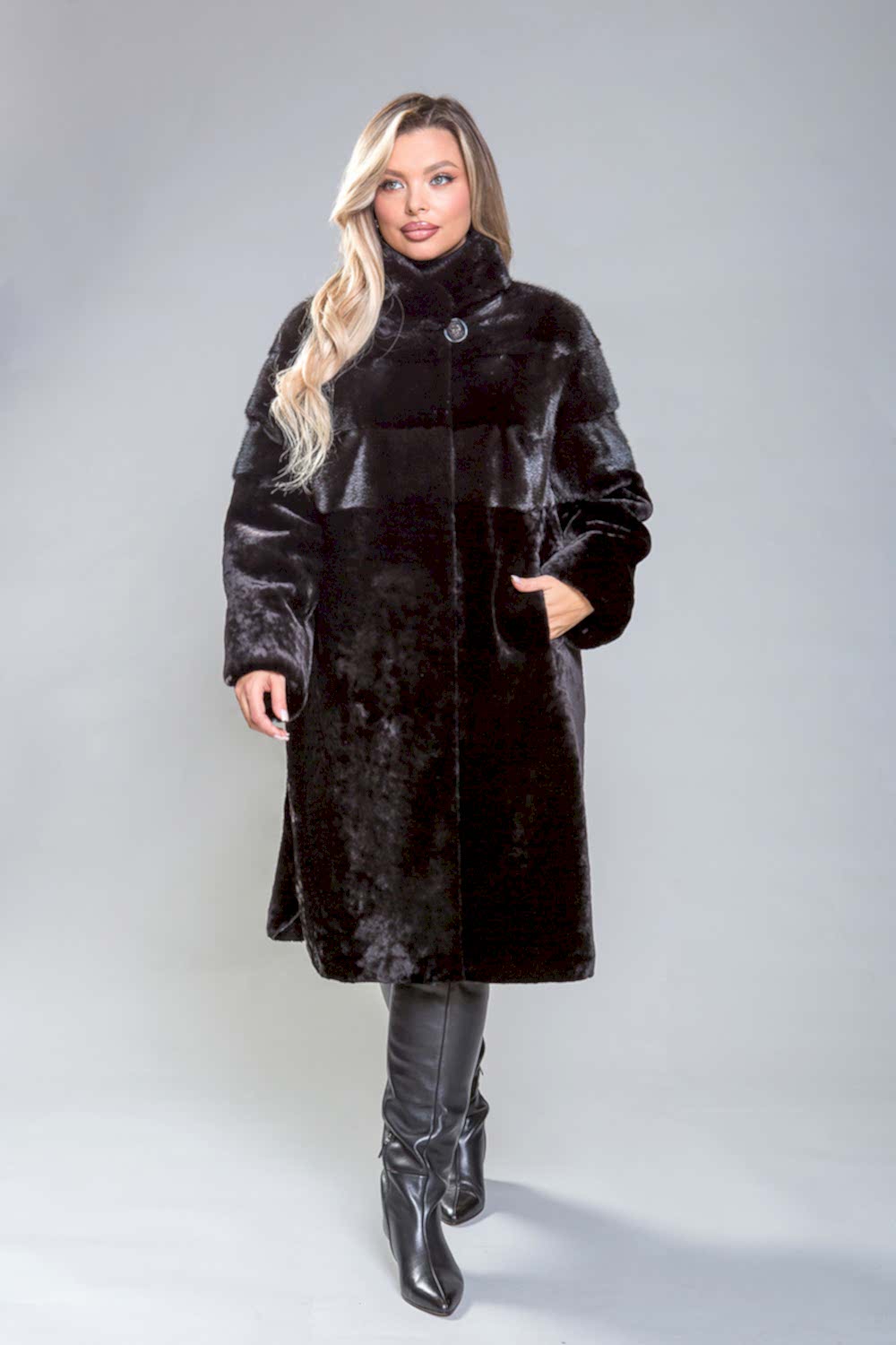 Полупальто из высококачественной овчины с элегантным воротником-стойкой. Передняя и задняя части до талии, а также верхняя часть рукавов Pin-Up роскошной норкой, выполненной из поперечных пластин. Изящные закругленные разрезы на рукавах и подоле придают модели утонченность. Длина изделия - 100 см. Благородный шоколадный оттенок легко вписывается в любой стиль. Это воплощение роскоши высшего класса!