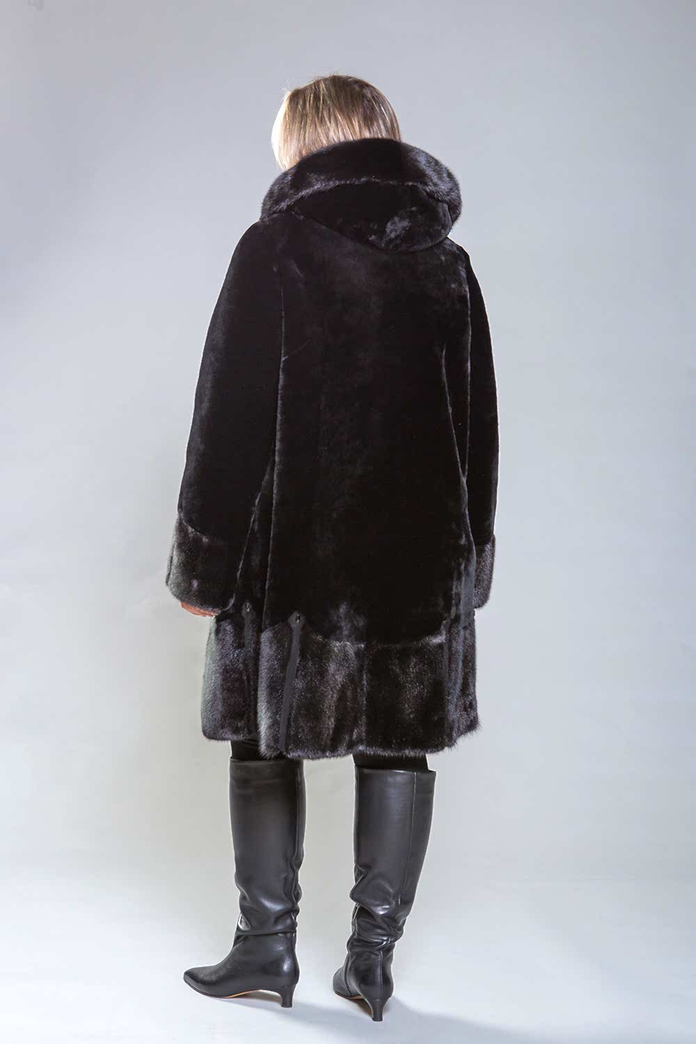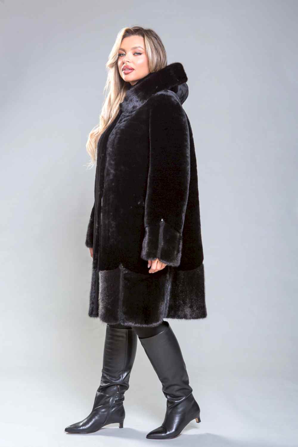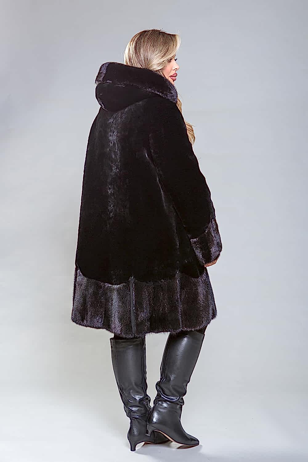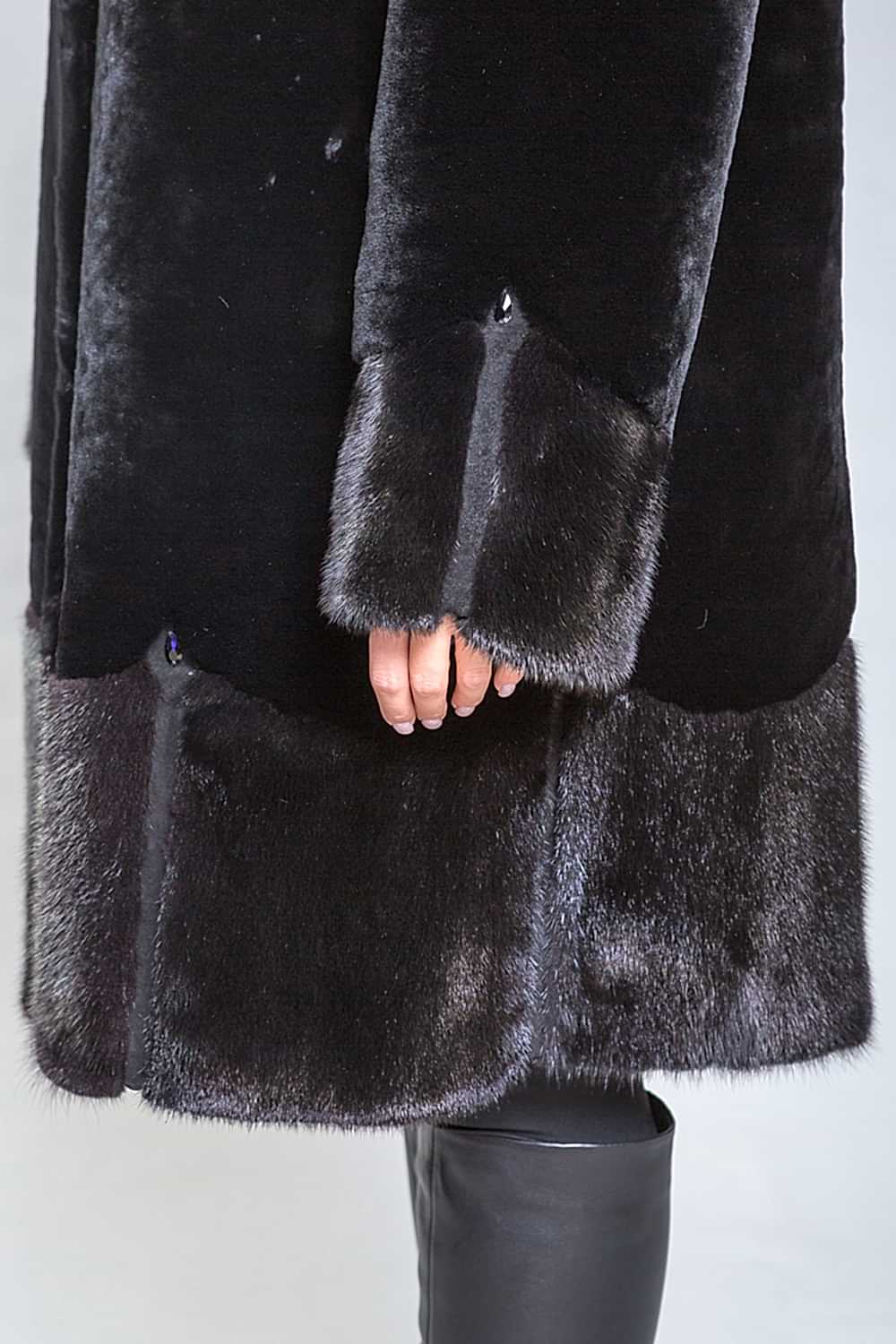 Pin-Up полупальто из высококачественной овчины с утонченными деталями. Рукава, капюшон и подол выполнены из норки, украшенной миниатюрными стеклярусами. Роскошная овчина премиум-класса гарантирует тепло и комфорт, оставаясь эффективной даже при повышенной влажности. Капюшон застегивается на пуговицу, а шуба фиксируется металлическими клипсами. Карманы и борта полупальто изготовлены из натуральной замши. Длина изделия - 100 сантиметров, что делает его удобным для повседневного ношения. Легкий вес и отличная теплоизоляция делают это полупальто важным элементом гардероба.
