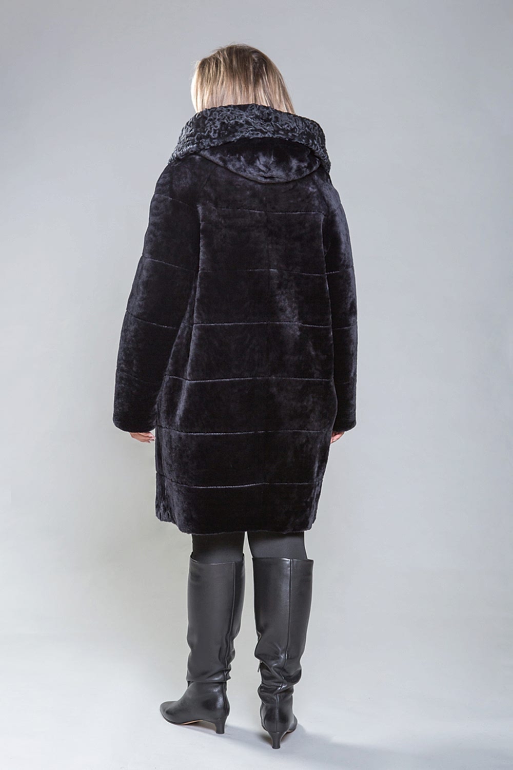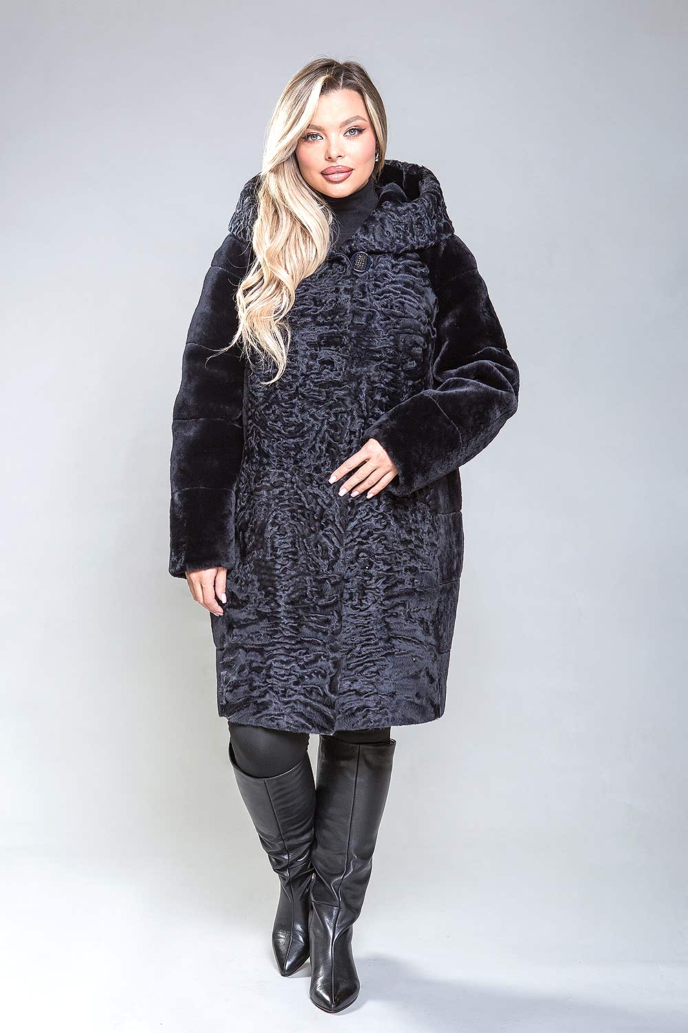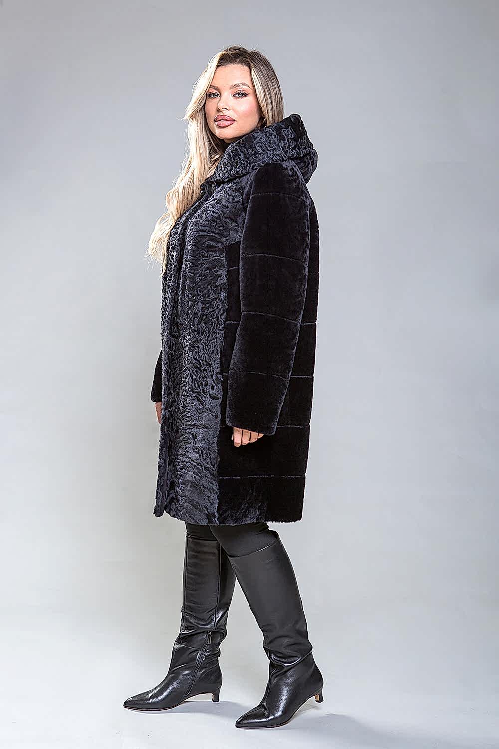 Элегантное полупальто создано из высококачественной овчины с поперечной выкладкой пластин. Капюшон и передняя часть украшены роскошным каракулем и изысканными декоративными стеклярусами. Карманы и борта выполнены из натуральной замши, а застежка - на клипсах. Pin-Up изделия составляет 95 см. Черничный цвет прекрасно сочетается с любым стилем одежды, что делает эту шубку идеальным выбором для тех, кто ценит высокое качество.