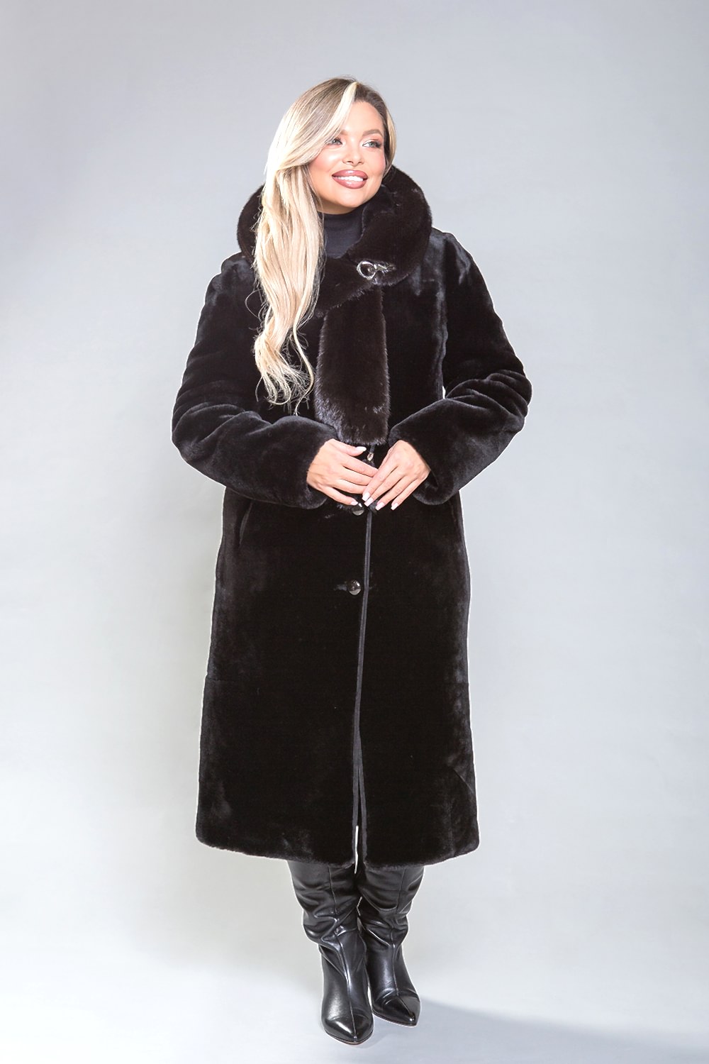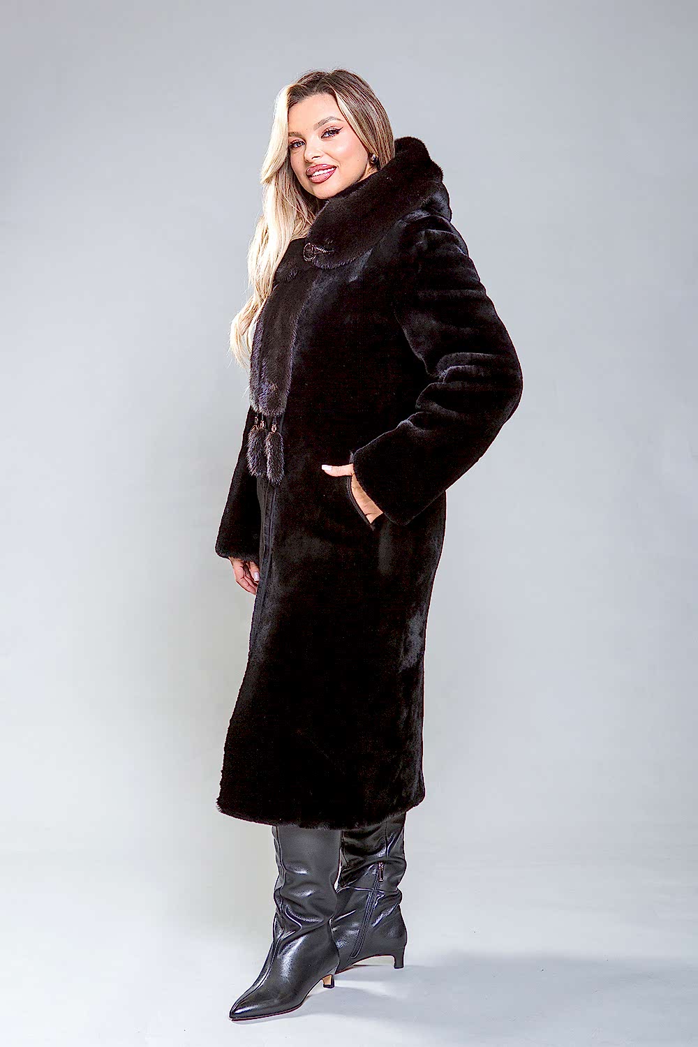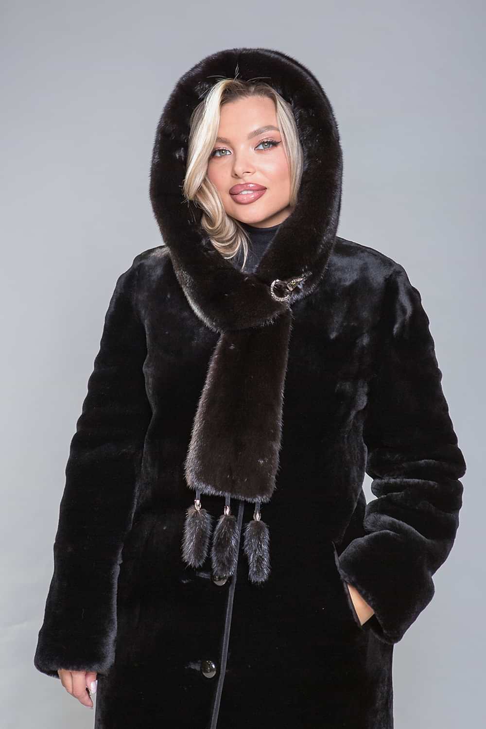 Полупальто из высококачественной овчины. Капюшон украшен роскошной норкой и фиксируется элегантной клипсой. Модель застёгивается на пуговицы и имеет длину 115 см. Карманы и боковые швы сделаны из натуральной замши. Универсальное решение! Модные эксперты утверждают, что классический крой шубы идеально подходит для любой фигуры, подчёркивая изящество и утончённый стиль.