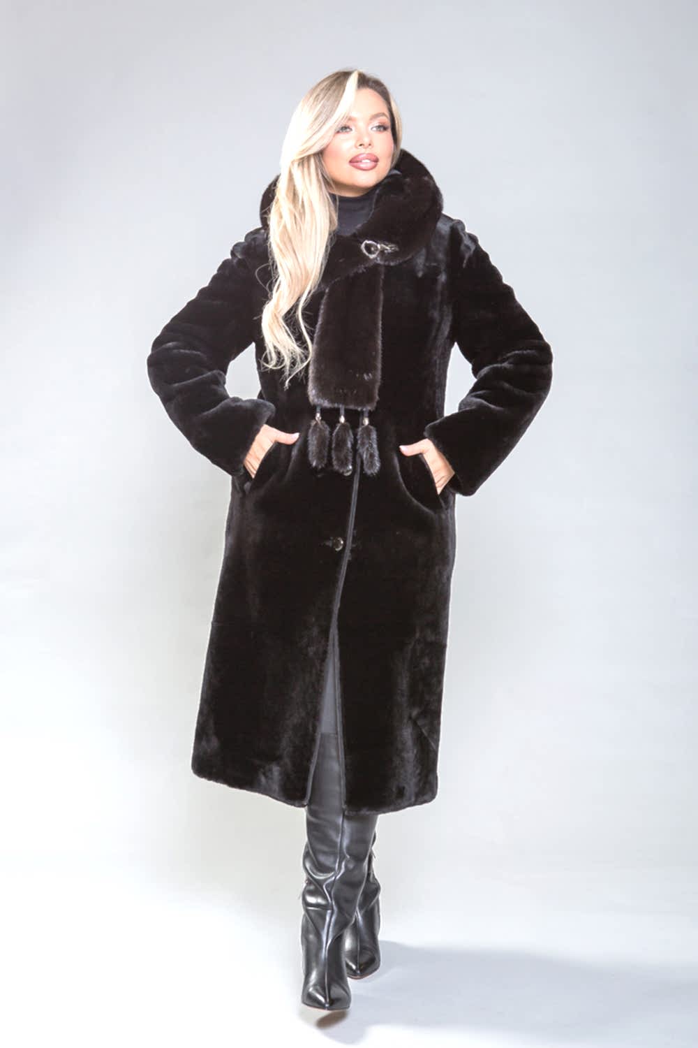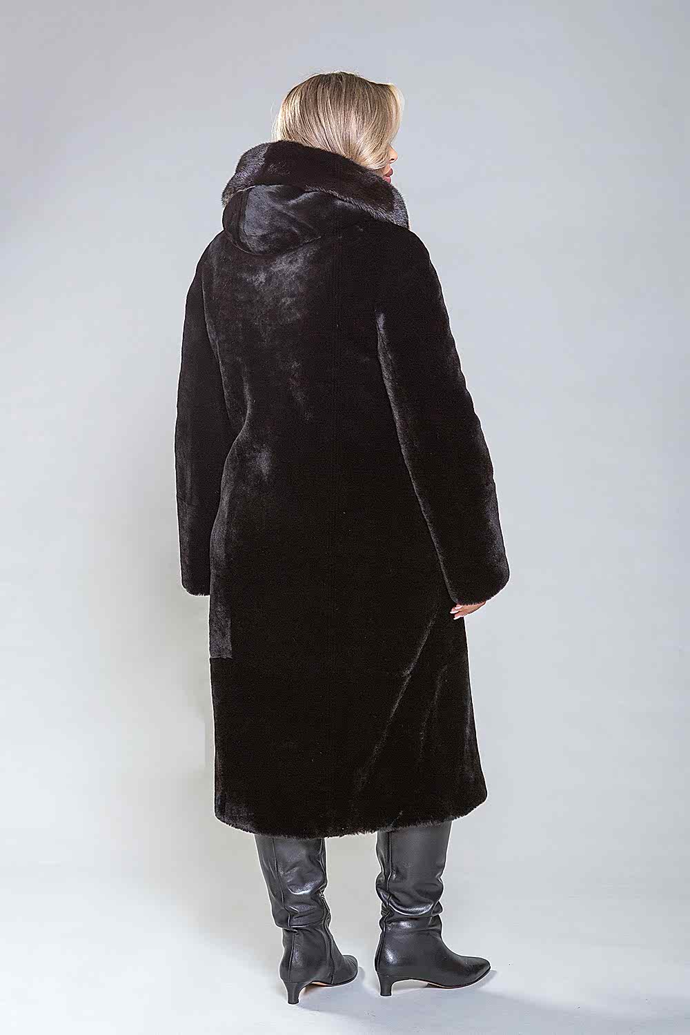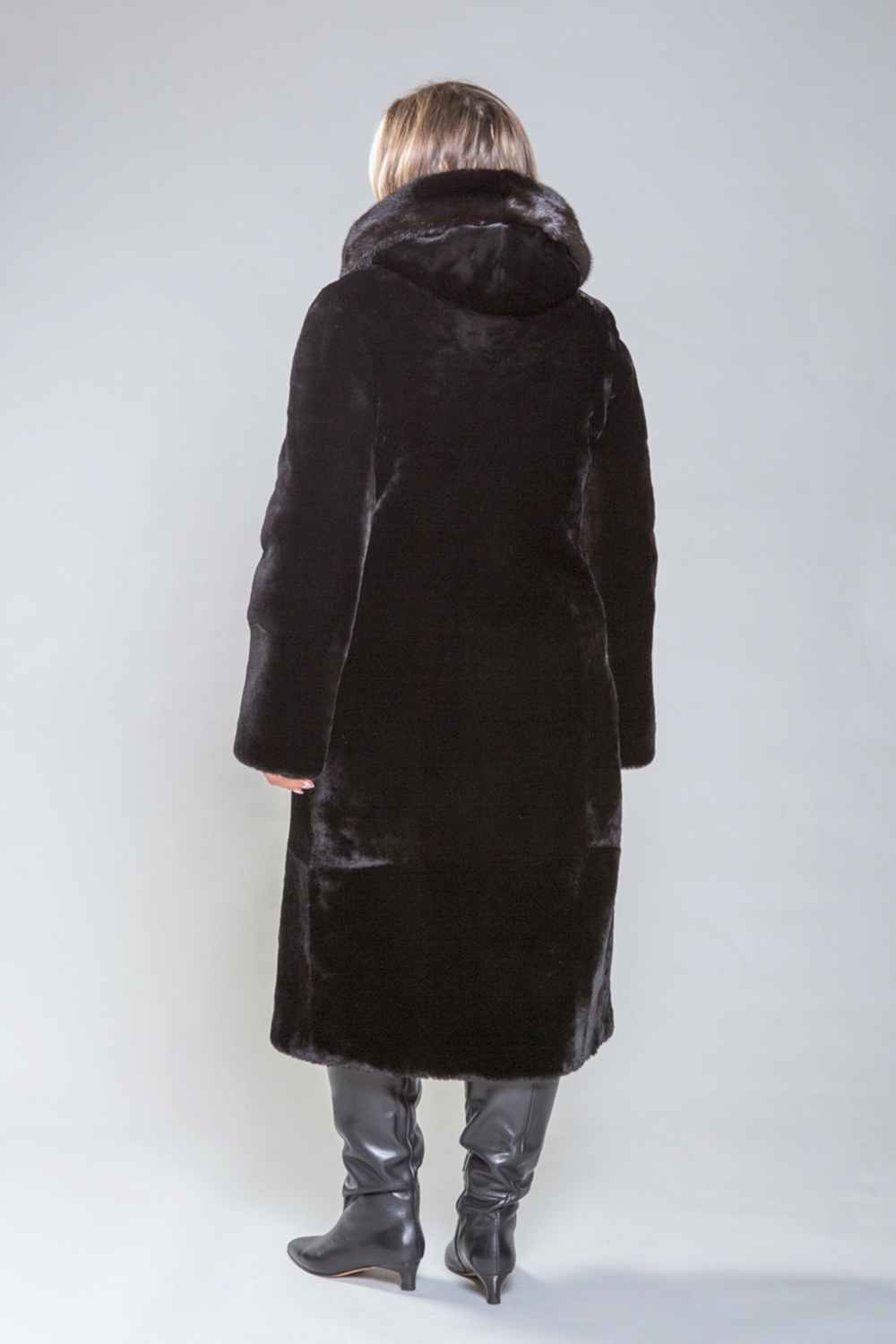 Полупальто из высококачественной овчины. Капюшон украшен роскошной норкой и фиксируется элегантной клипсой. Модель застёгивается на пуговицы и имеет длину 115 см. Карманы и боковые швы сделаны из натуральной замши. Универсальное решение! Модные эксперты утверждают, что классический крой шубы идеально подходит для любой фигуры, подчёркивая изящество и утончённый стиль.