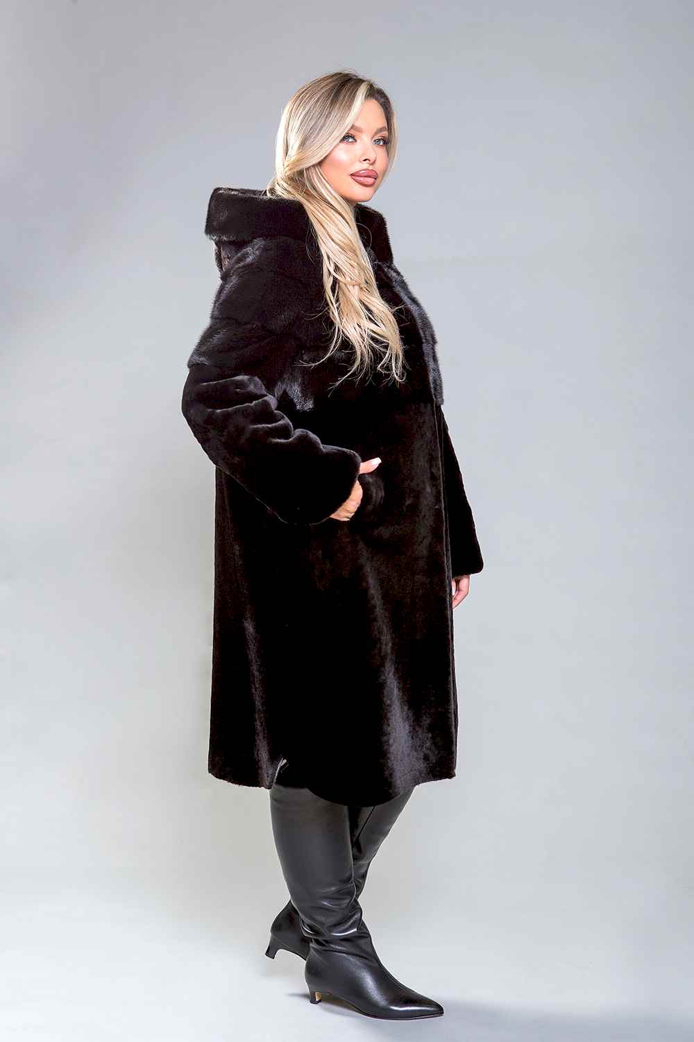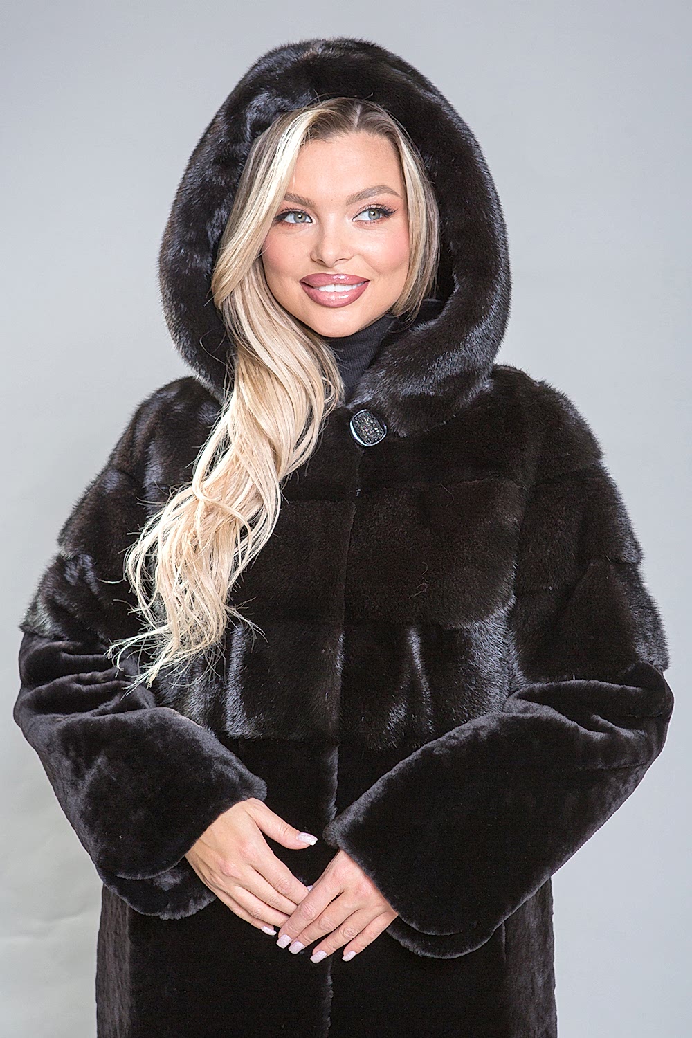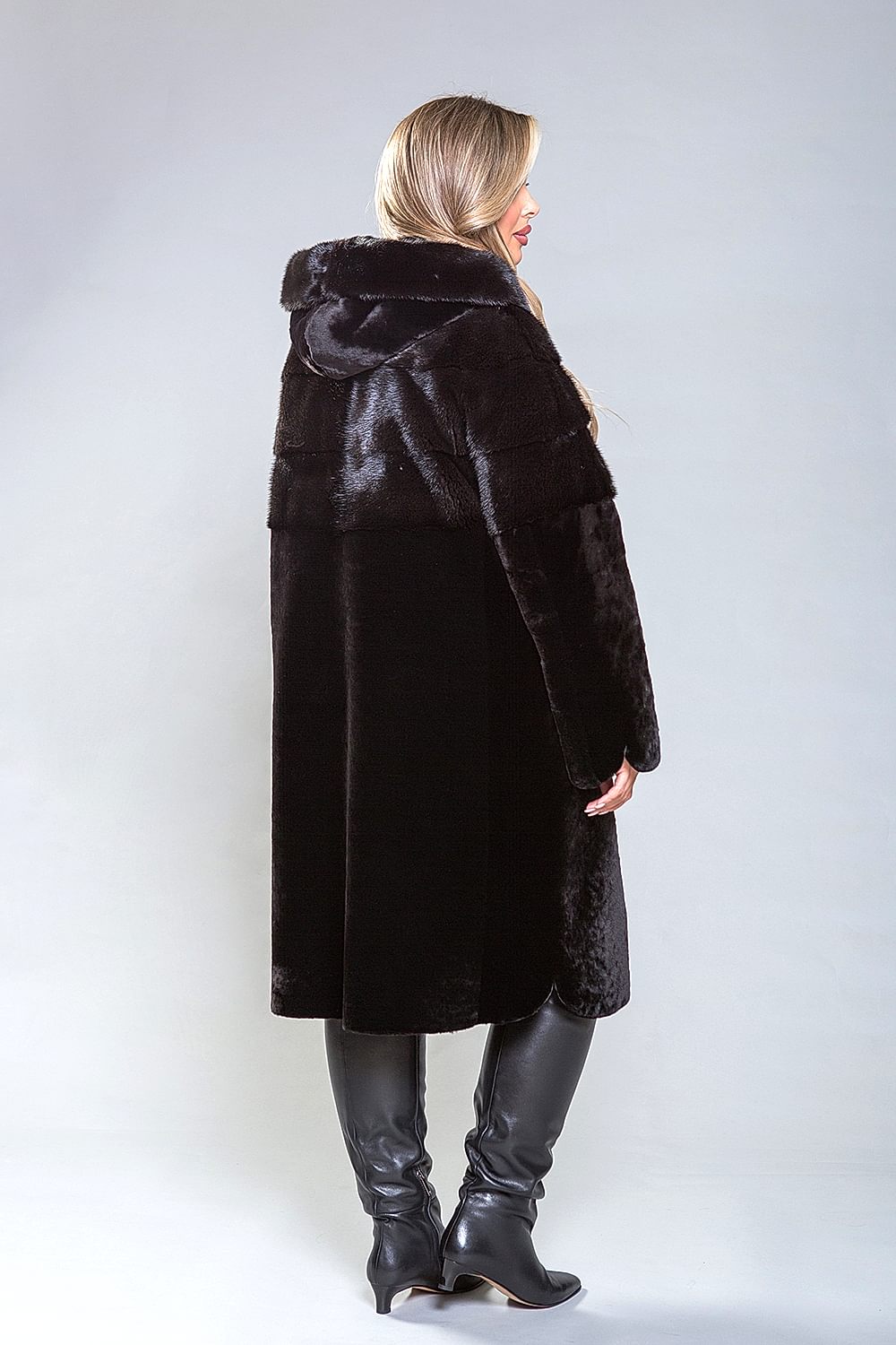 Полупальто из высококачественной овчины с роскошной отделкой из поперечной норки. Капюшон, передняя и задняя части, а также верхняя часть рукавов декорированы мехом норки. Изящные Pin-Up разрезы на рукавах и подоле добавляют утонченности модели. Длина изделия составляет 105 см. Благородный шоколадный оттенок гармонично вписывается в любой стиль. Это воплощение роскоши высшего класса!