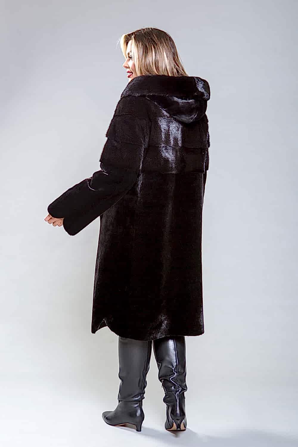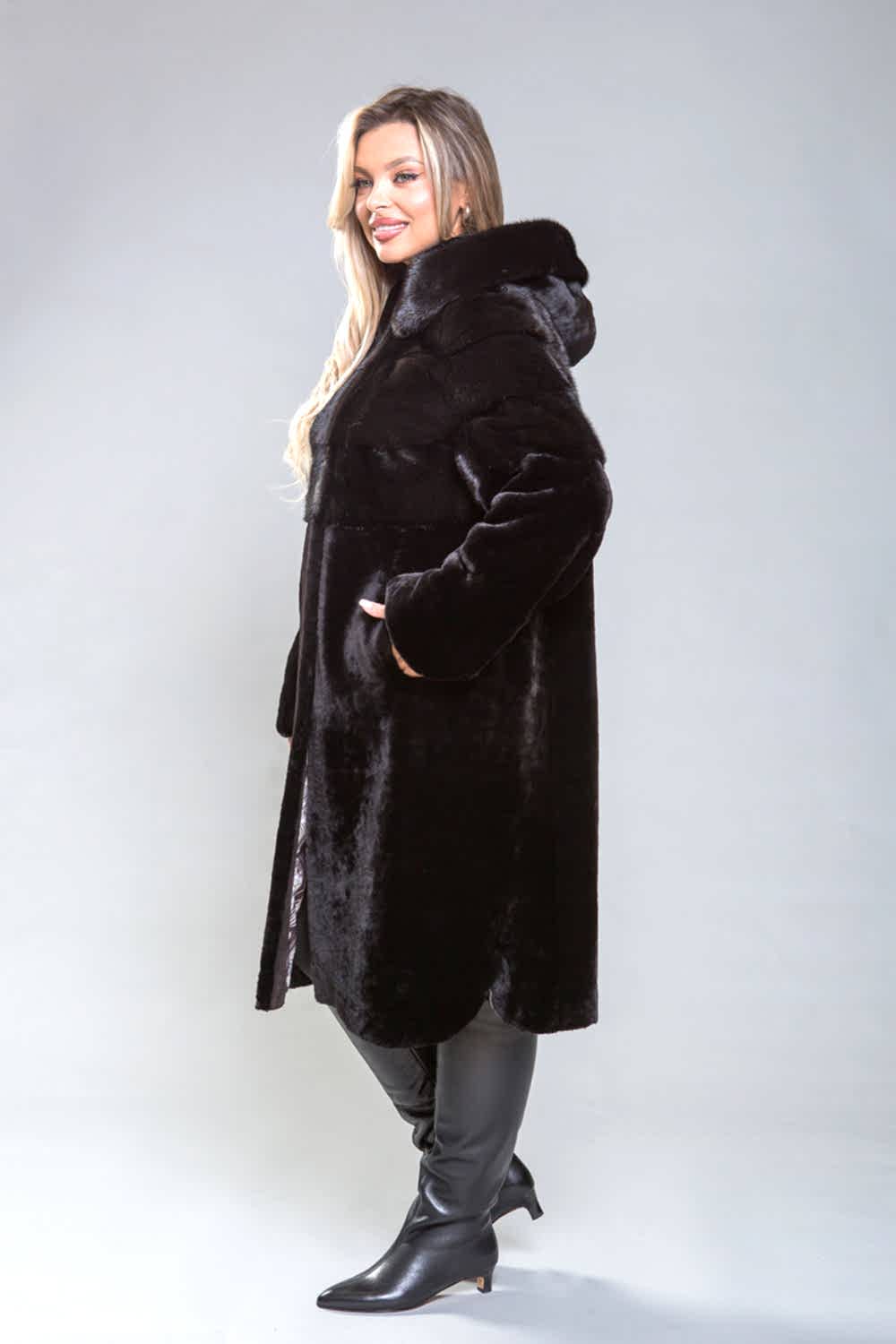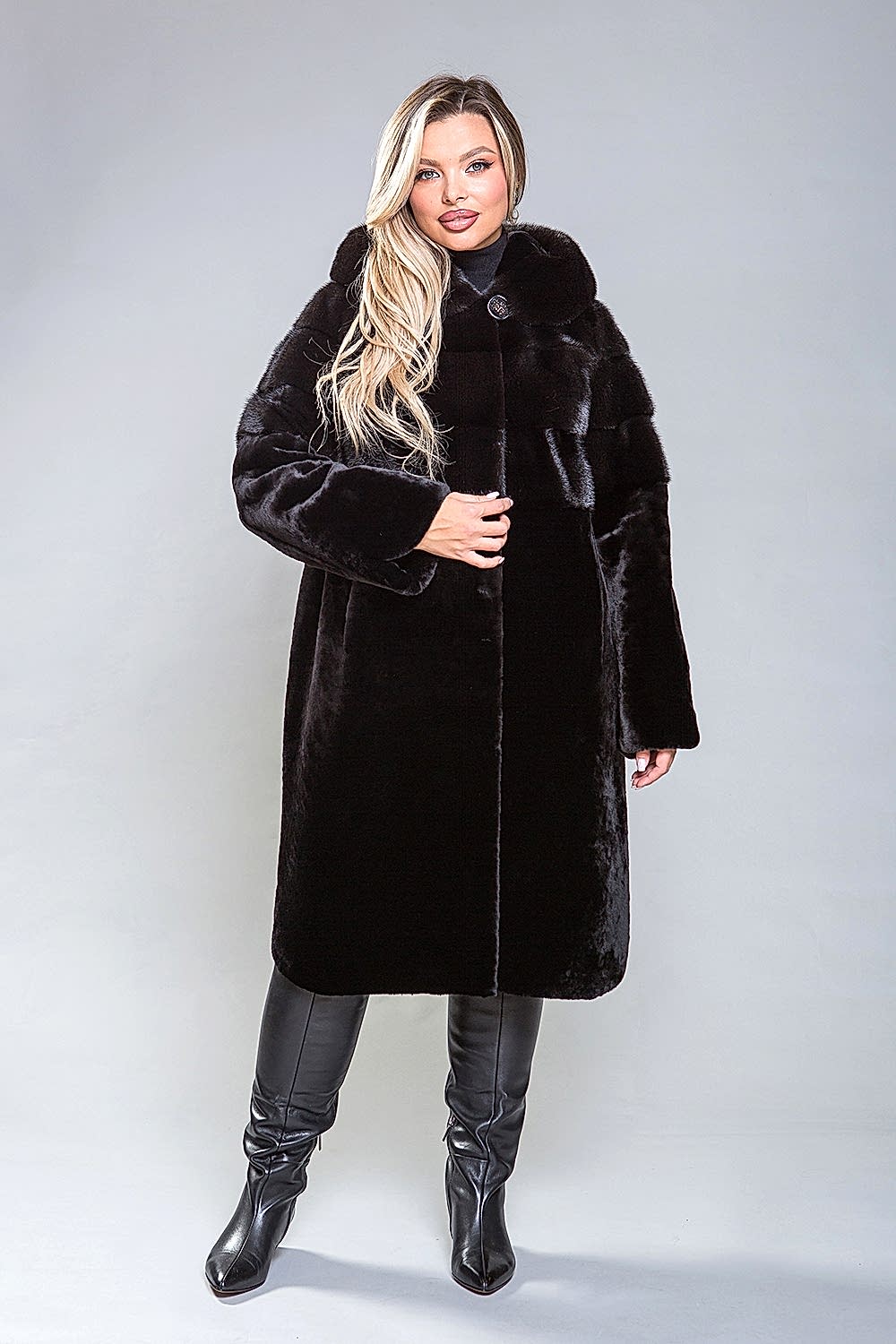 Полупальто из высококачественной овчины с роскошной отделкой из поперечной норки. Капюшон, передняя и задняя части, а также верхняя часть рукавов декорированы мехом норки. Изящные Pin-Up разрезы на рукавах и подоле добавляют утонченности модели. Длина изделия составляет 105 см. Благородный шоколадный оттенок гармонично вписывается в любой стиль. Это воплощение роскоши высшего класса!