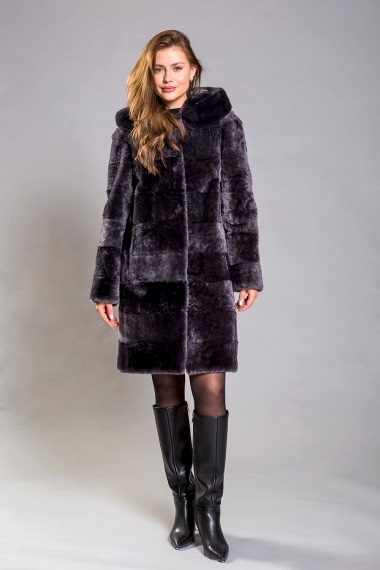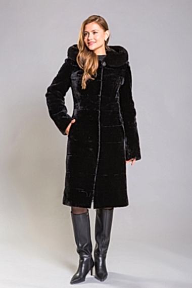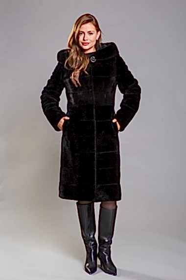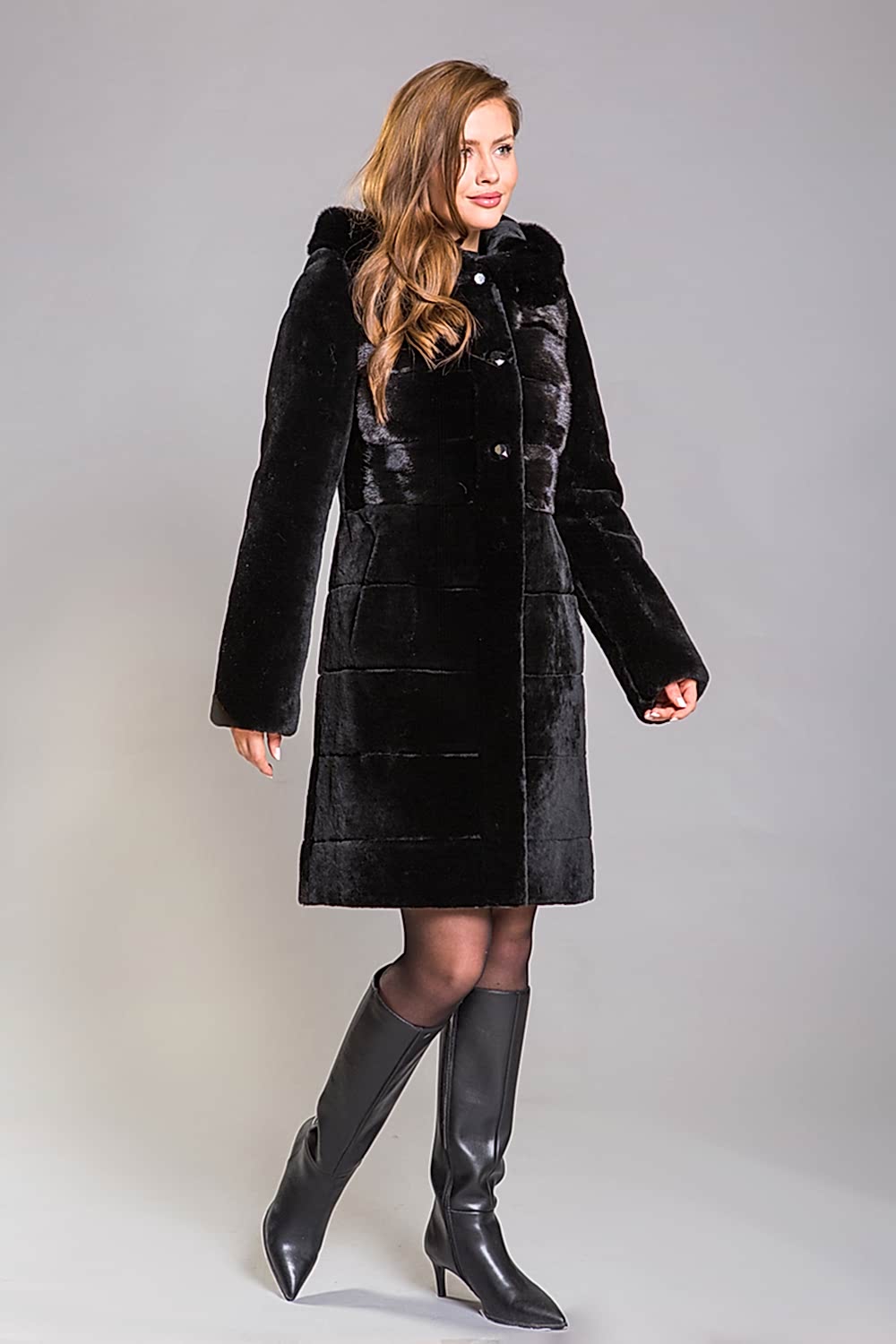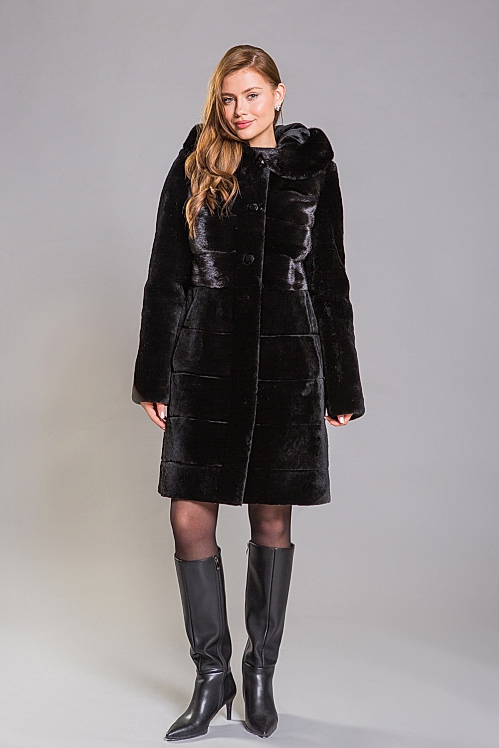 Полупальто из овчины с капюшоном, украшенным норковым мехом, - это воплощение стиля и Pin-Up идеально подходящее для холодных зимних дней. Пластинчатый крой придает модели современный и утонченный вид.