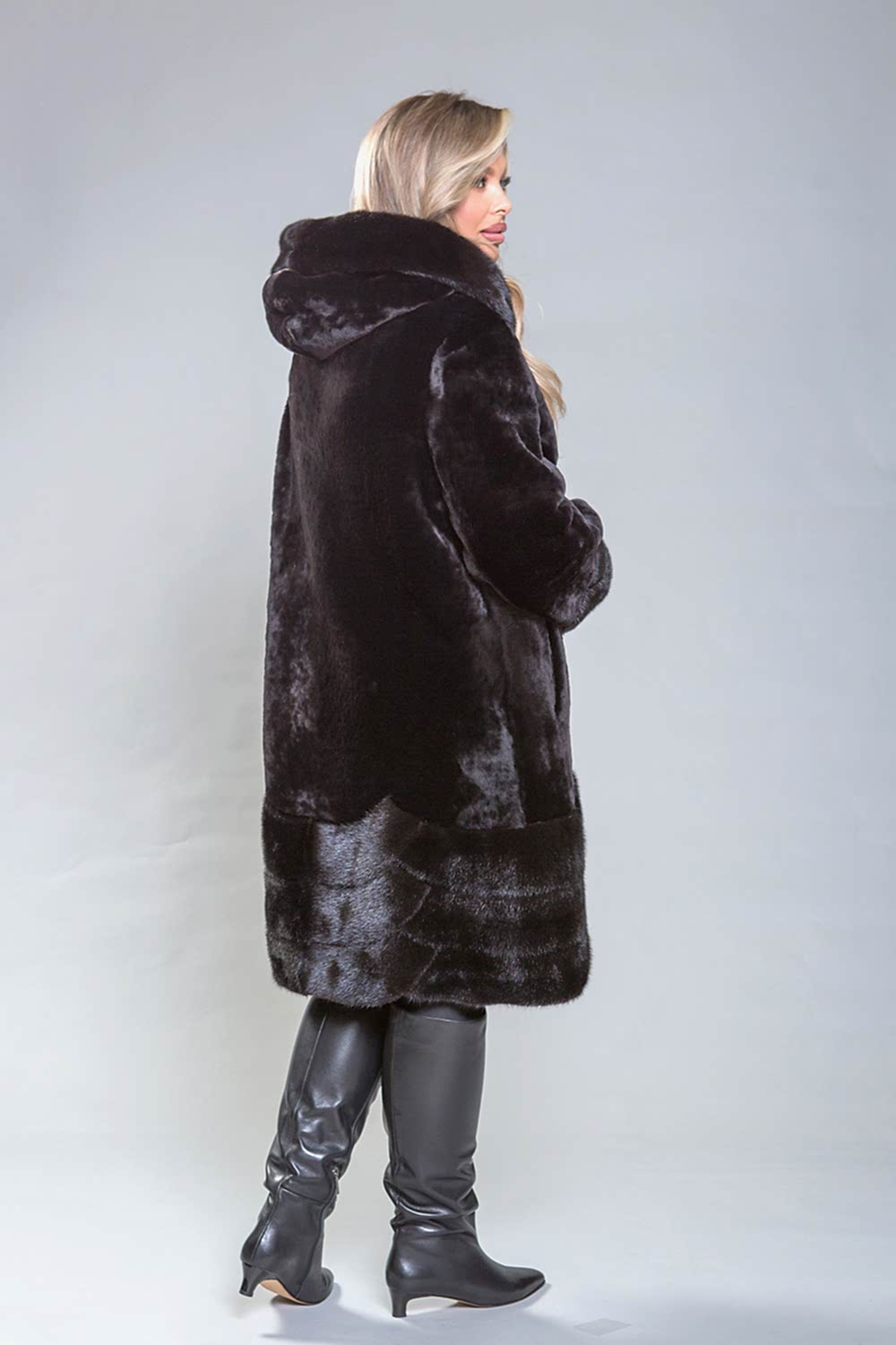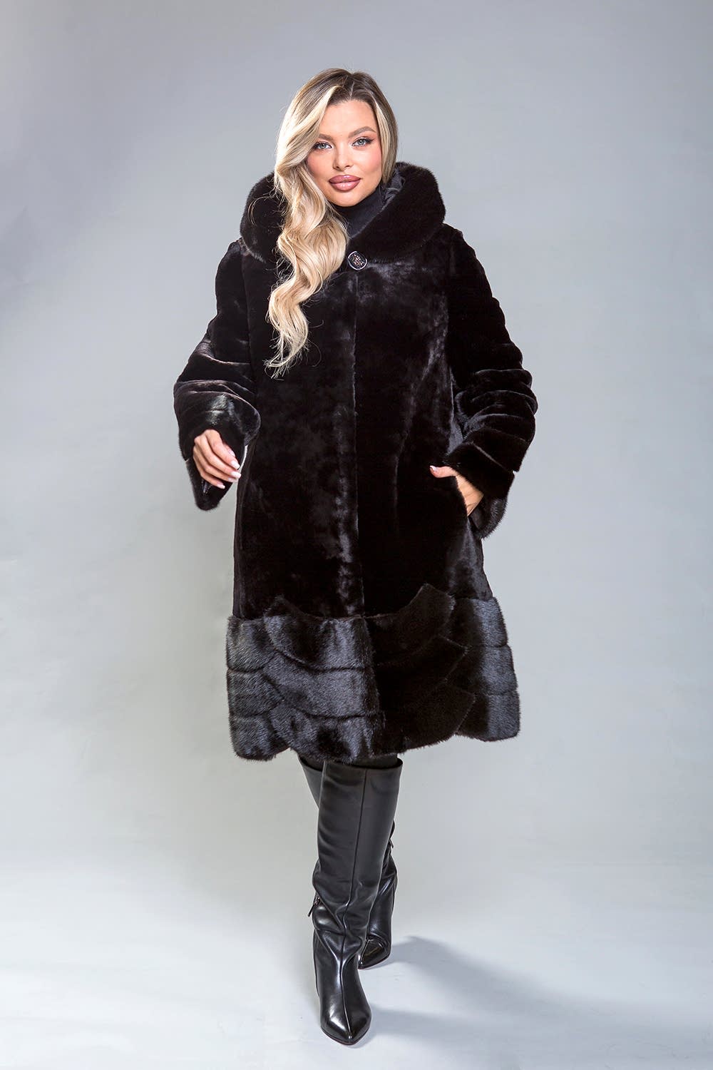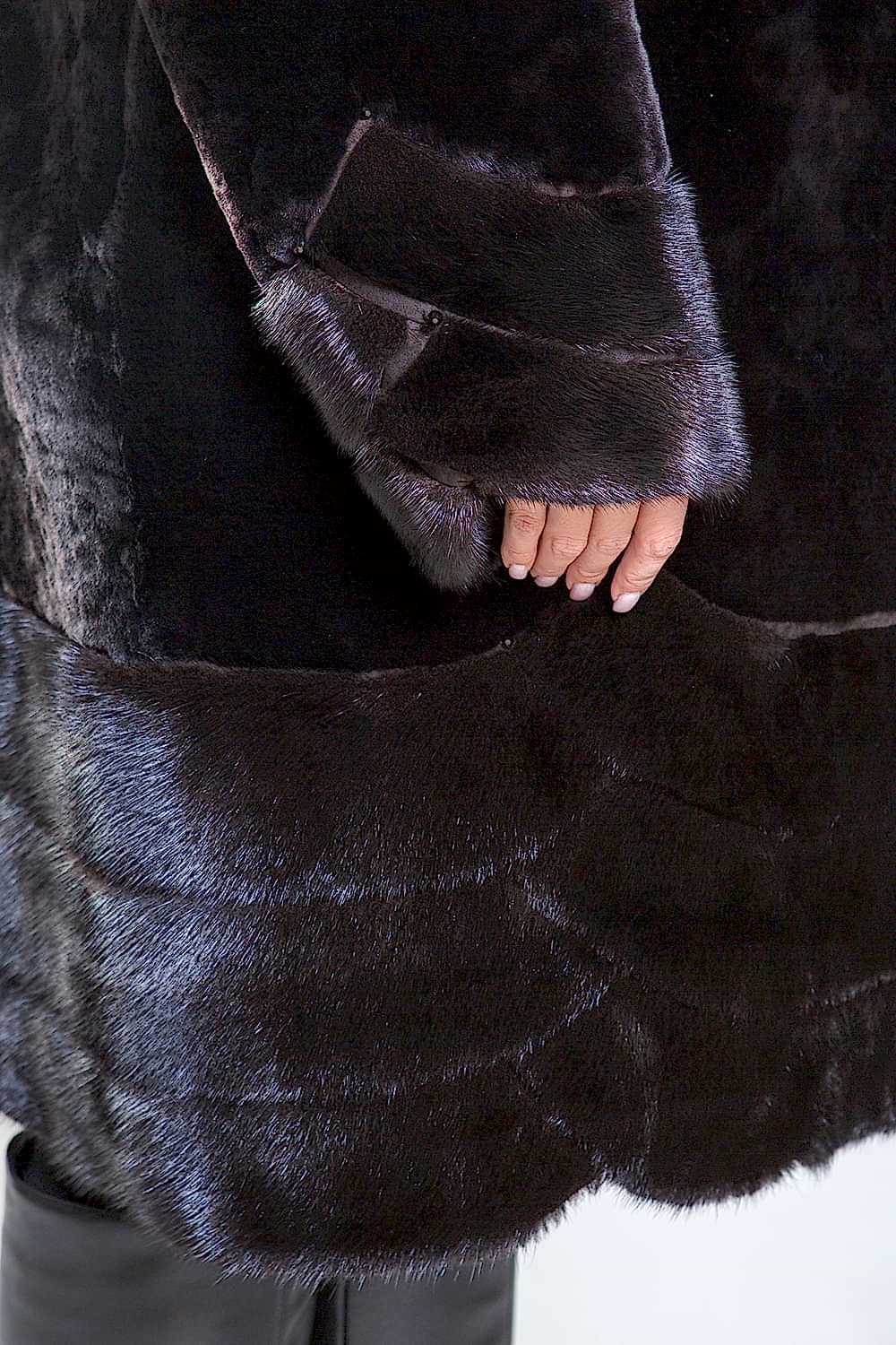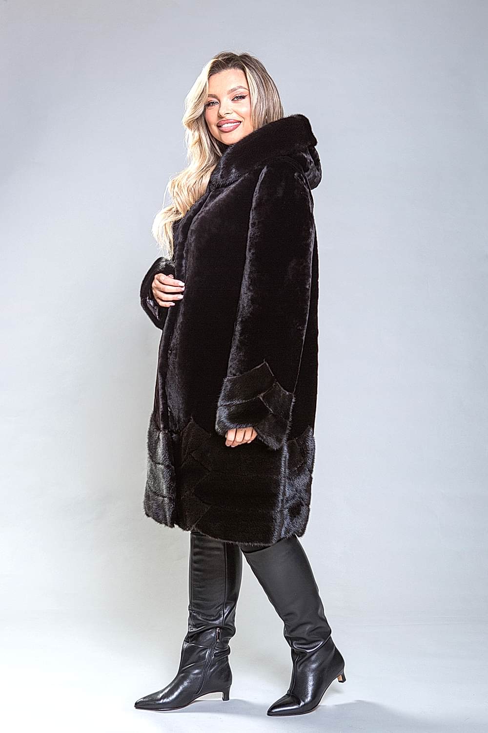 Роскошное полупальто из овчины с изысканными элементами. Рукава, капюшон и низ модели выполнены из норки, украшенной геометрическими узорами и мелкими стеклянными бусинами. Высококачественная овчина класса люкс обеспечивает тепло и комфорт, сохраняя свои свойства даже при повышенной влажности. Капюшон фиксируется на пуговицу, а шуба - на металлические клипсы. Длина изделия составляет 100 сантиметров, что делает его идеальным для повседневного использования. Легкий вес и отличное сохранение тепла делают это полупальто незаменимым Pin-Up гардероба.