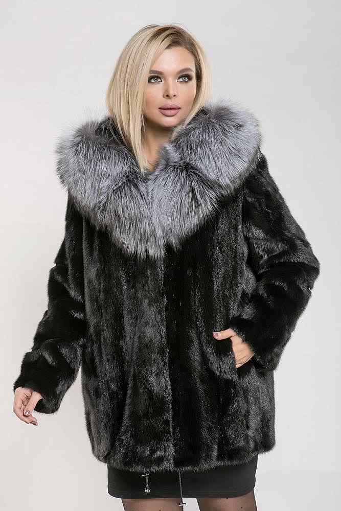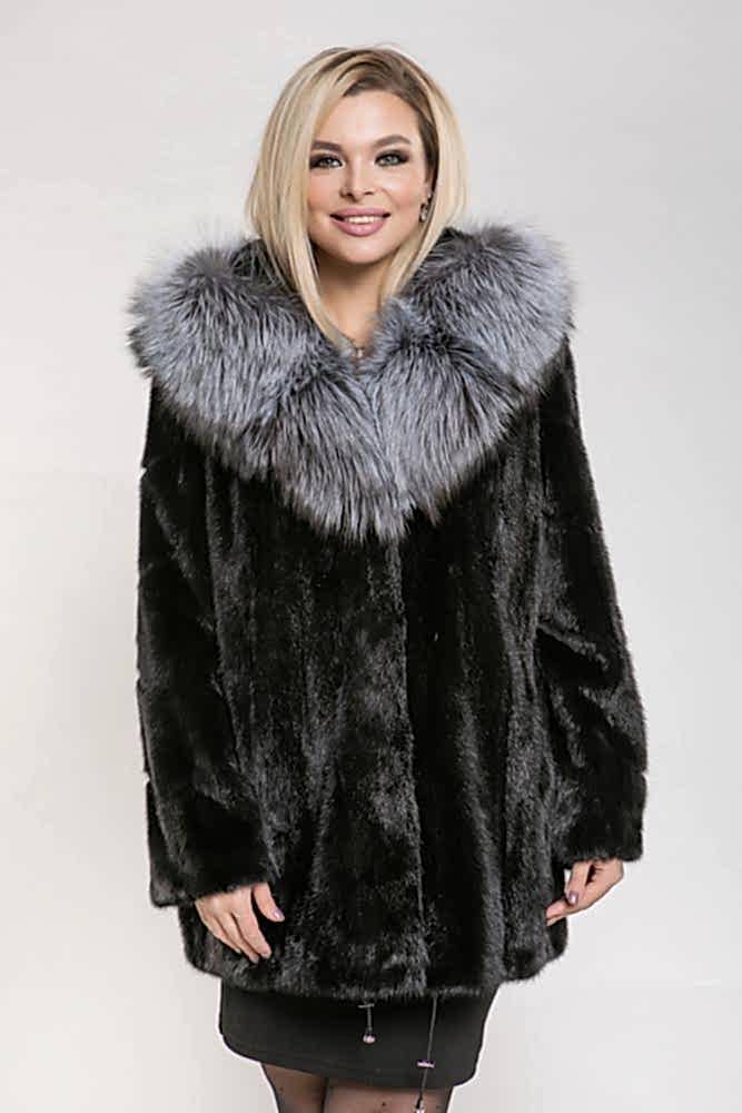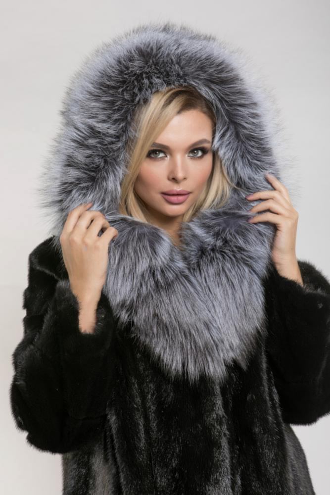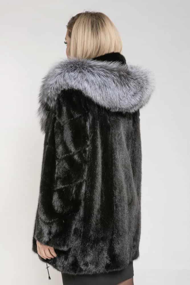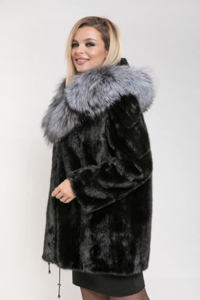 Эта куртка сшита из меха норки, а её капюшон украшен чернобурым лисьим мехом. Крой изделия выполнен в роспуск, а рукава сшиты из Pin-Up выложенных по диагонали.