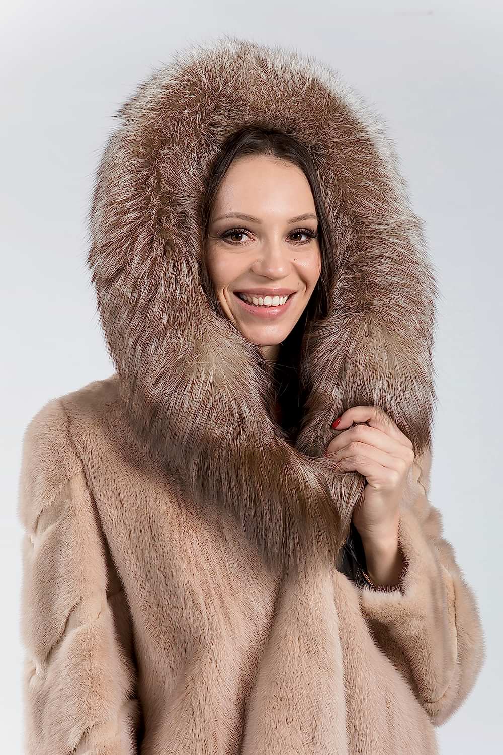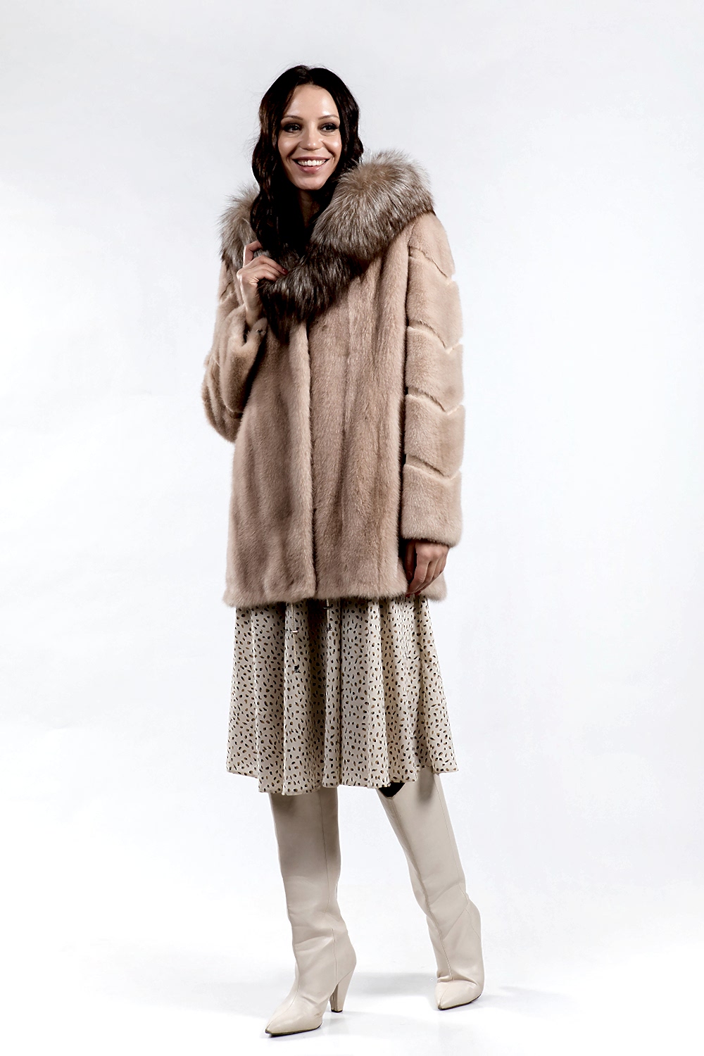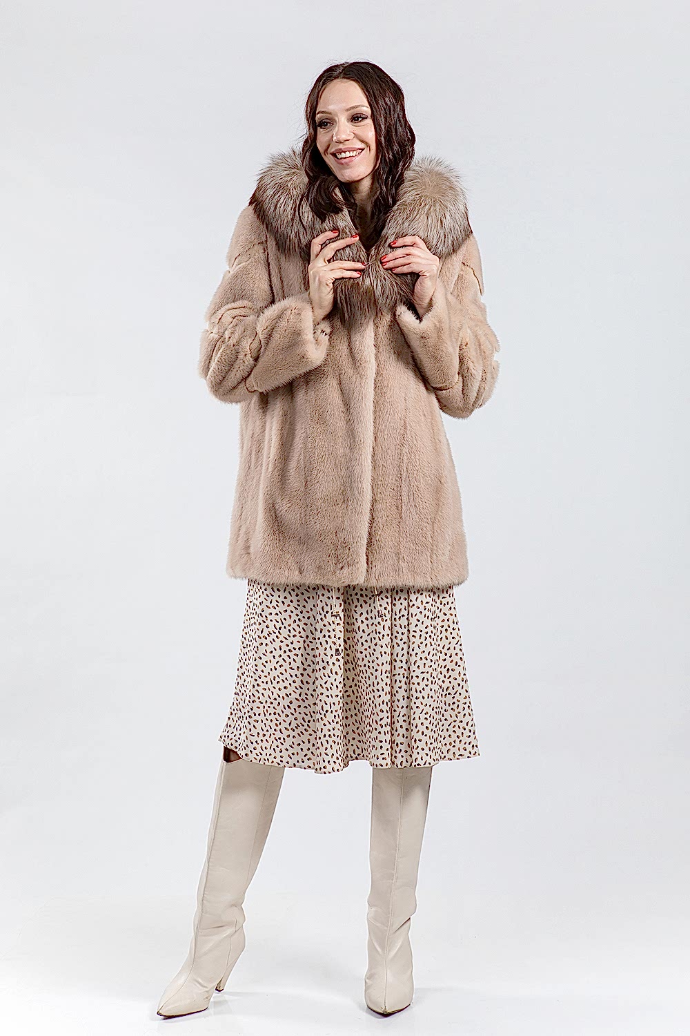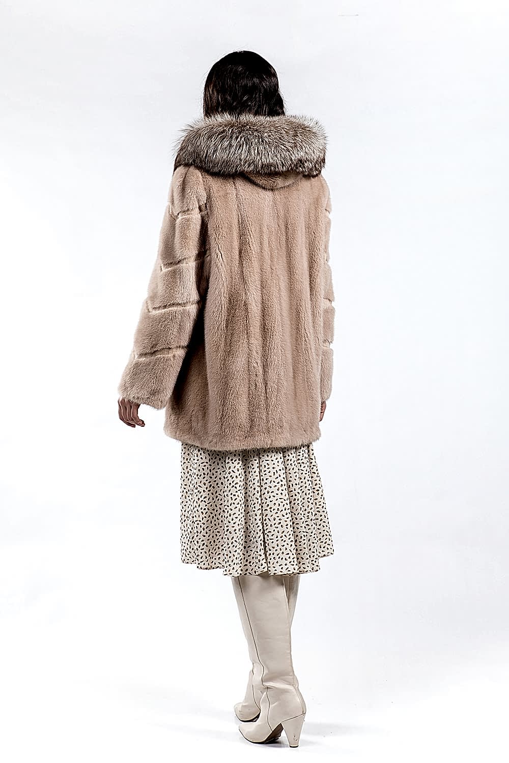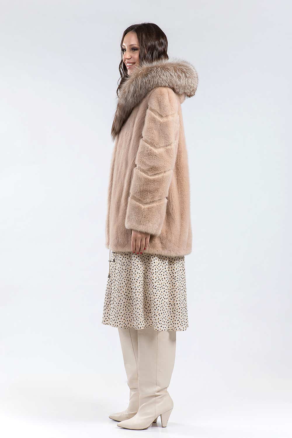 Норковая куртка с капюшоном, отороченным лисьим мехом. Модель выполнена в технике роспуска с добавлением пластин. Рукава украшены диагональной выстрижкой. В нижней части и на рукавах Pin-Up регулируемые утяжки. Длина куртки составляет 80 см. Она имеет универсальный крой, подходящий для любого типа фигуры. Нежный оттенок циркона придает образу свежесть и женственность.