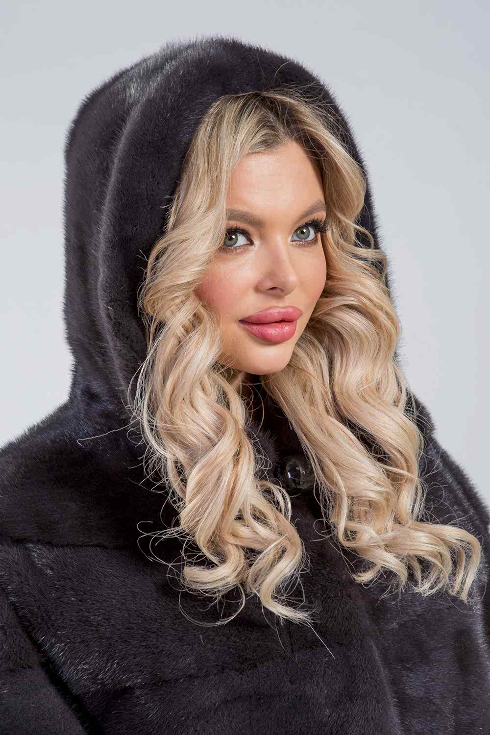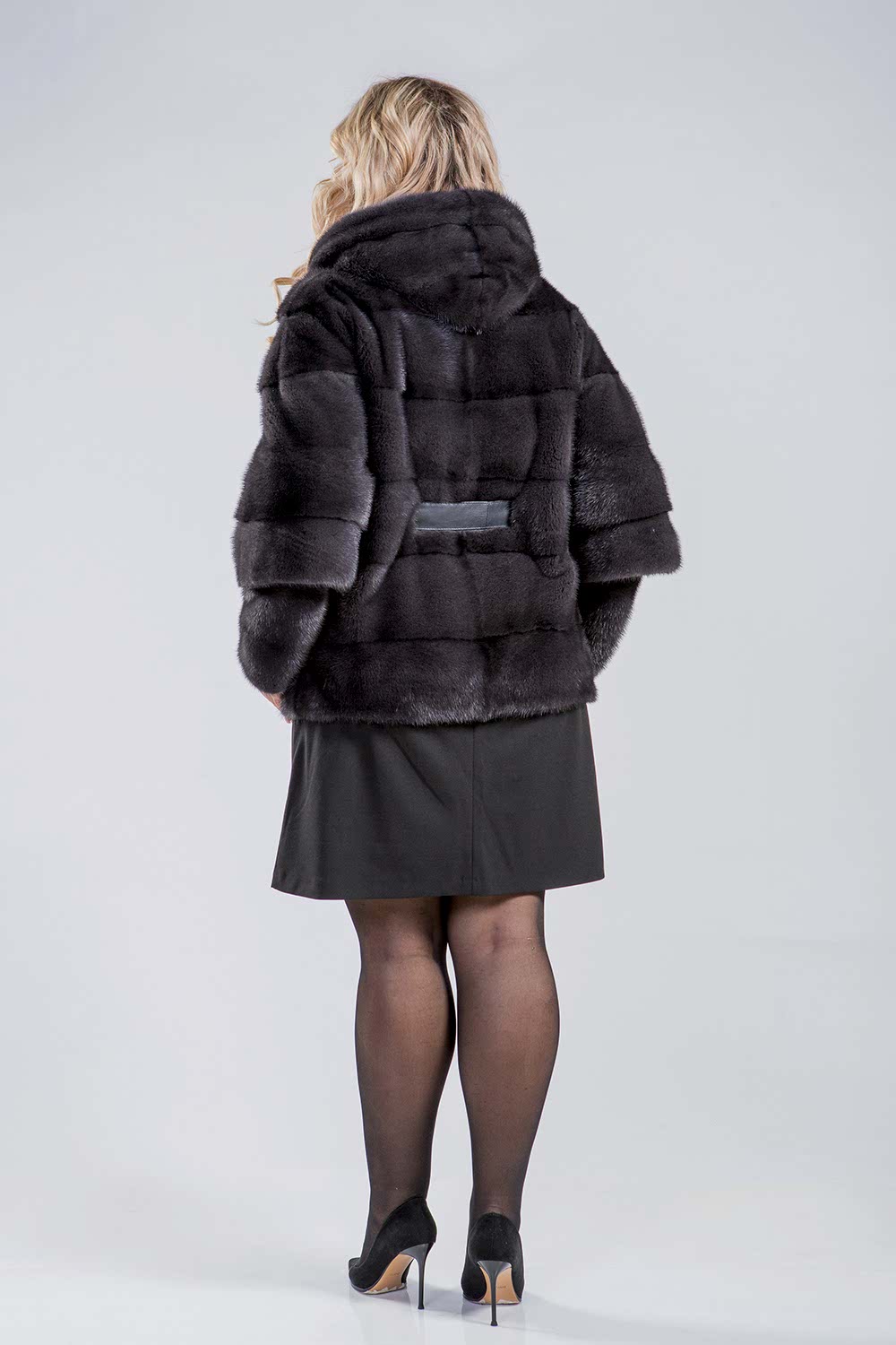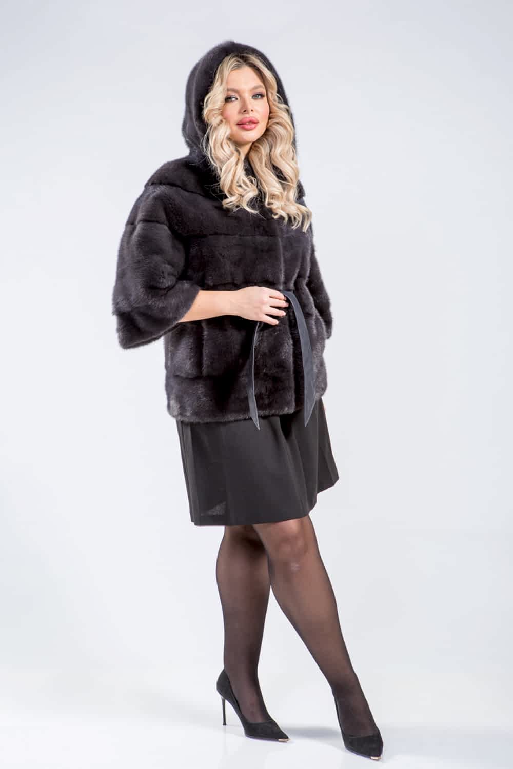 Куртка из норкового меха с капюшоном, скроенная по диагонали из отдельных пластин. Её рукава отстёгиваются и могут быть Pin-Up что делает эту модель особенно функциональной. Длина изделия составляет 70 см.