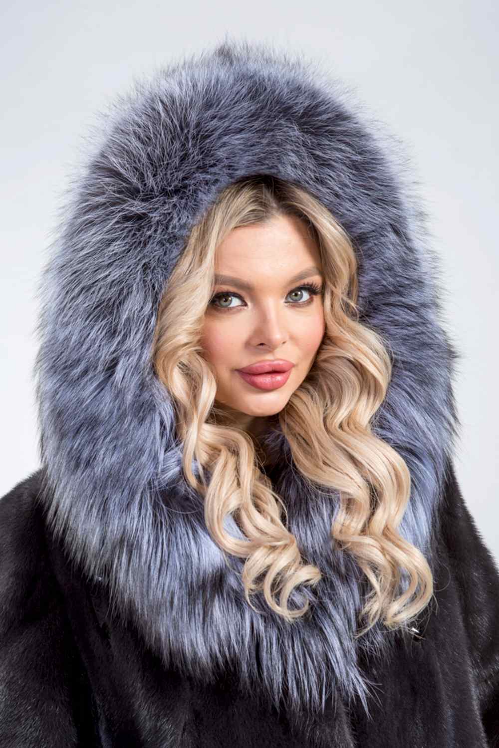 Эта очаровательная норковая курточка имеет капюшон, украшенный мехом чернобурой лисы. Крой изделия выполнен в технике роспуска с добавлением пластин. Рукава и спинка украшены выстрижкой и стразами, что придает модели особый шарм. Низ курточки и рукава слегка присборены. Длина изделия составляет 80 см, что Pin-Up его универсальным и подходящим для любого типа фигуры. А роскошный объёмный капюшон из лисы станет отличным решением для тех, кто не любит носить головные уборы!