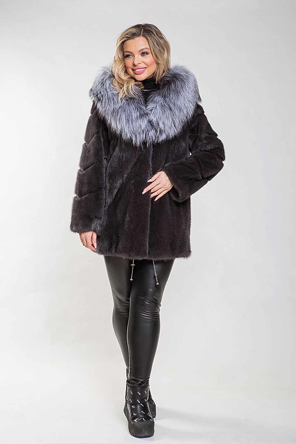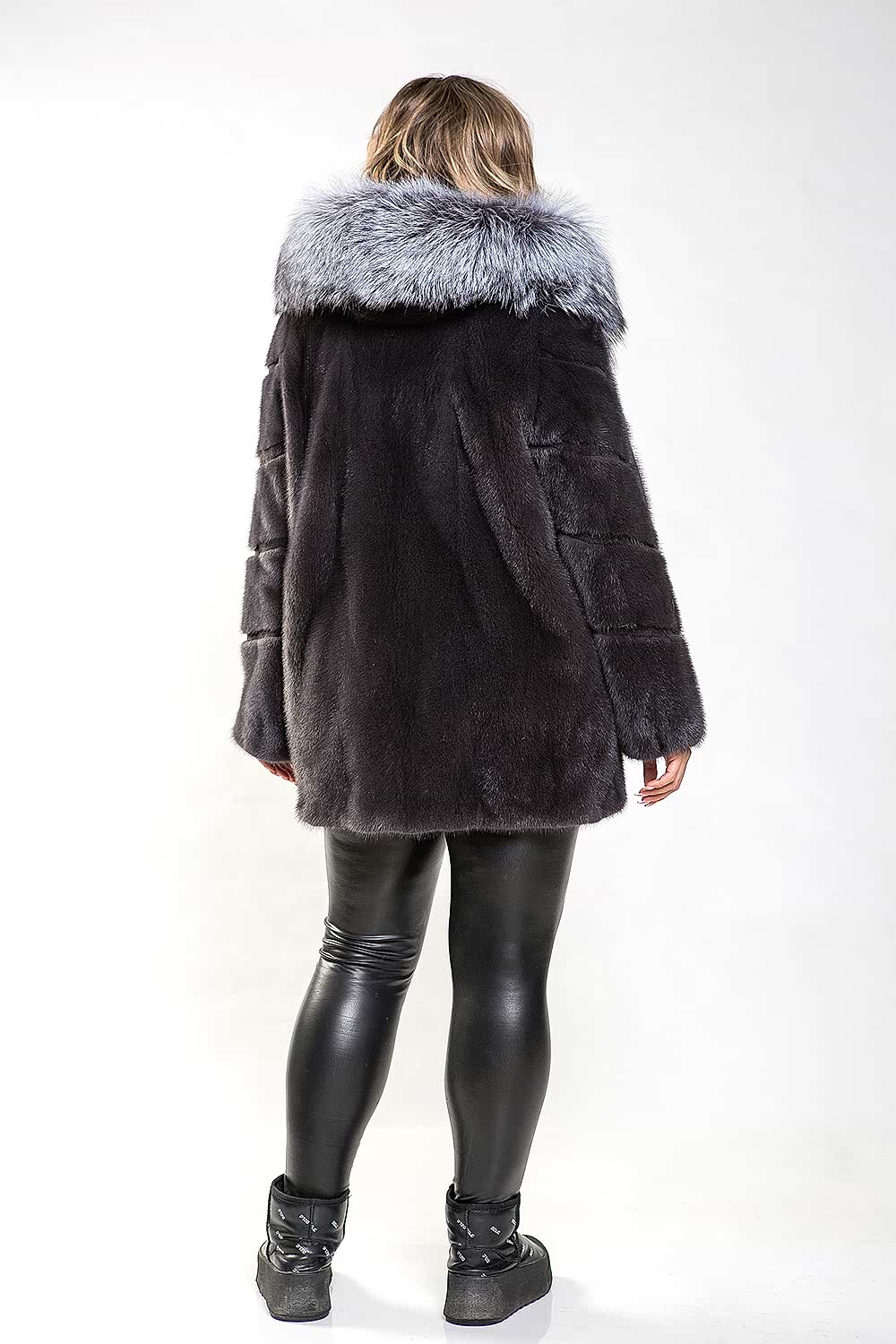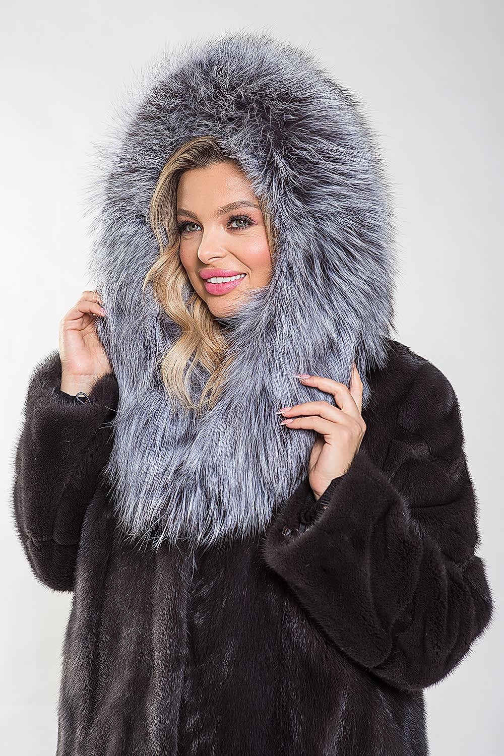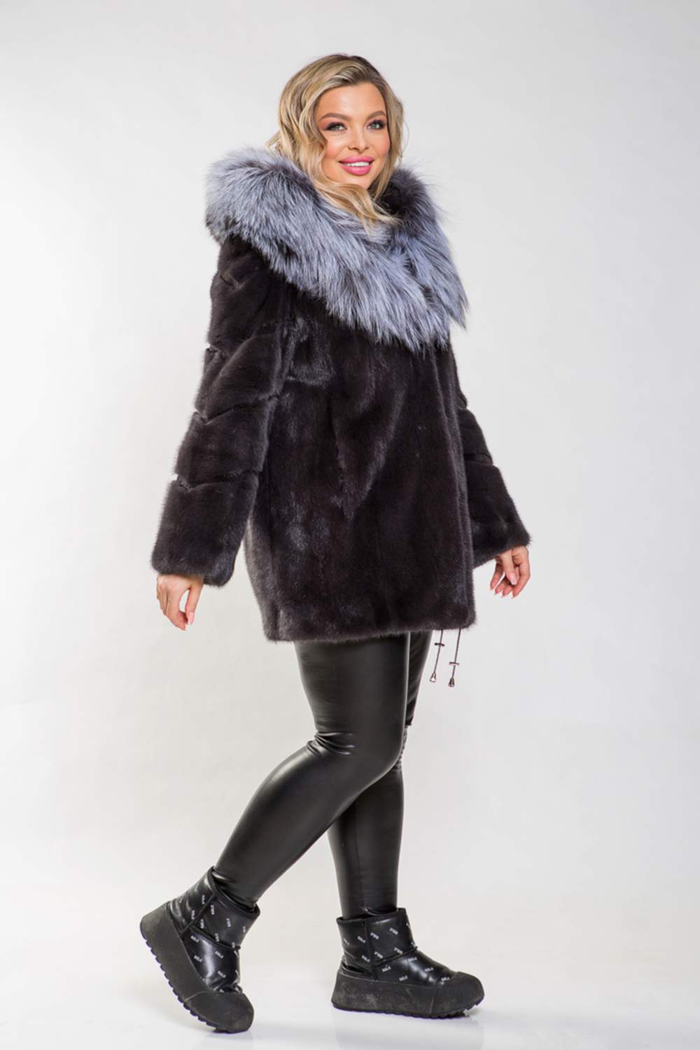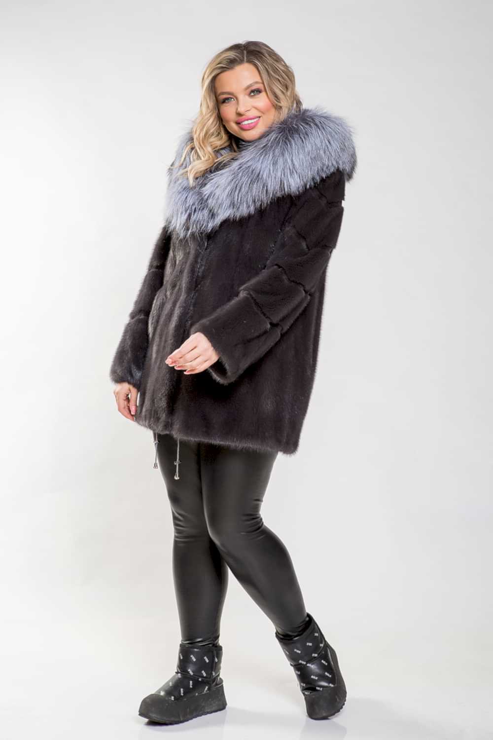 Куртка из норкового меха, украшенная роскошным капюшоном из чернобурой лисы. Модель выполнена в классическом прямом силуэте, а по низу изделия Pin-Up регулирующая утяжка. Рукав представляет собой диагональную выкладку пластин с декоративной выстрижкой меха. Длина изделия составляет 80 см.