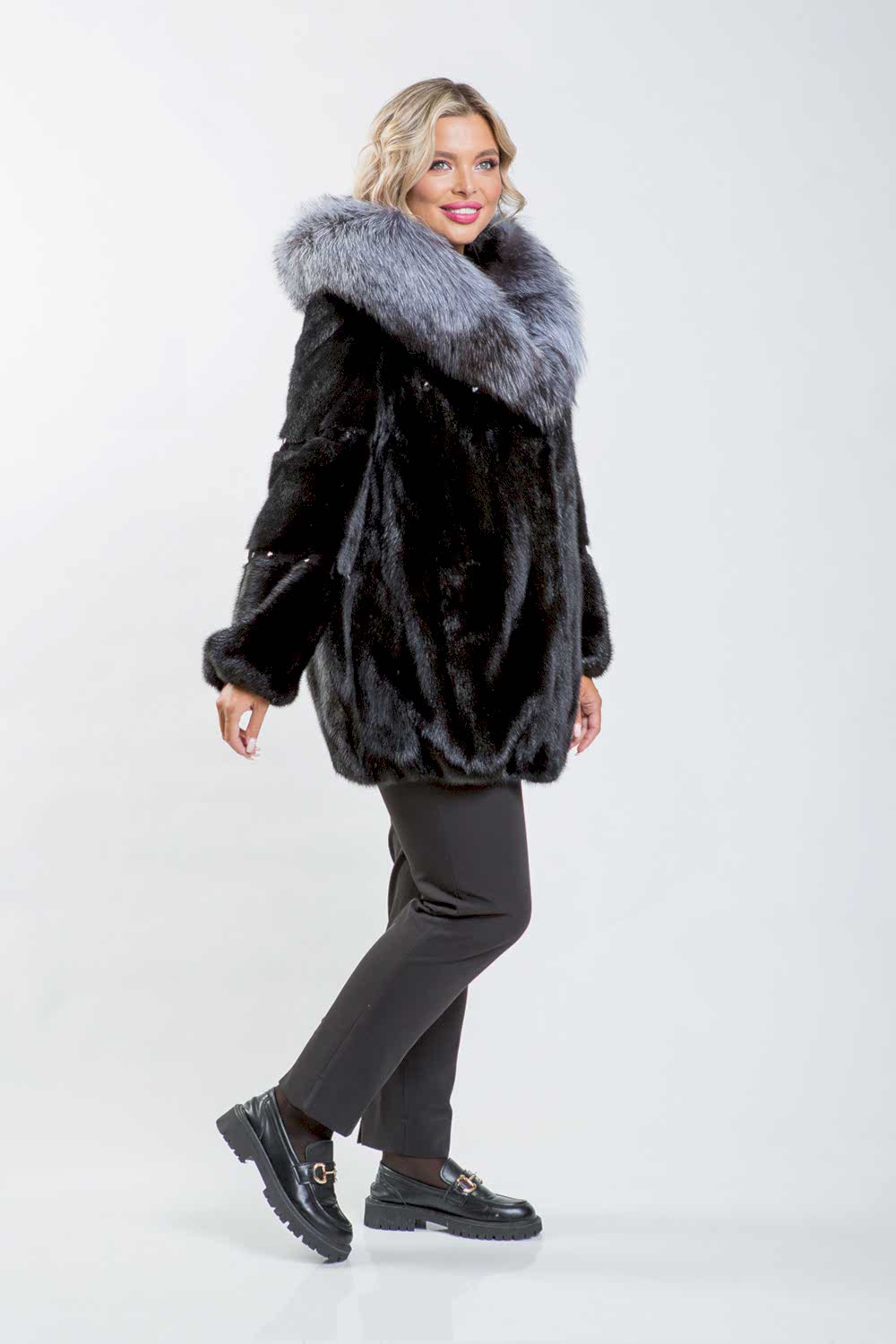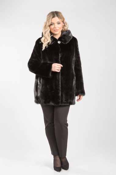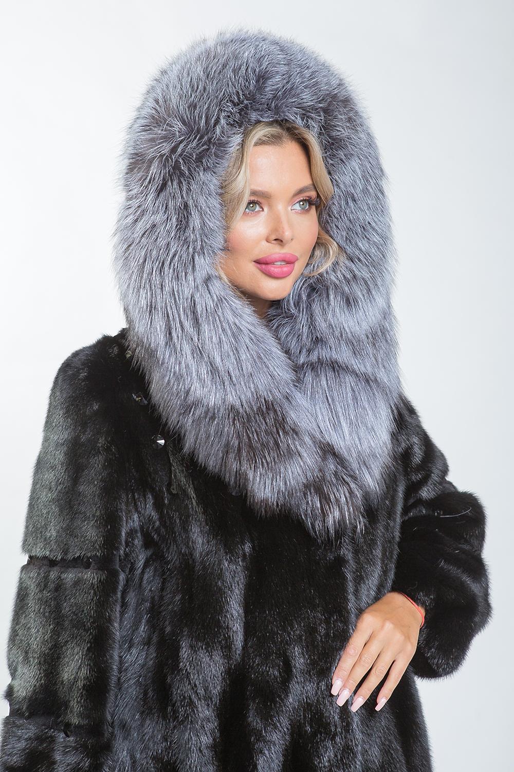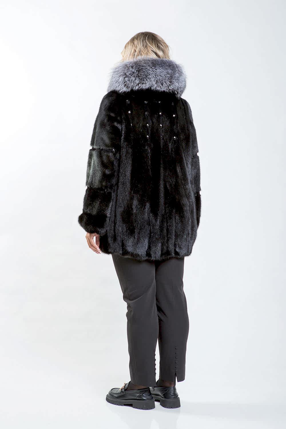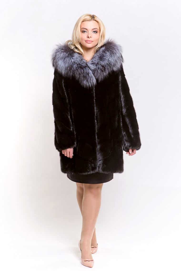 Эта курточка выполнена из меха норки, а капюшон украшен мехом чернобурой лисы. Модель кроится по технологии роспуска с добавлением пластин. Рукава и спинка Pin-Up оригинальной выстрижкой и стразами. Низ куртки и рукава слегка присобраны. Длина изделия составляет 80 см.