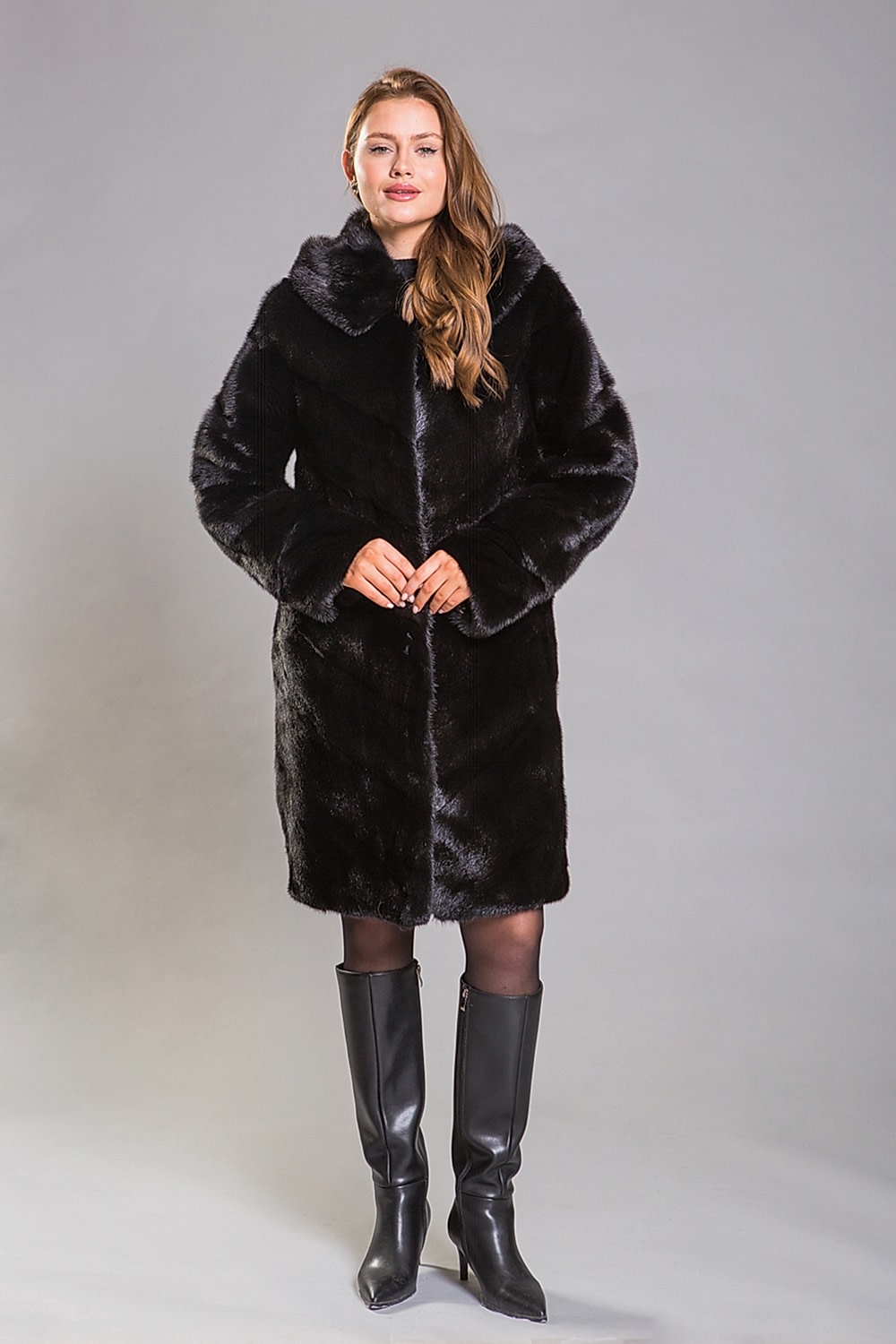 Pin-Up полупальто составляет 100 сантиметров. Благодаря своему универсальному фасону, эта шубка подойдёт для любого типа фигуры!