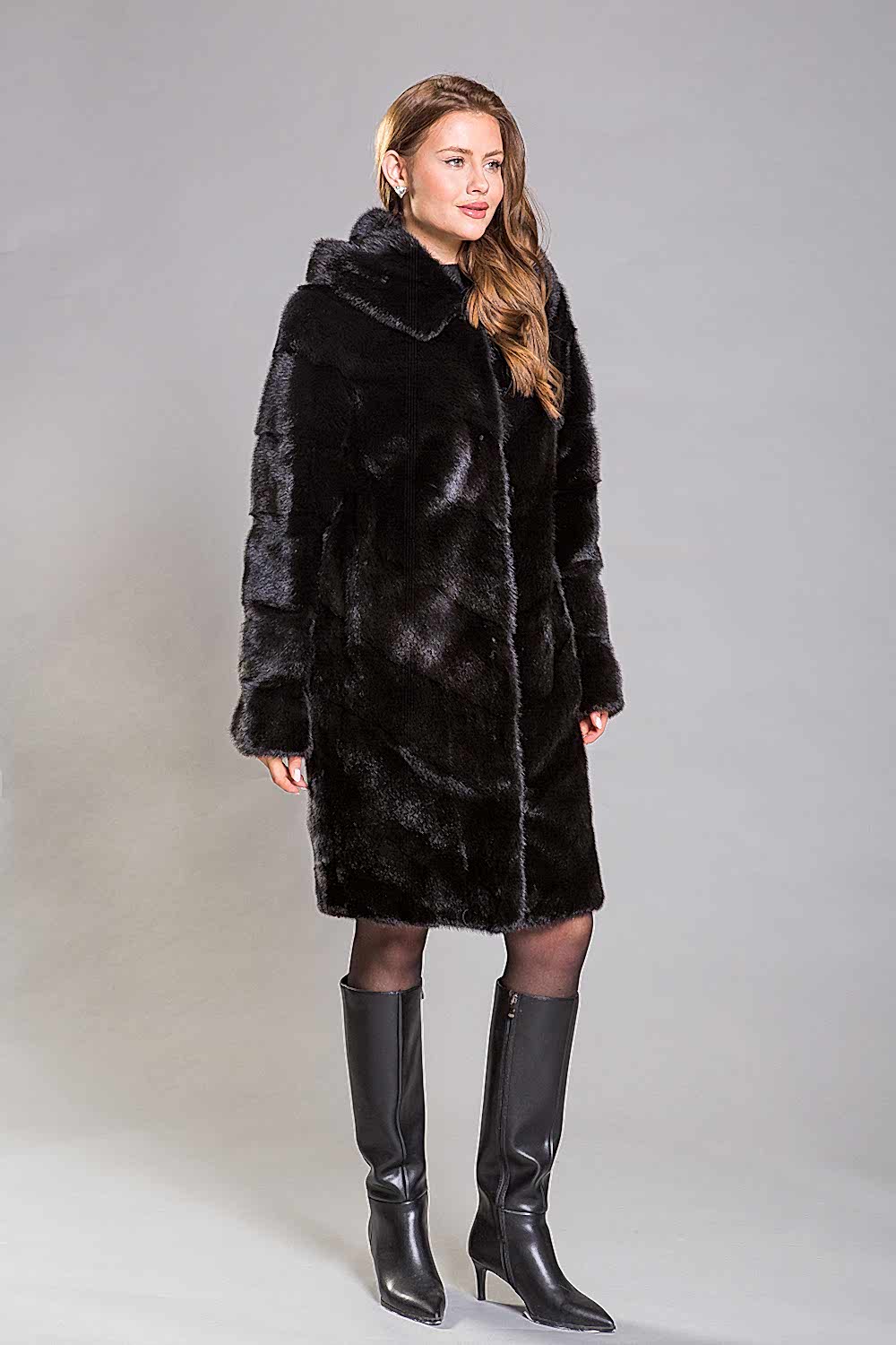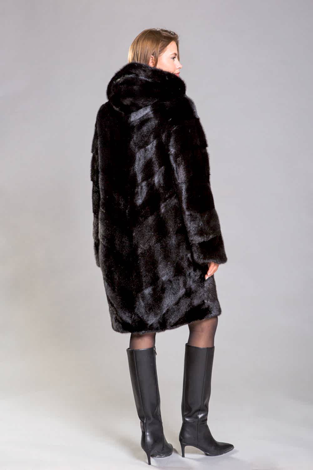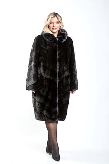 Полупальто из норкового меха с Pin-Up созданное в уникальном стиле диагональной выкладки пластин. Эта модель оснащена регулирующими утяжками в трёх ключевых местах: на талии, на рукавах и по низу изделия, что обеспечивает идеальную посадку шубки на фигуре.