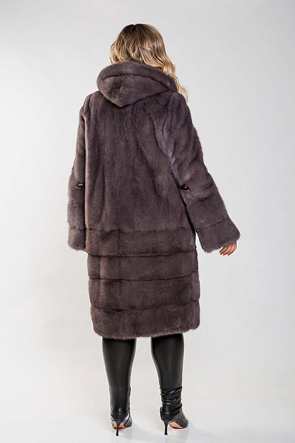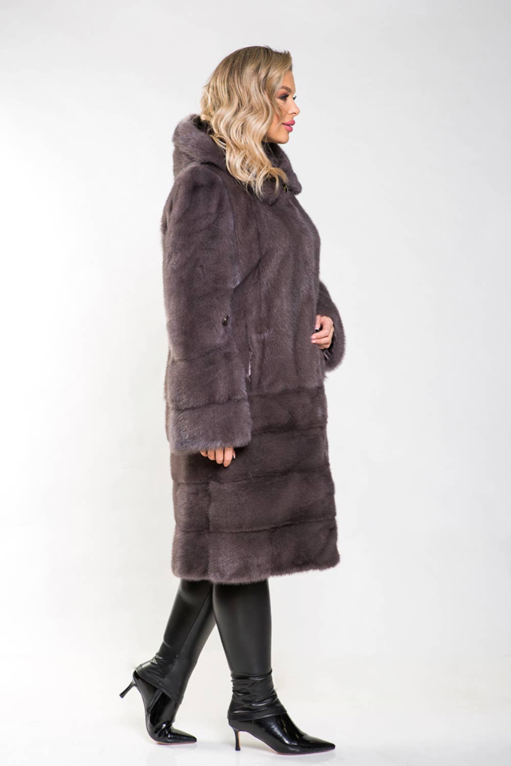 Полупальто из норки с капюшоном - стильная модель, отличающаяся необычным кроем. Верх изделия Pin-Up в виде роспуска, а низ - из поперечно выложенных пластин.