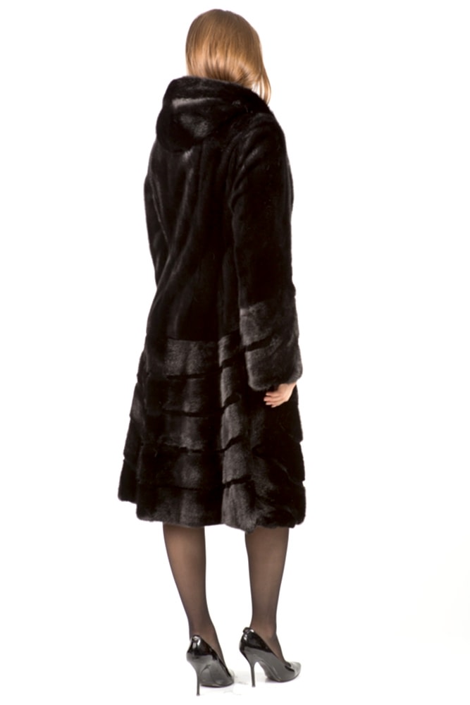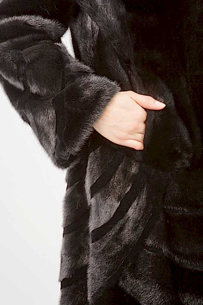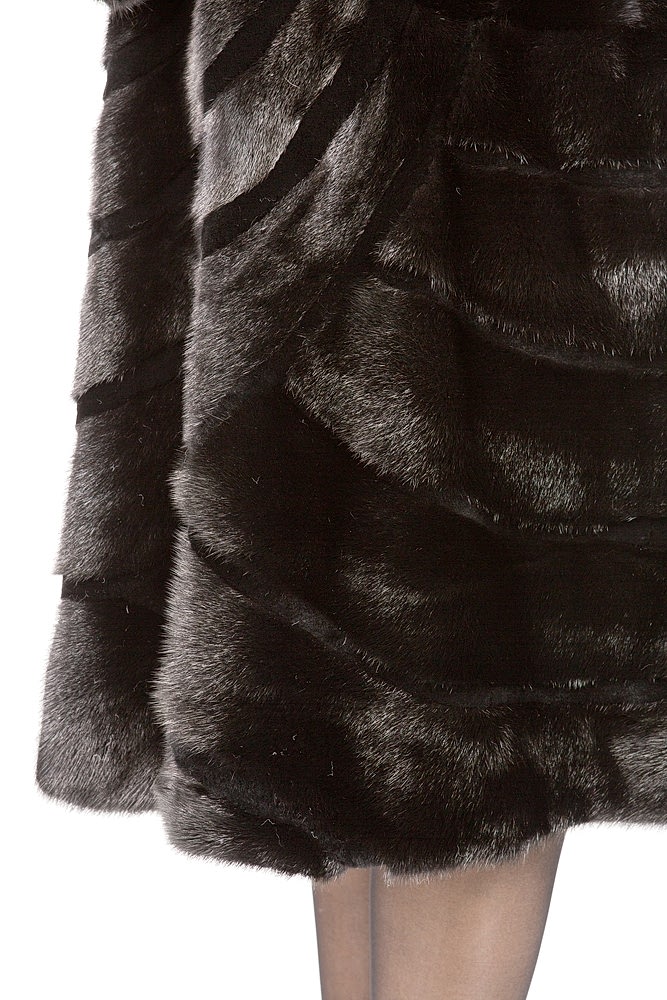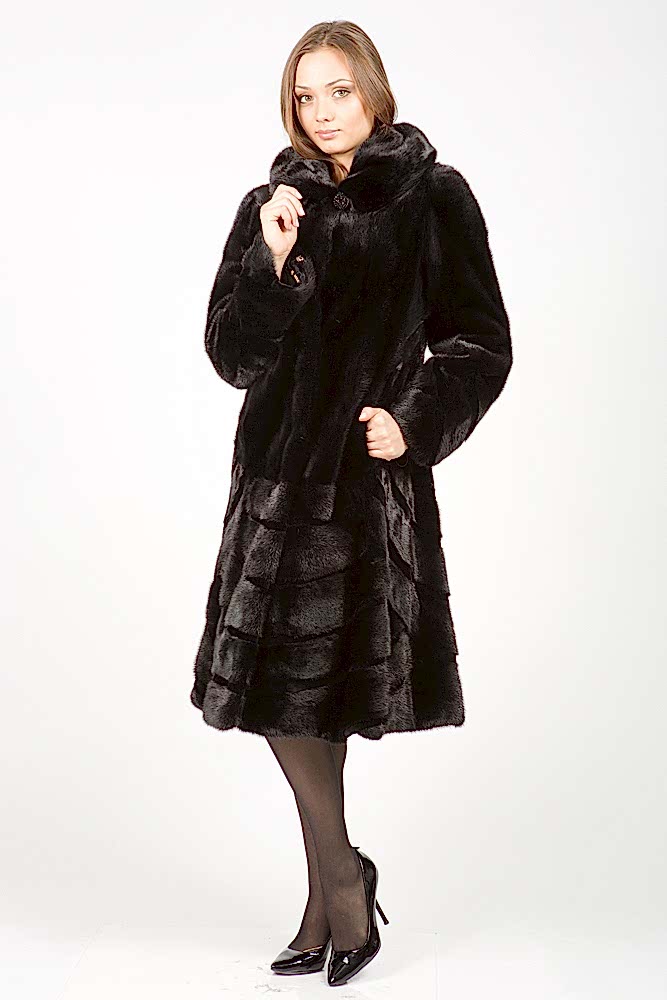 Полупальто из меха норки с капюшоном. Крой изделия роспуск с добавлением пластин. На талии и рукавах модели имеются Pin-Up утяжки. Низ мехового пальто расклешен и декорирован фигурной выстрижкой. Длина изделия 110 с