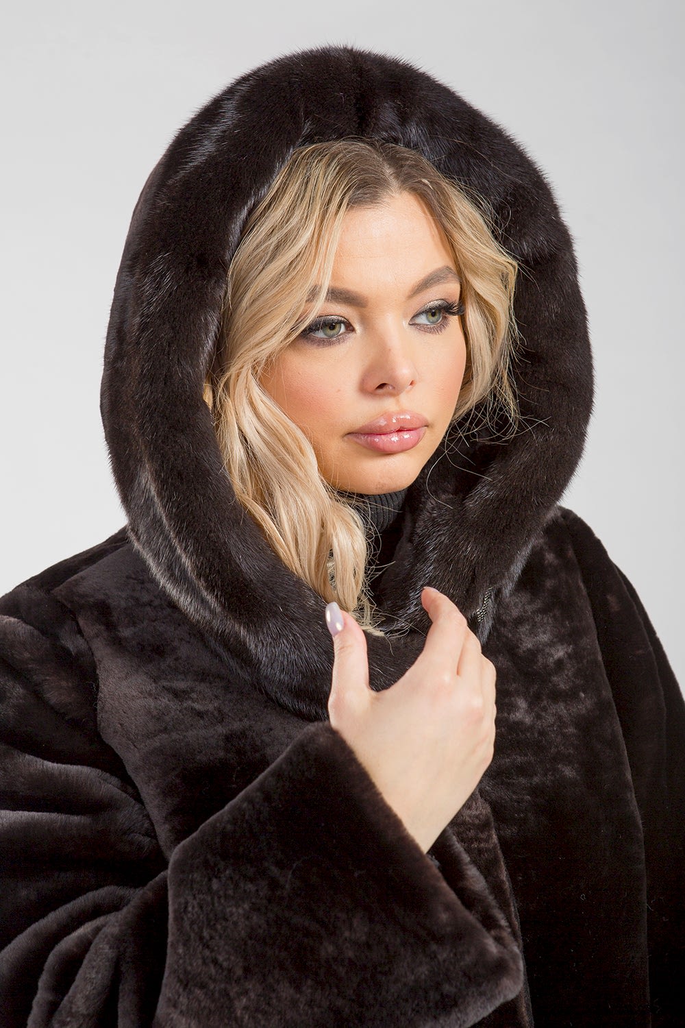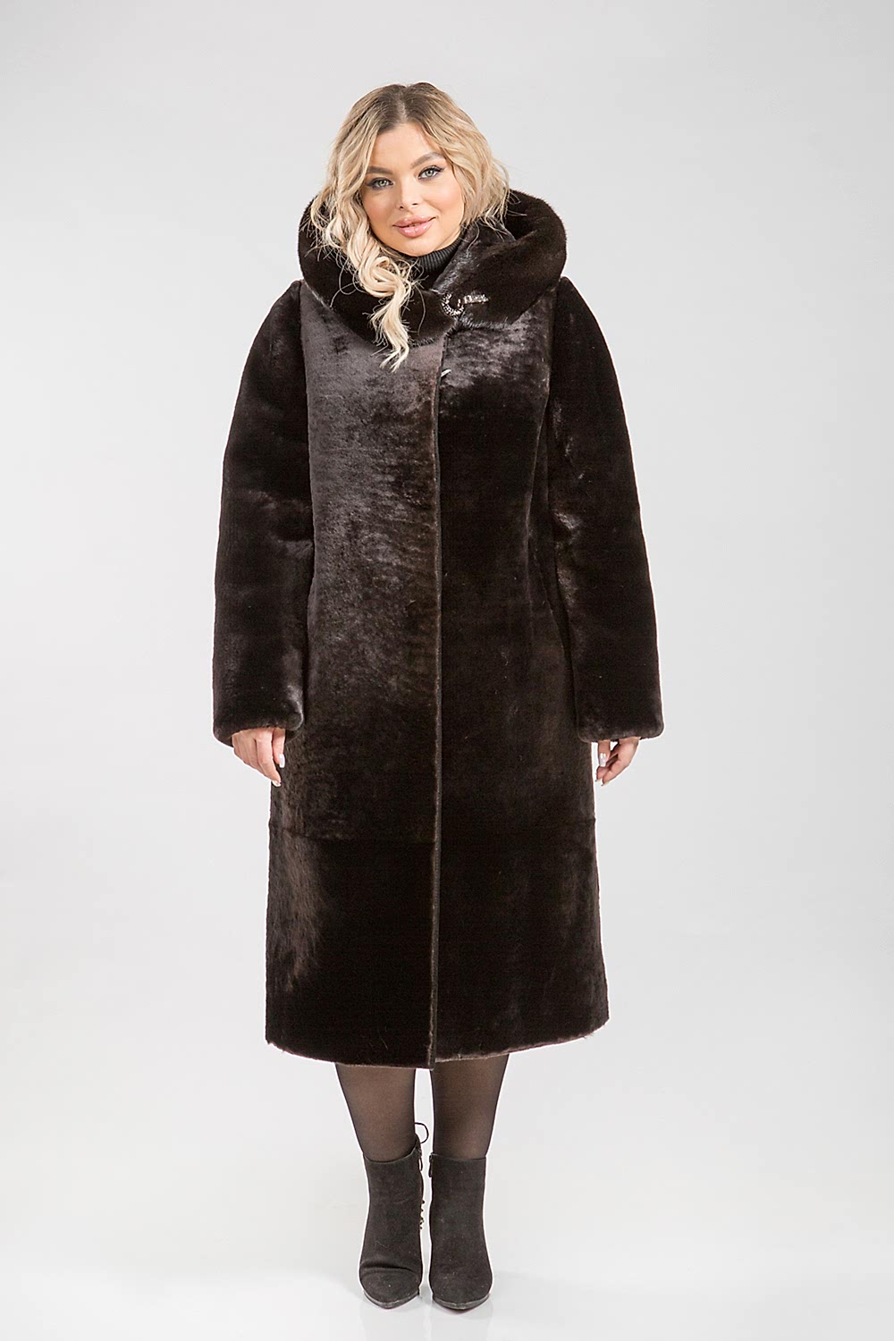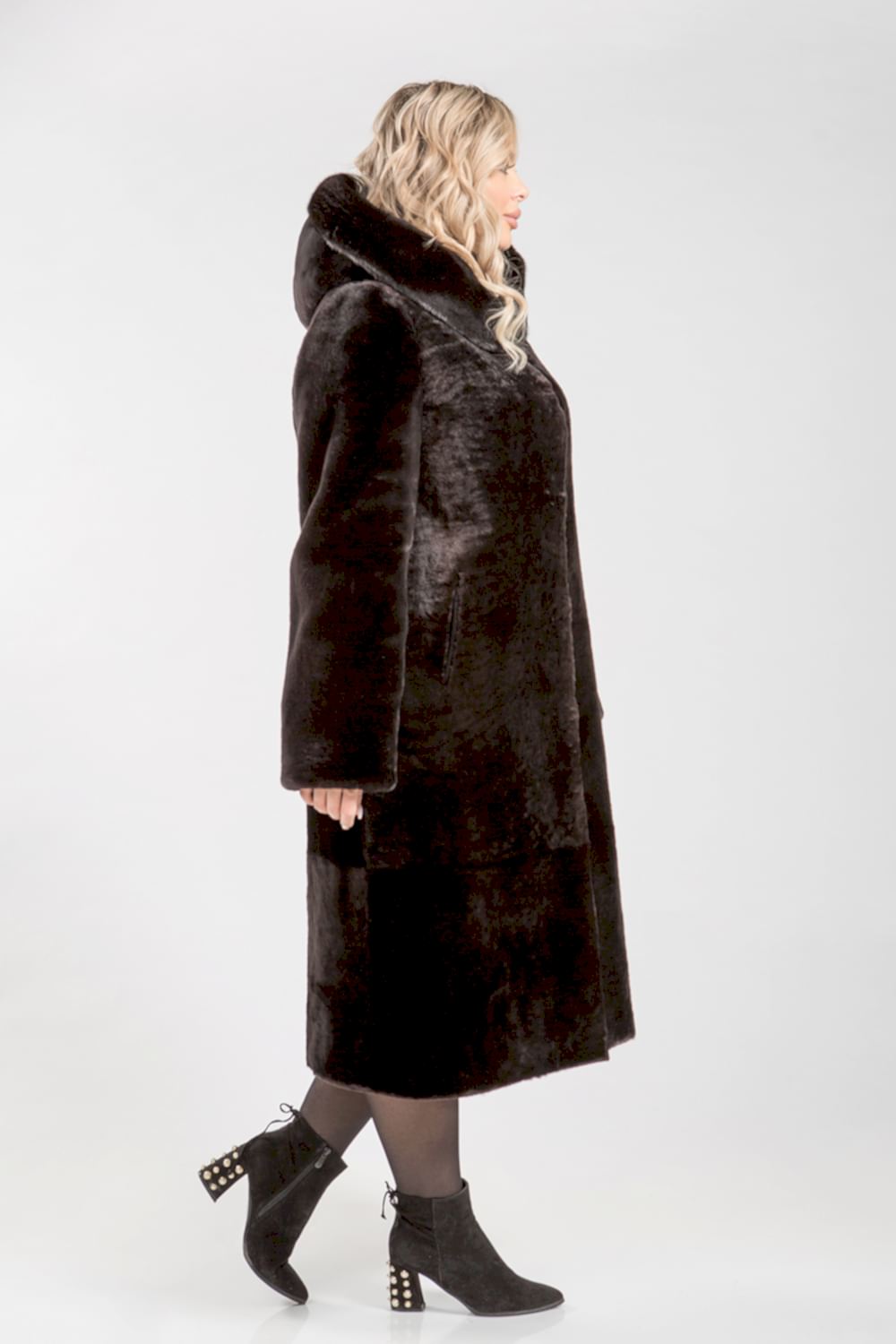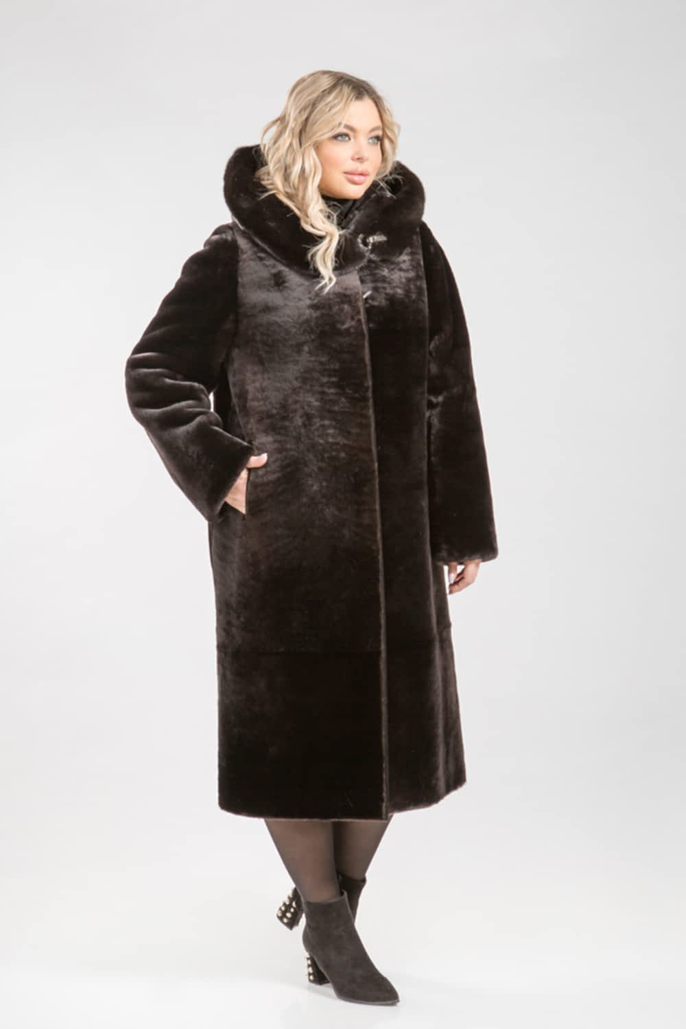 Полупальто из овчины, декорированное капюшоном из меха норки. Рукава можно подвернуть, создав Pin-Up или укоротить, если это необходимо. Карманы и борта модели отделаны натуральной кожей. Длина изделия составляет 115 сантиметров.
