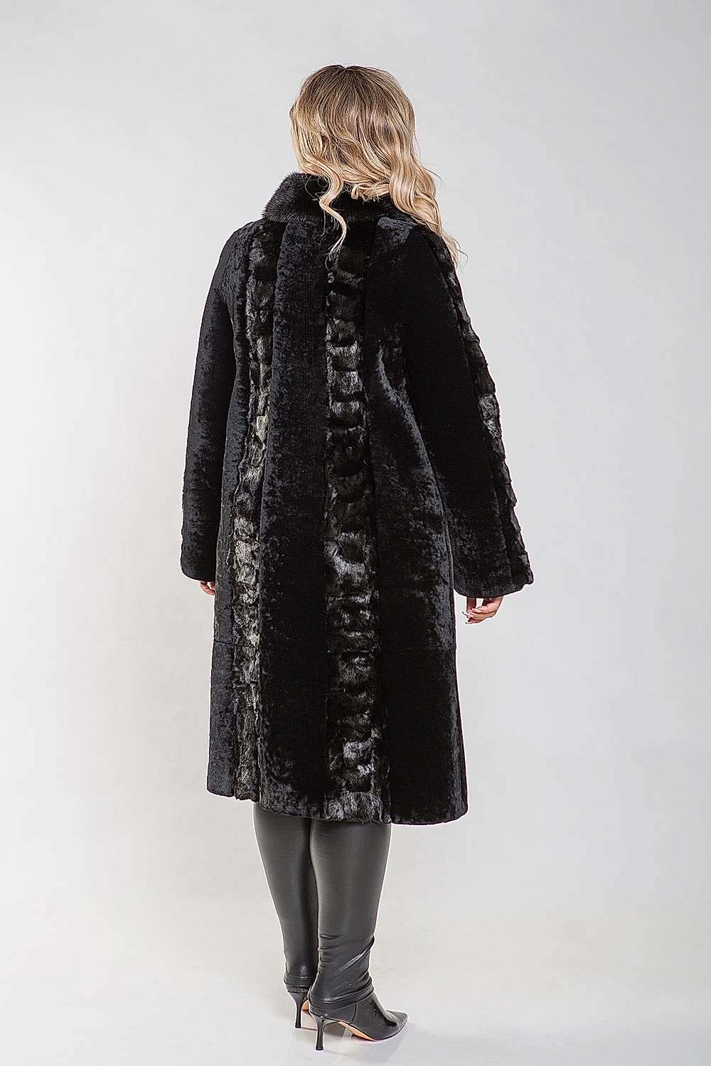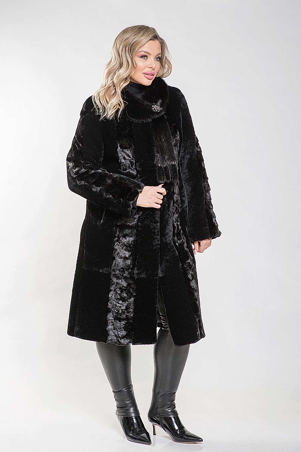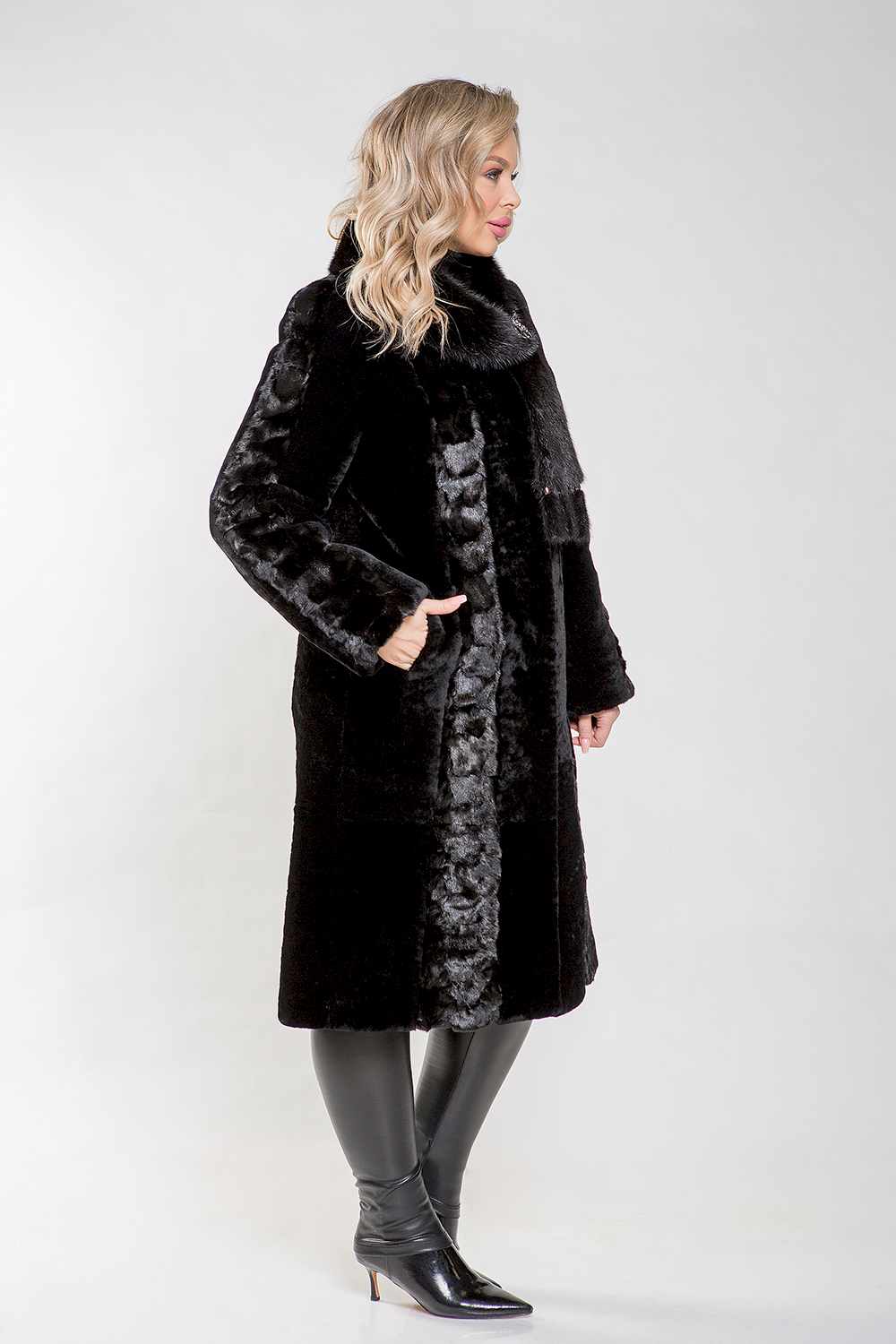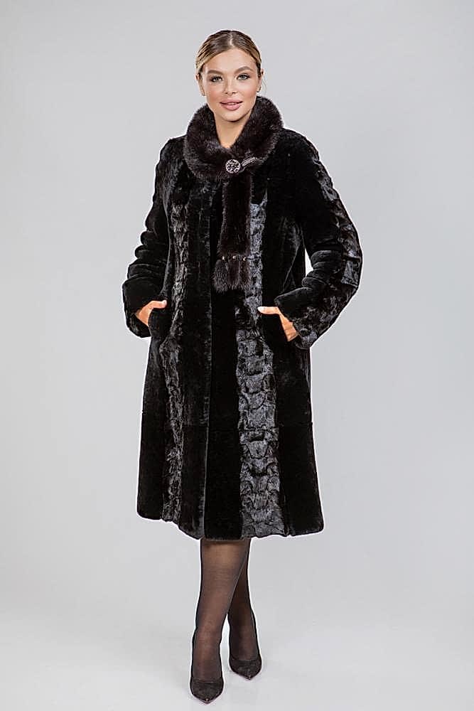 Полупальто, выполненное из меха овчины, станет отличным выбором для ценителей элегантного классического стиля. Воротник украшен мехом норки и надежно фиксируется с помощью Pin-Up клипсы. Длина изделия составляет 110 см, что обеспечивает удобство в носке. Шубка также декорирована вставками из меха норки, что придает ей особый шарм. Рукава модели можно подворачивать, создавая эффектные манжеты. Эта модель обязательно понравится ценительницам безупречного стиля!