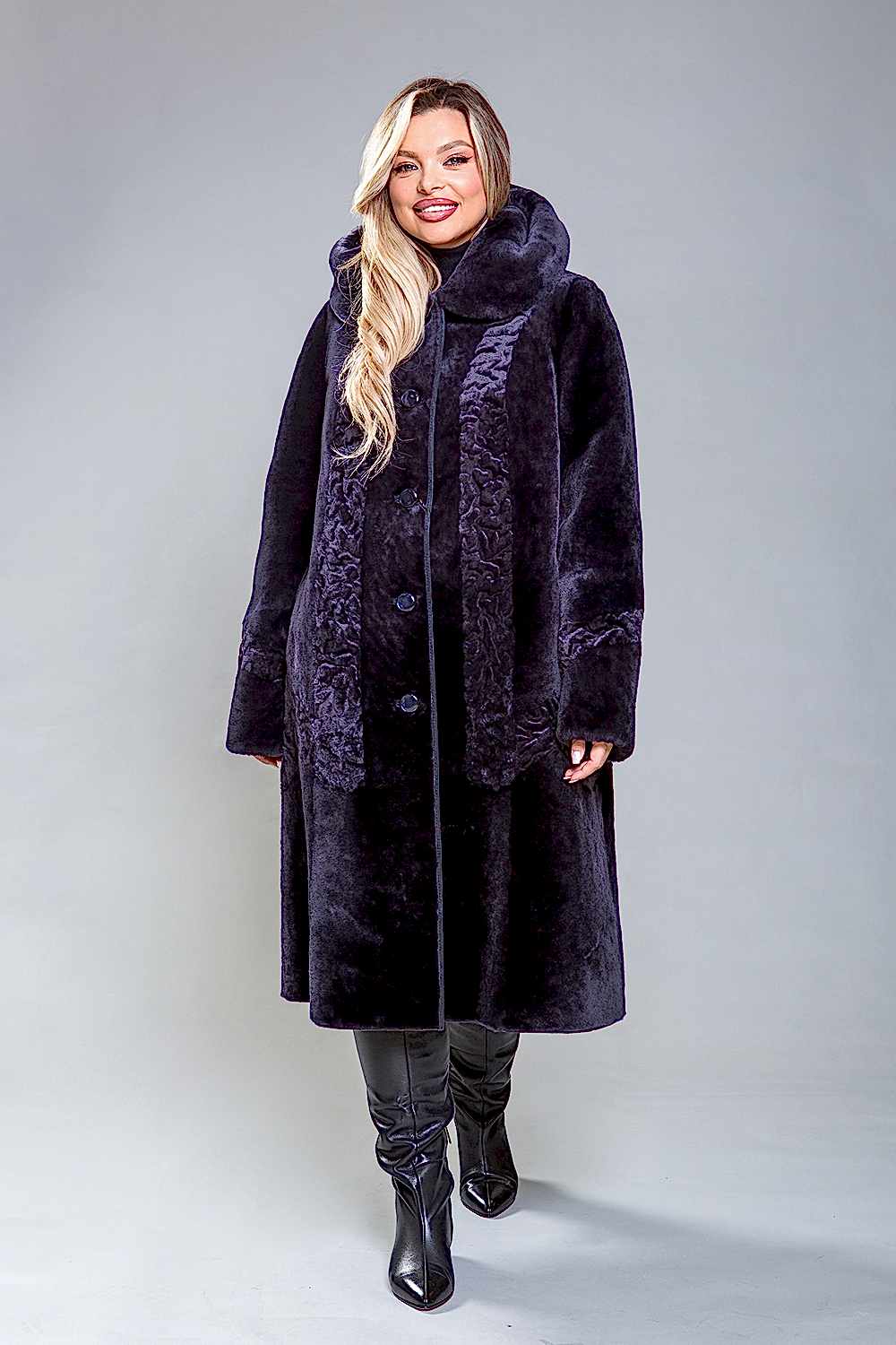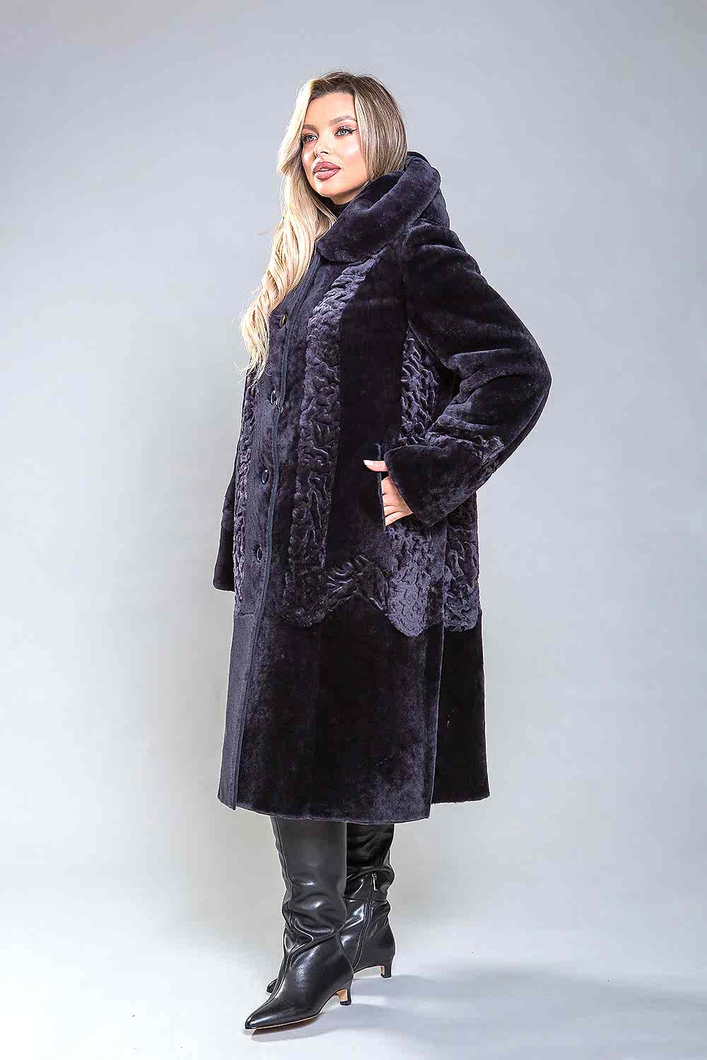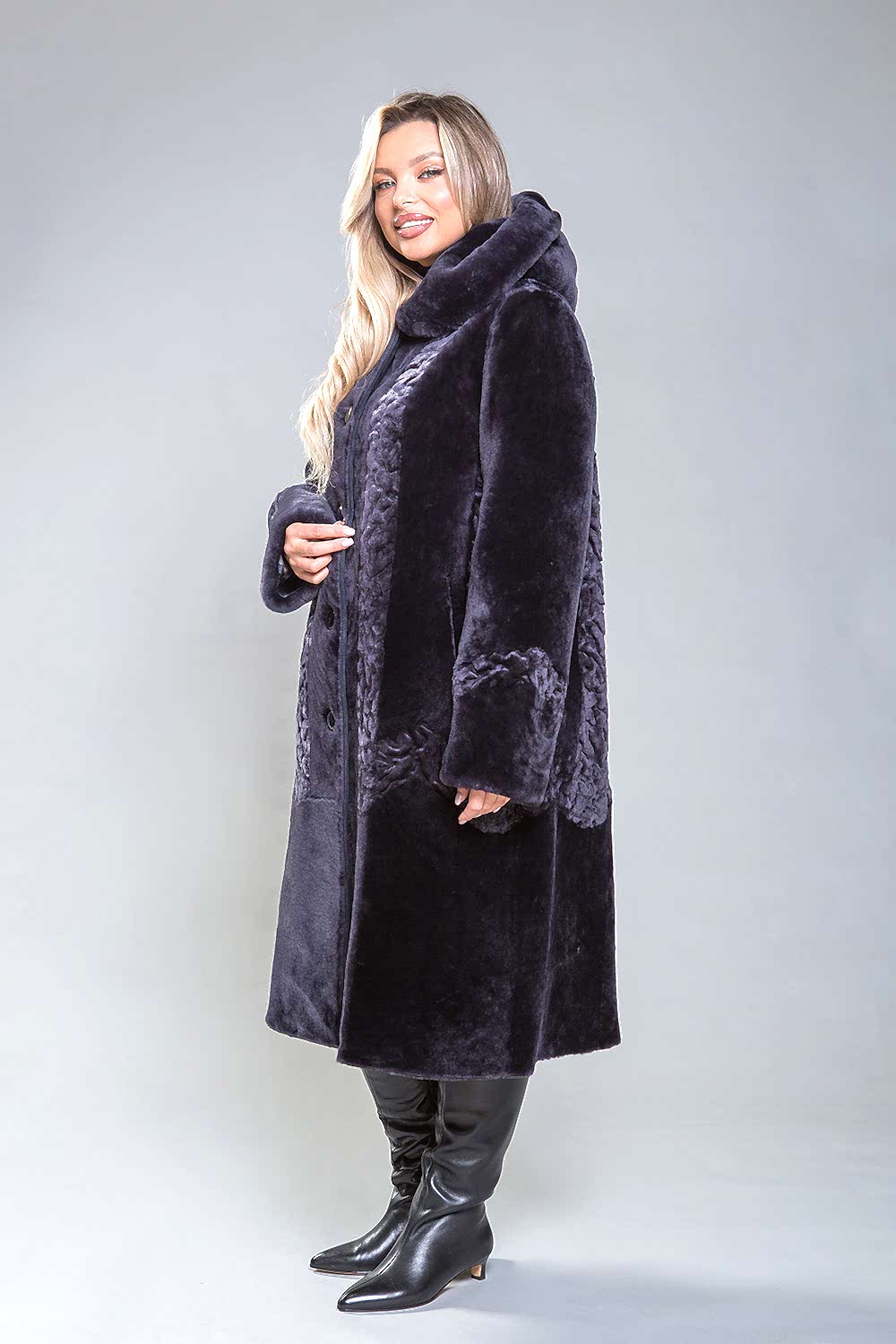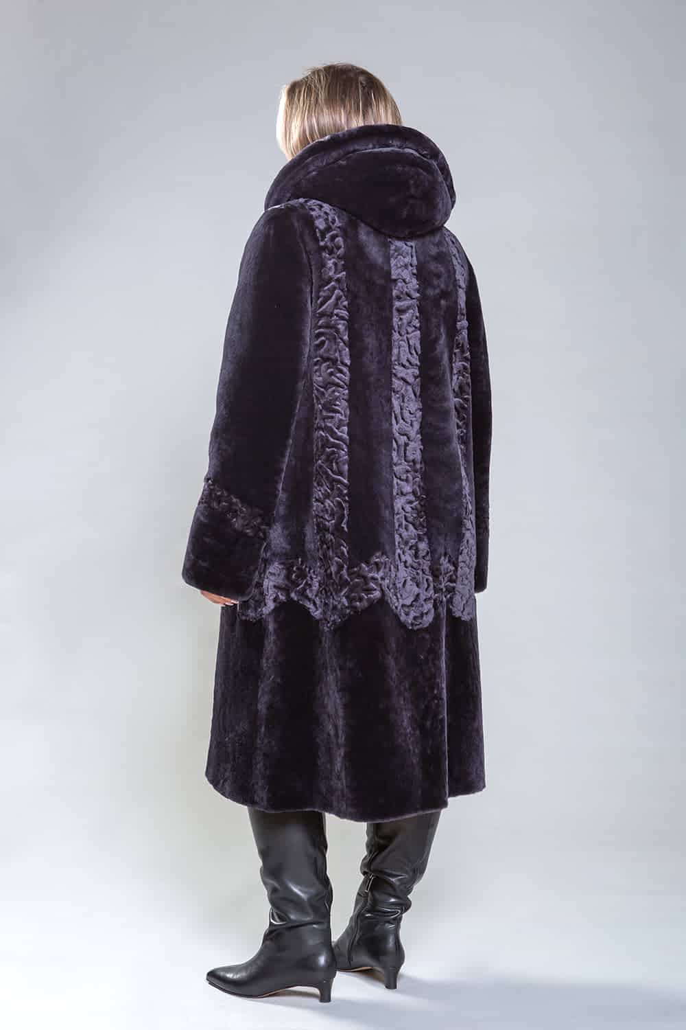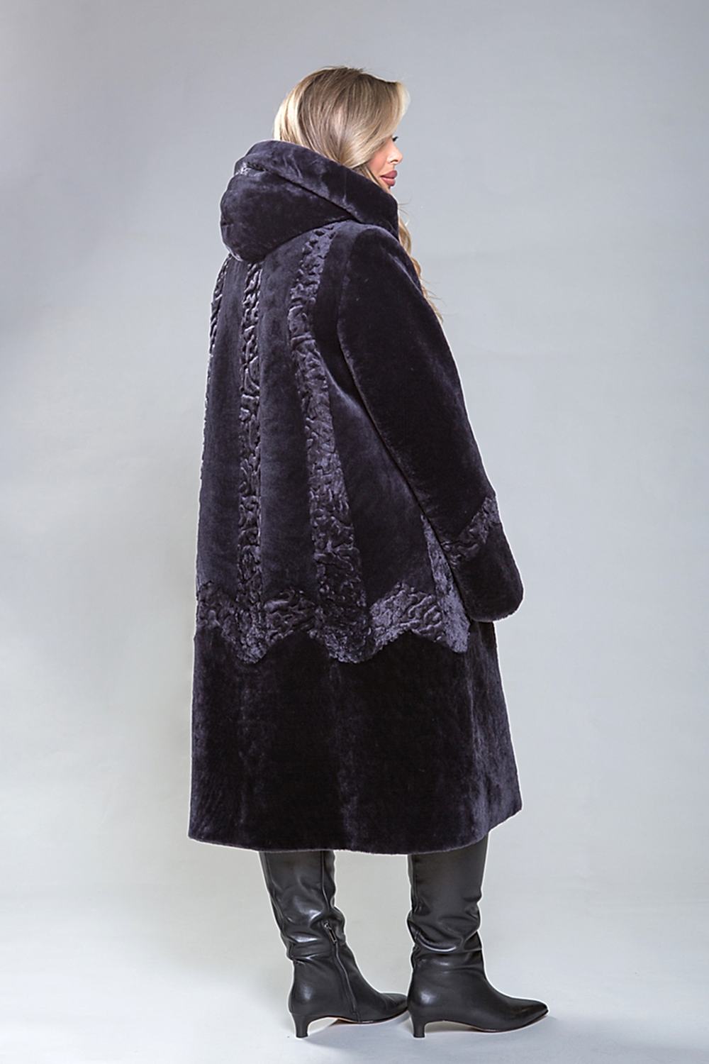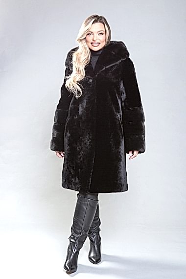 Полупальто из натуральной овчины с капюшоном, украшенное декоративной узорной выстрижкой. Узор выполнен вертикально и расположен как спереди, так и сзади. Застежка - пуговицы. Карманы и борта изделия сделаны из натуральной замши. Модель современного фасона визуально уменьшает объемы и Pin-Up проблемные зоны. Длина полупальто - 110 см. Оно легкое, уютное и комфортное.