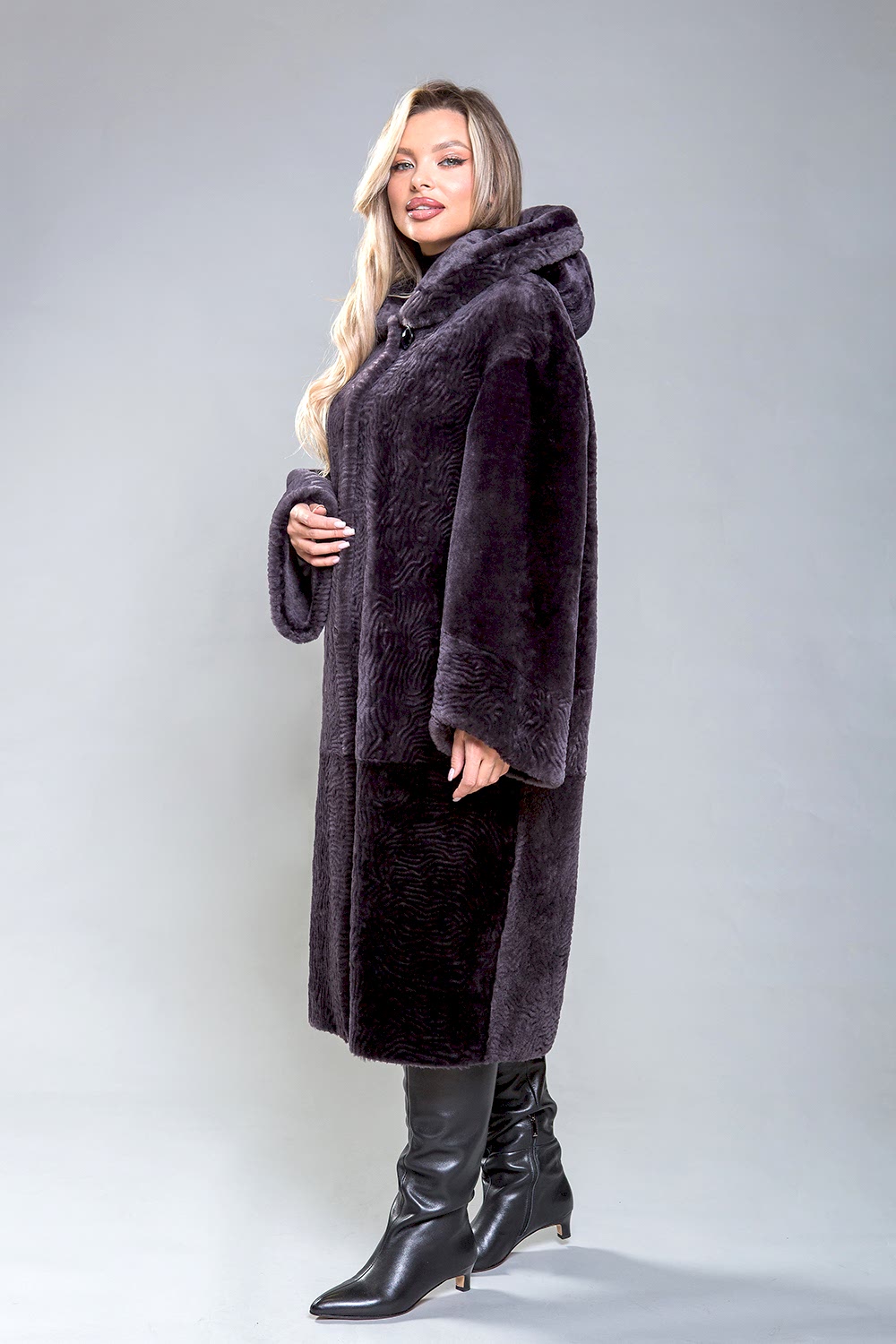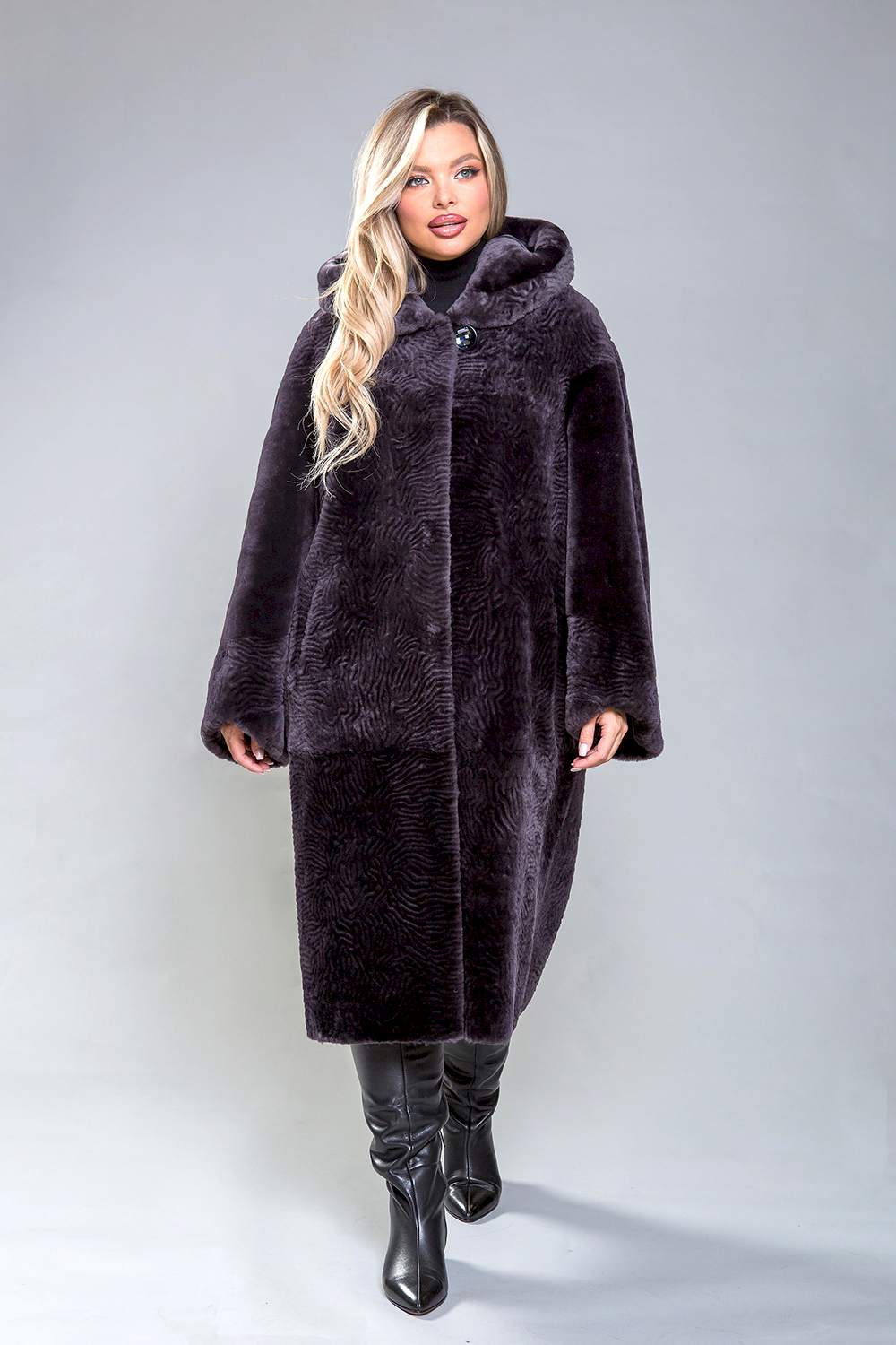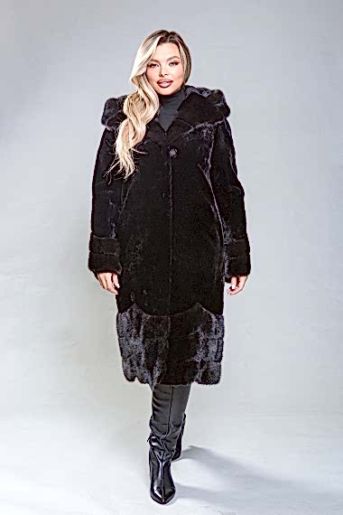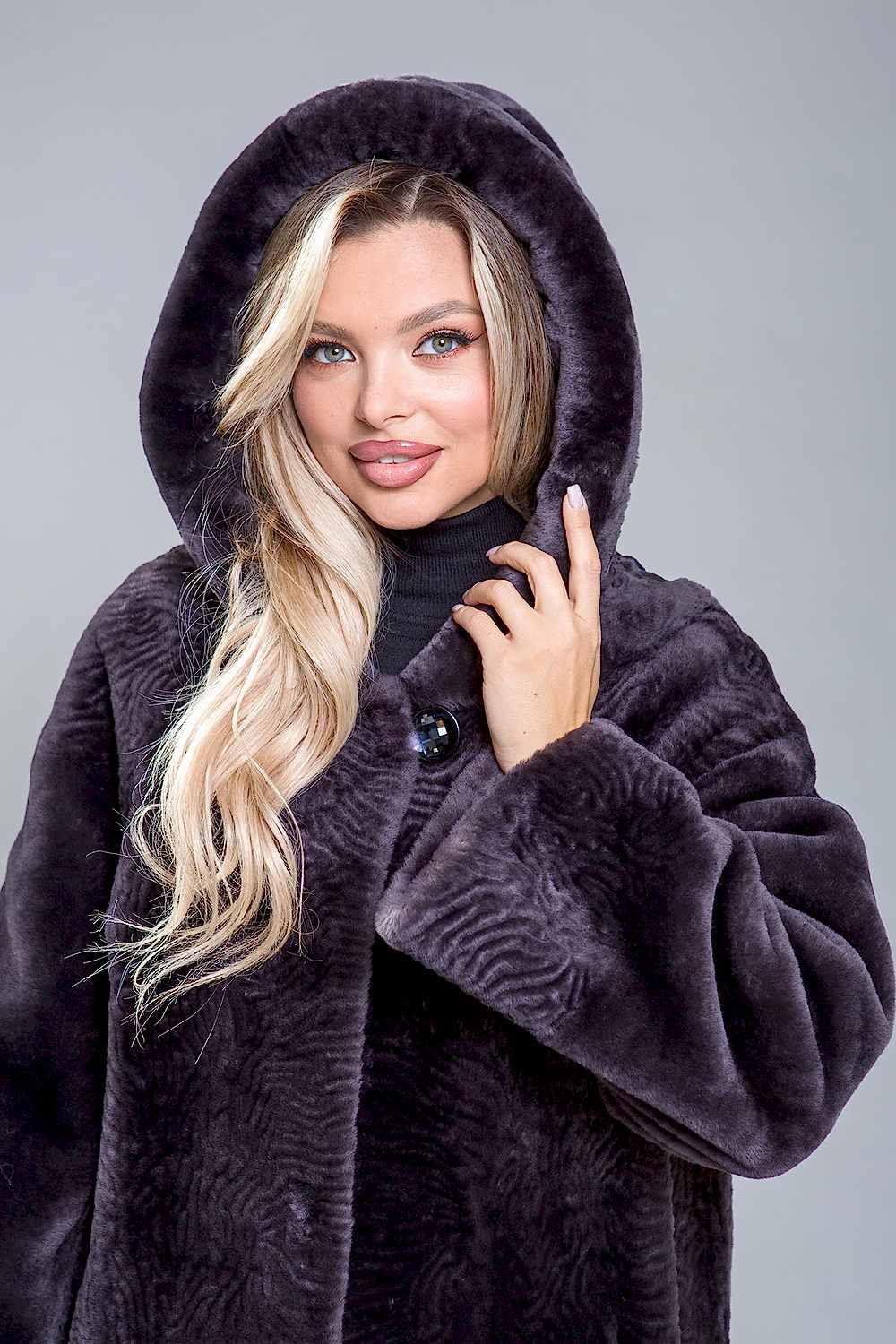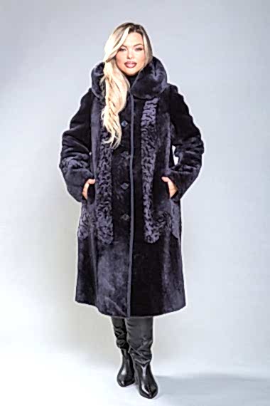Полупальто из натуральной овчины с капюшоном украшено декоративной узорной выстрижкой, которая покрывает всю поверхность изделия. Капюшон фиксируется с помощью декоративной пуговицы, а само полупальто - на клипсах. Карманы и боковые вставки выполнены из натуральной замши. Модель современного кроя визуально уменьшает объемы и Pin-Up недостатки фигуры. Длина полупальто составляет 115 с
