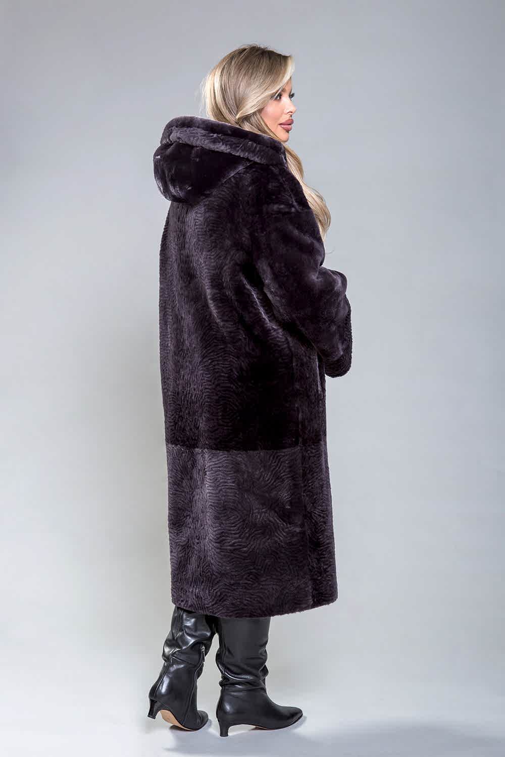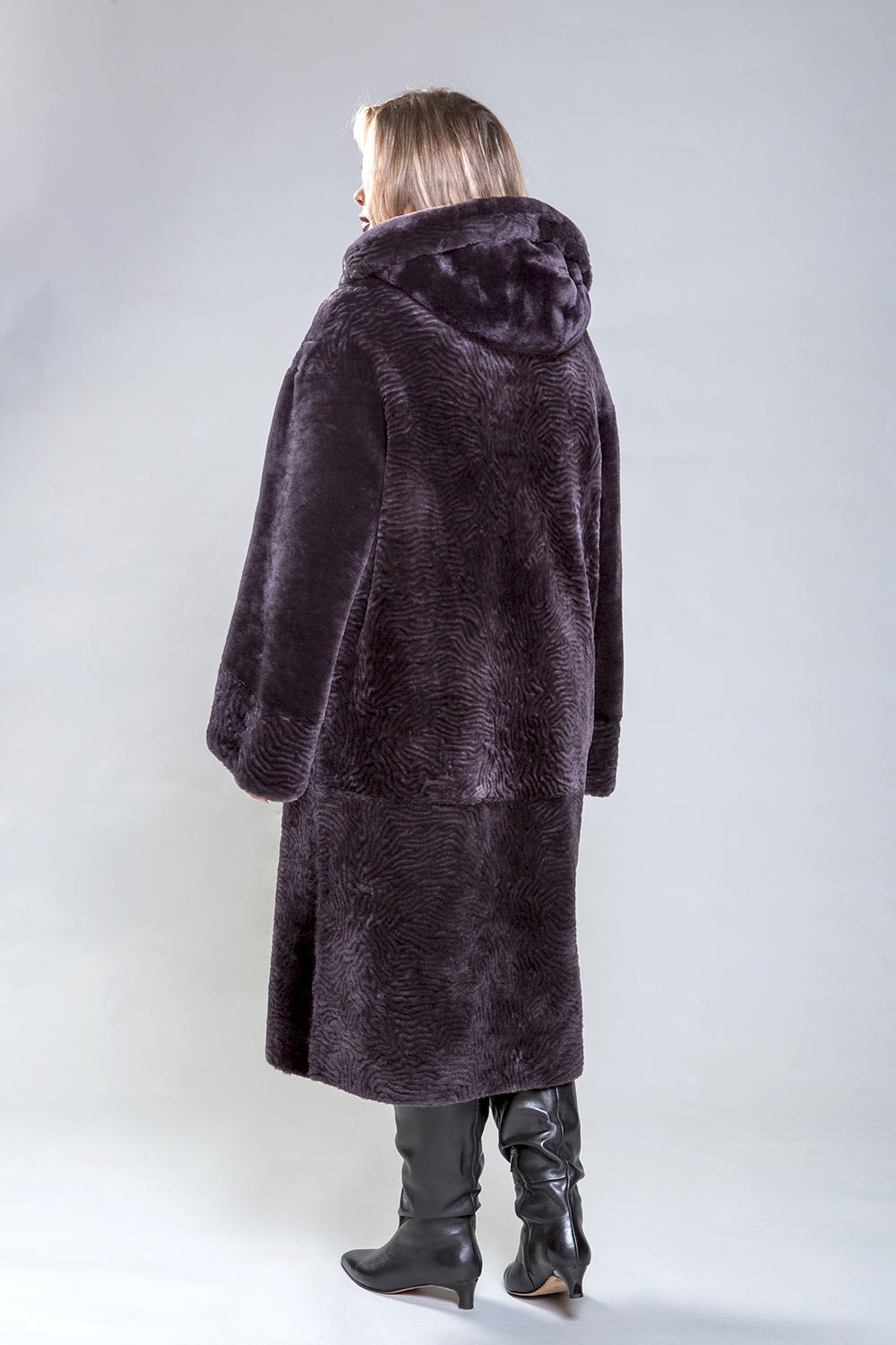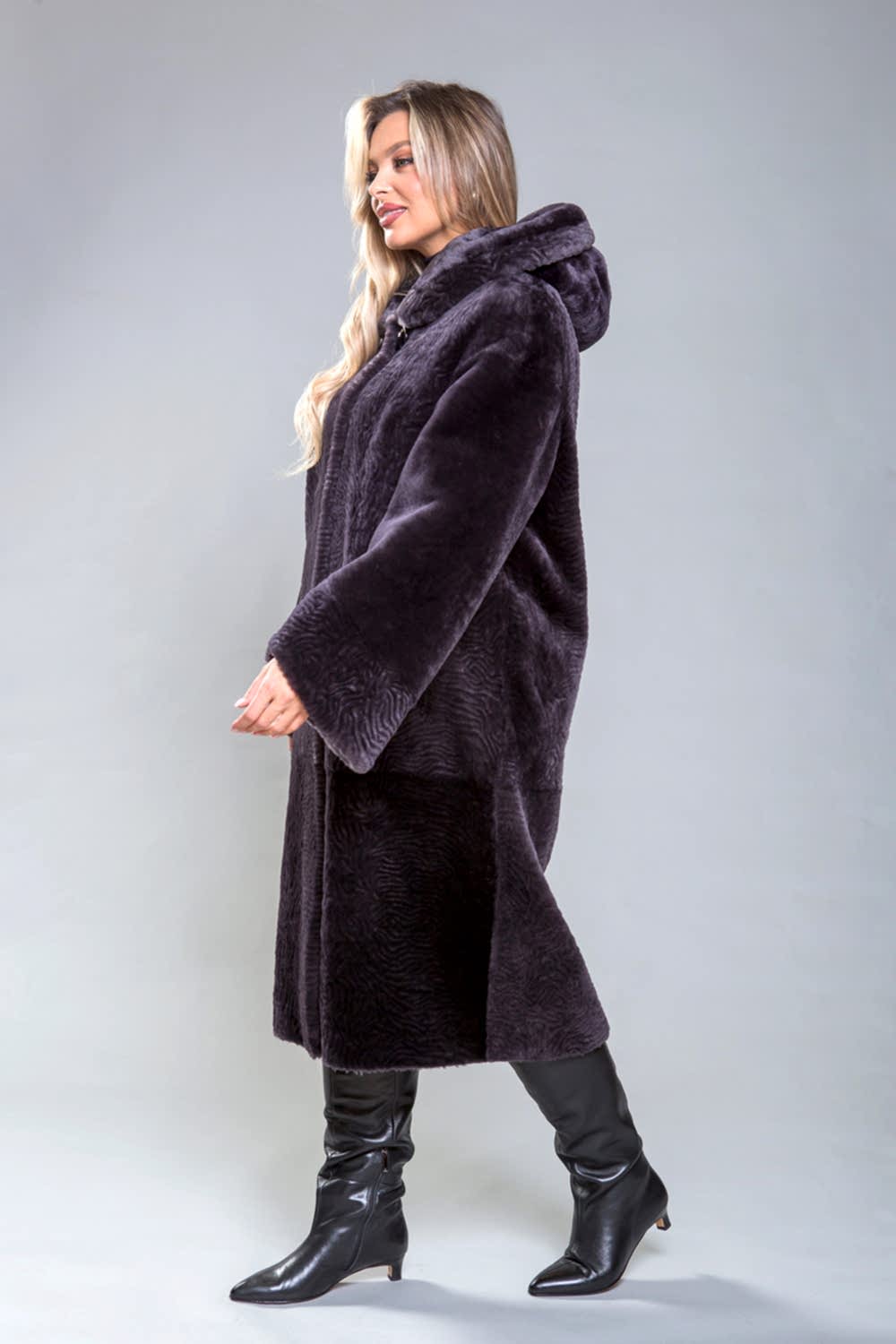 Полупальто из натуральной овчины с капюшоном украшено декоративной узорной выстрижкой, которая покрывает всю поверхность изделия. Капюшон фиксируется с помощью декоративной пуговицы, а само полупальто - на клипсах. Карманы и боковые вставки выполнены из натуральной замши. Модель современного кроя визуально уменьшает объемы и Pin-Up недостатки фигуры. Длина полупальто составляет 115 с