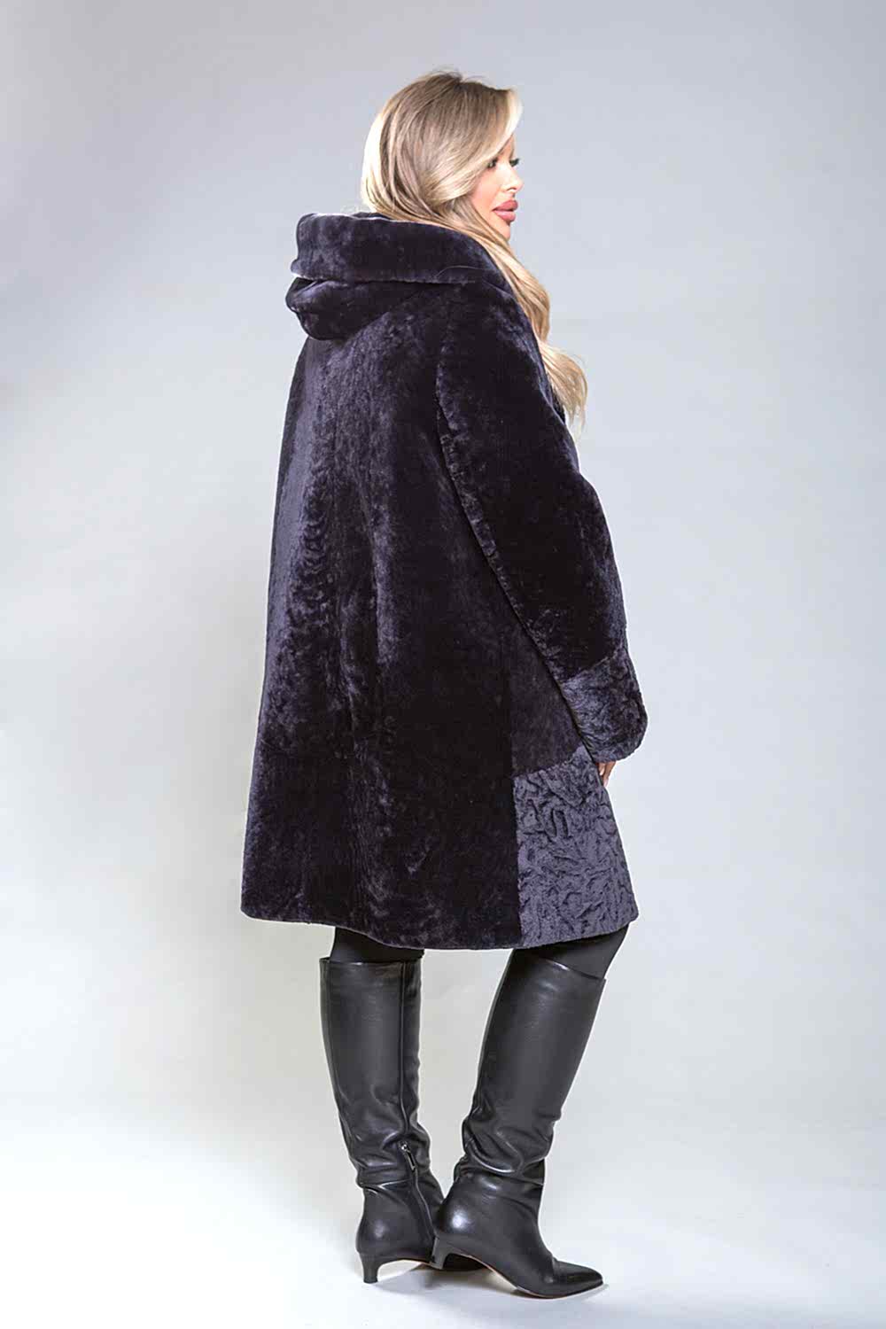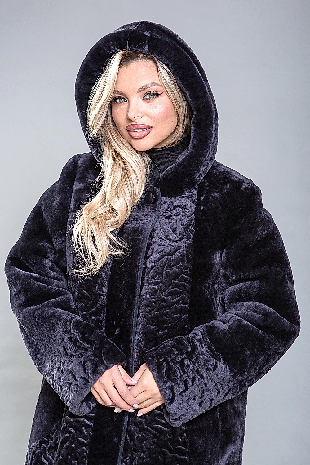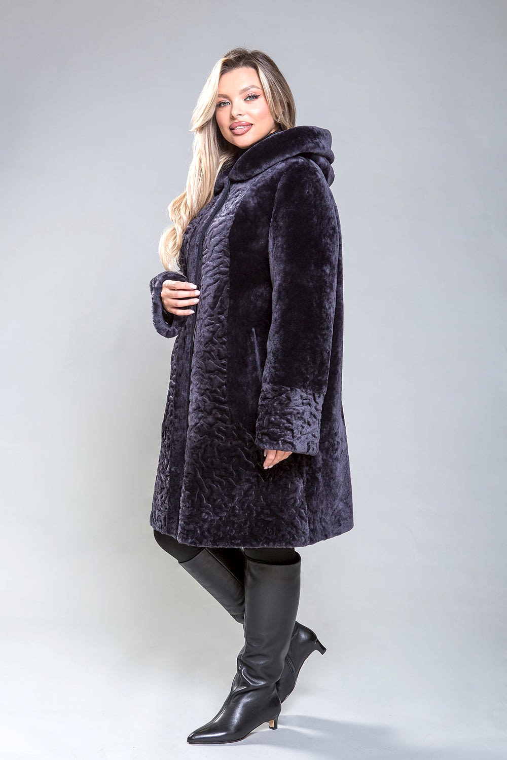 Полупальто из натуральной овчины с капюшоном и изысканной выстрижкой. На передней части и по кромке рукавов расположены геометрические узоры, выполненные в вертикальной композиции. Капюшон надежно крепится пуговицей, а само полупальто фиксируется клипсами. Карманы и борта модели изготовлены из натуральной замши. Современная посадка изделия визуально корректирует фигуру, скрывая недостатки. Длина полупальто составляет 100 см, что обеспечивает идеальную посадку на любой тип фигуры, подчеркивая стиль и элегантность.
