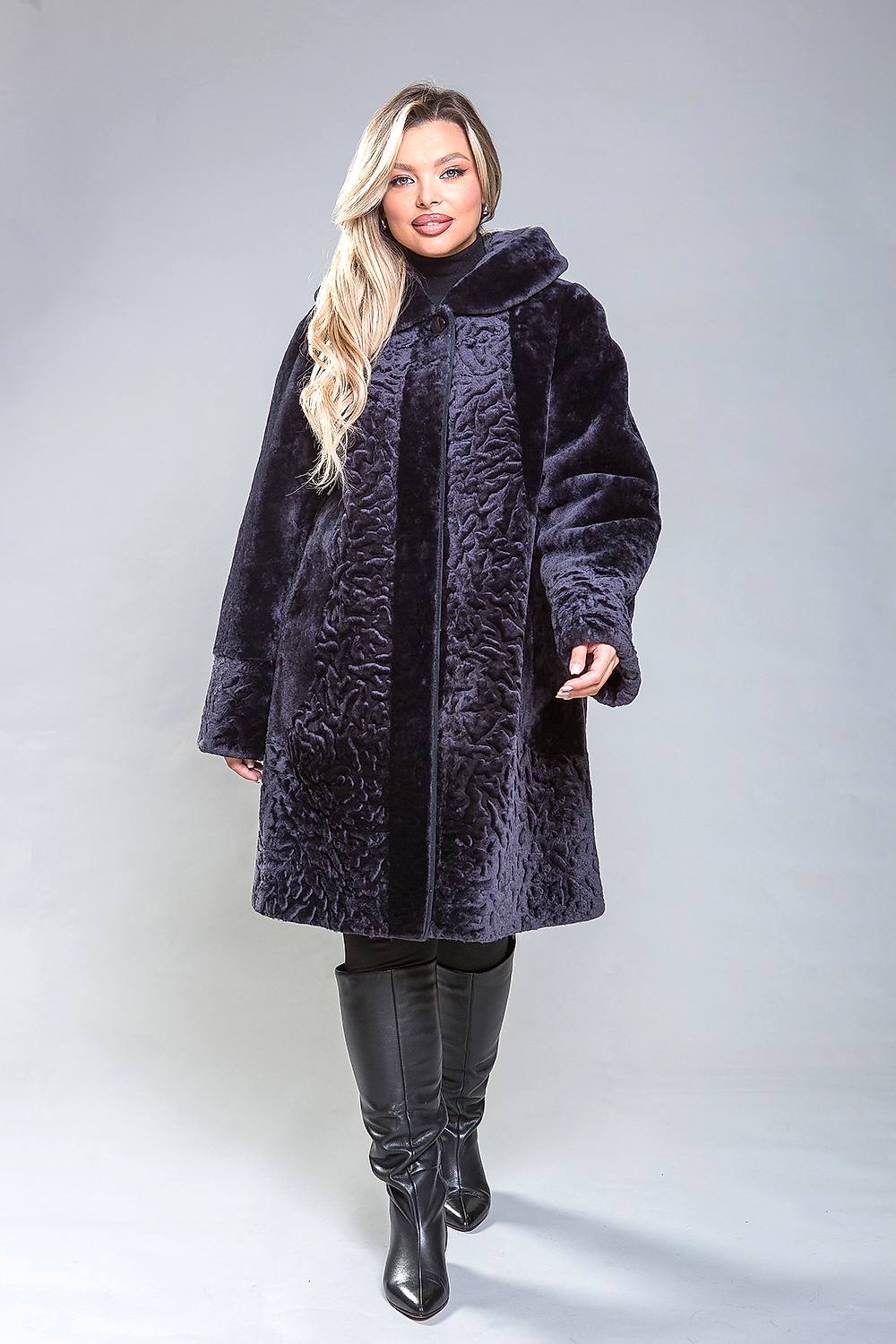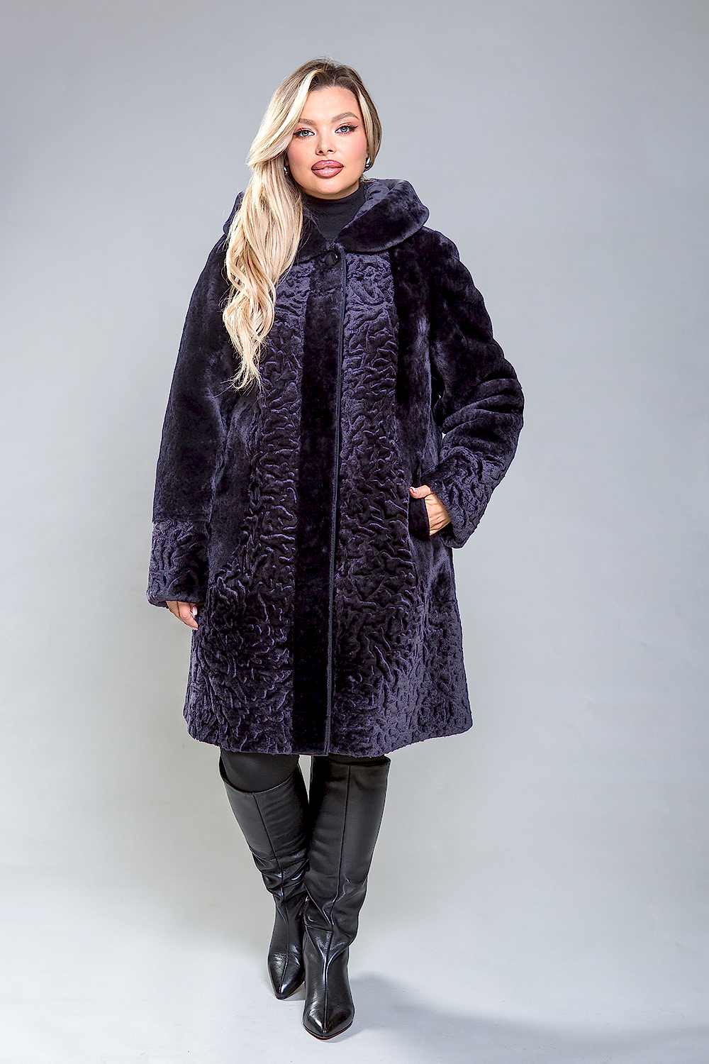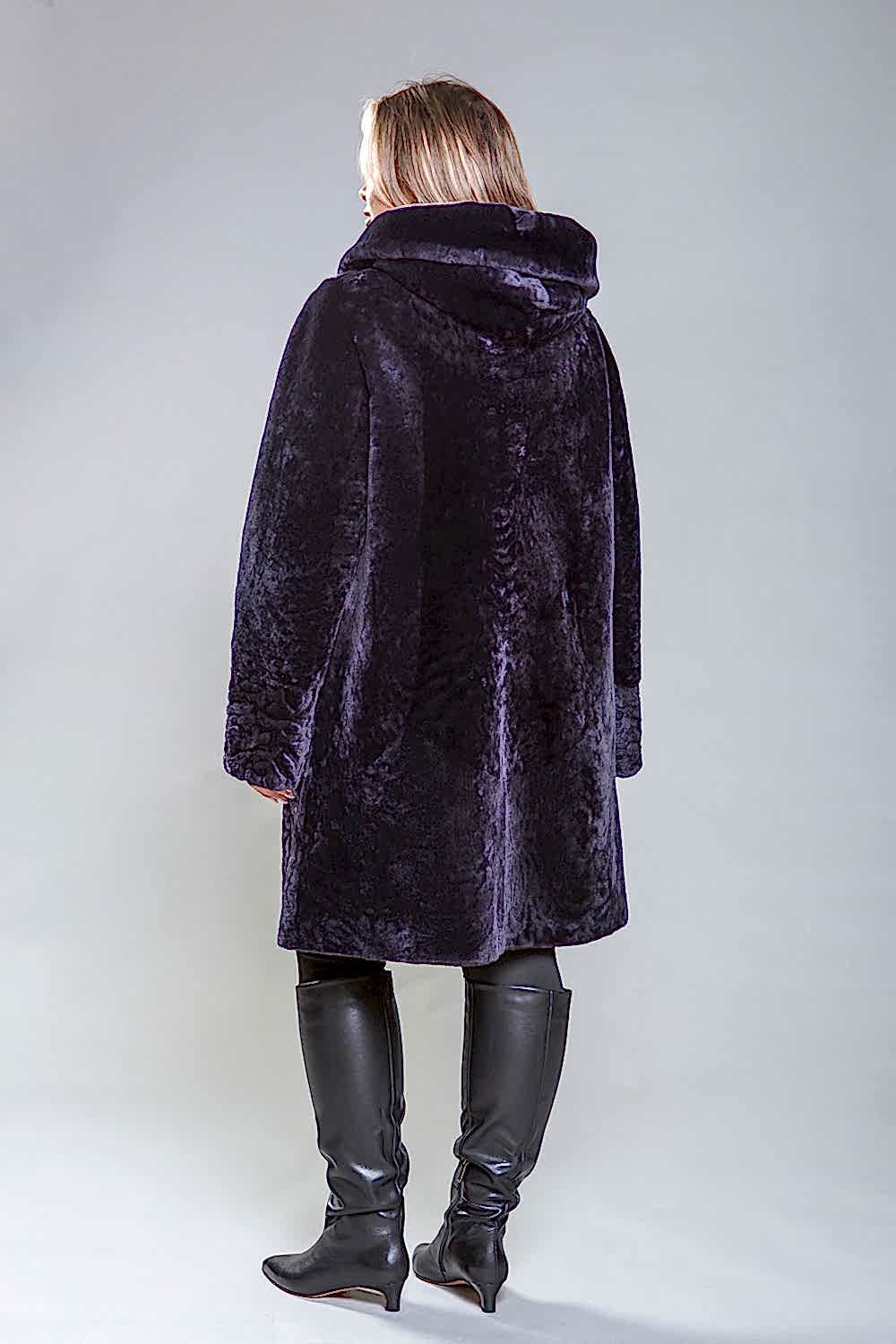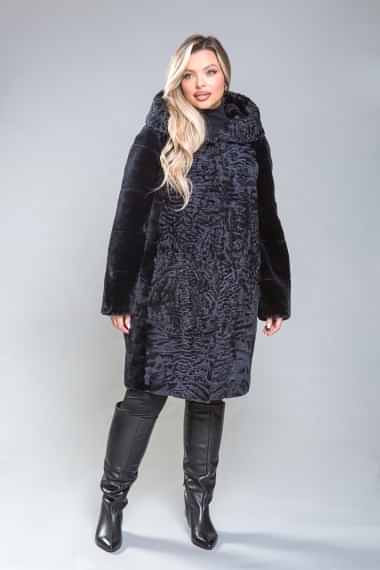 Полупальто из натуральной овчины с капюшоном и изысканной выстрижкой. На передней части и по кромке рукавов расположены геометрические узоры, выполненные в вертикальной композиции. Капюшон надежно крепится пуговицей, а само полупальто фиксируется клипсами. Карманы и борта модели изготовлены из натуральной замши. Современная посадка изделия визуально корректирует фигуру, скрывая недостатки. Длина полупальто составляет 100 см, что обеспечивает идеальную посадку на любой тип фигуры, подчеркивая стиль и элегантность.
