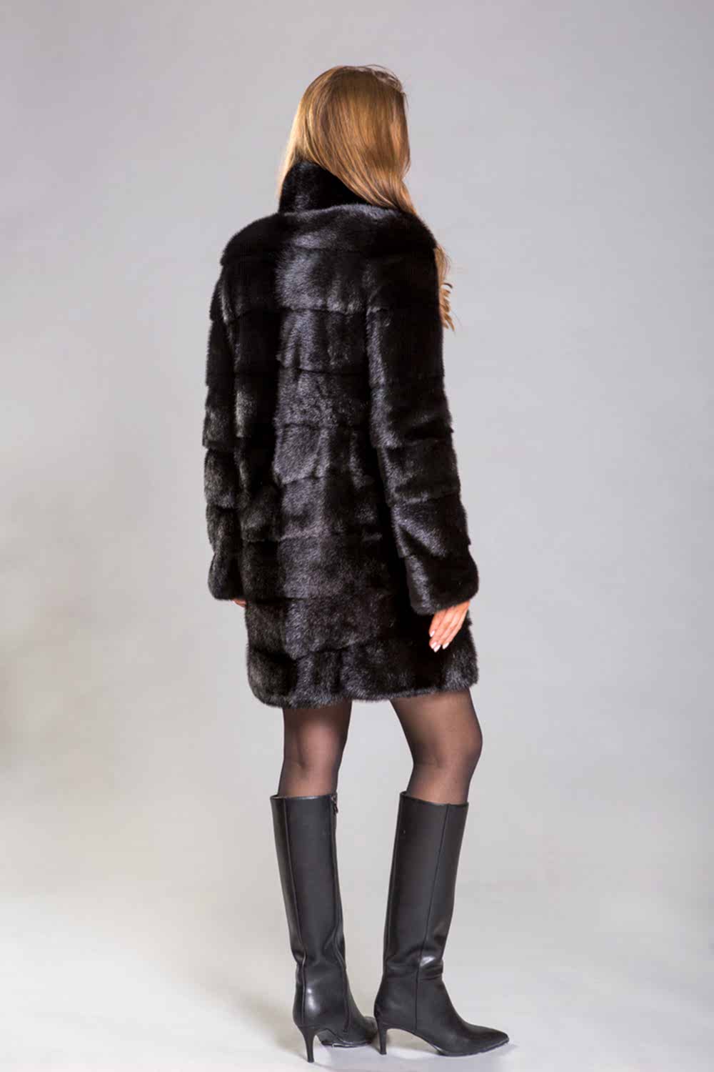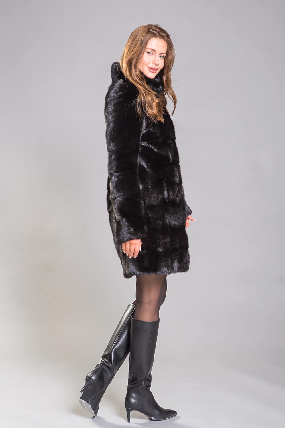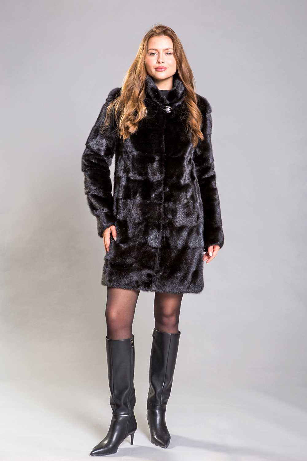 Полупальто из норки с воротником-стойкой - это модель, выполненная в технике поперечной выкладки пластин. Главная особенность этой шубки - отстегивающиеся рукава, что позволяет создавать разнообразные образы. Pin-Up оснащена регулируемыми утяжками на талии, рукавах и по низу изделия, что дает возможность моделировать лук и придавать ему нужный характер. Длина изделия составляет 90 с